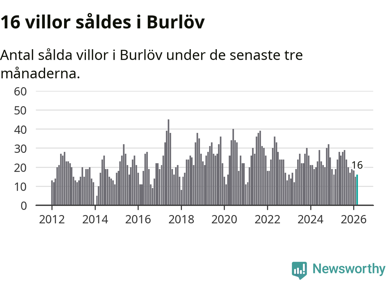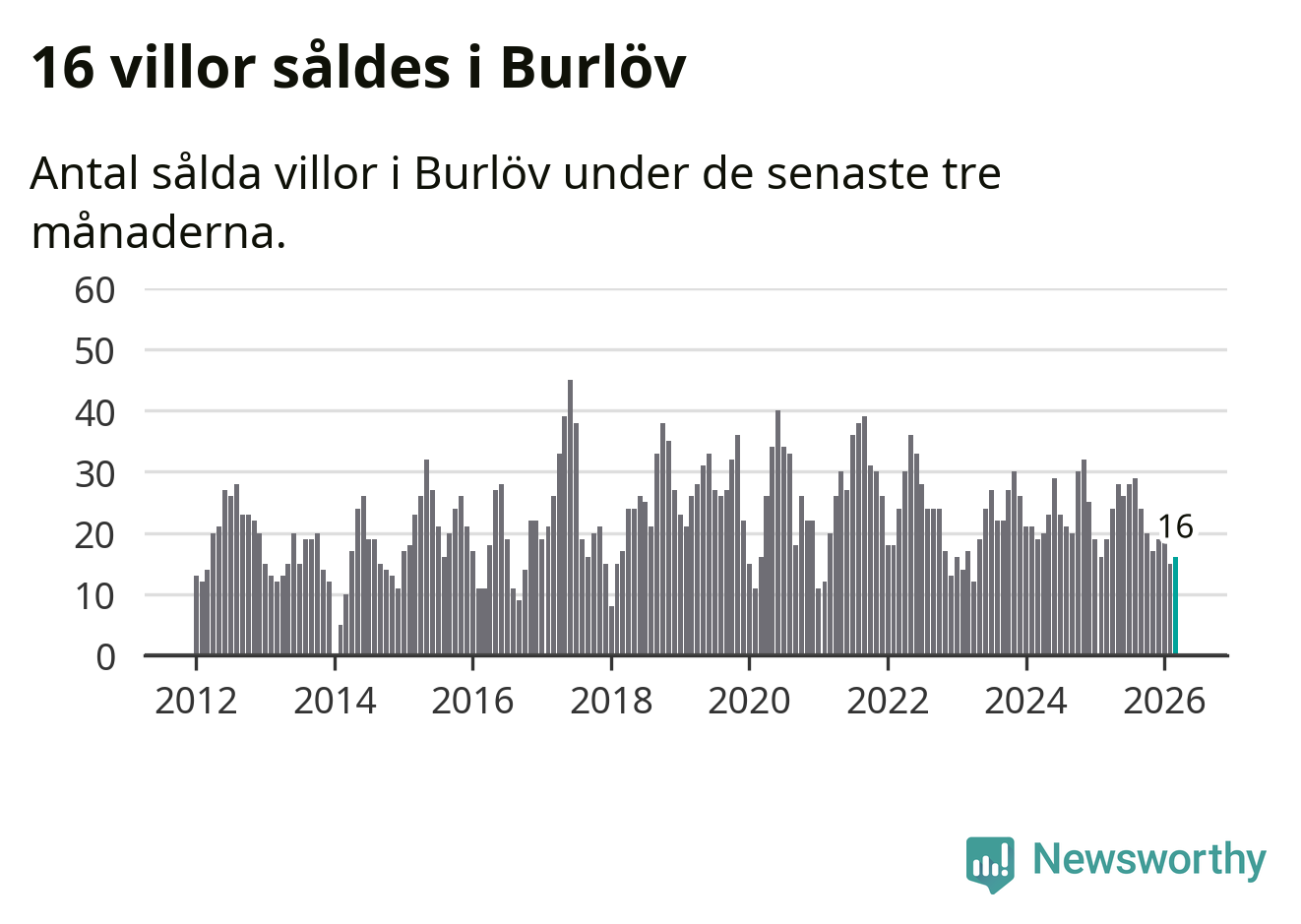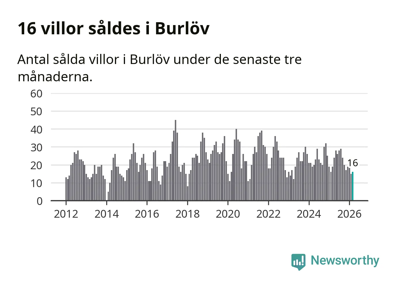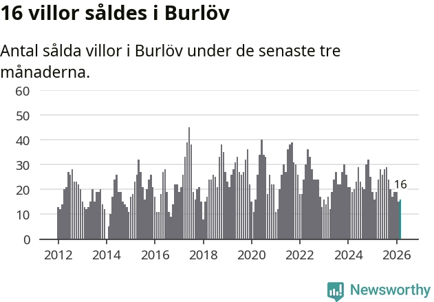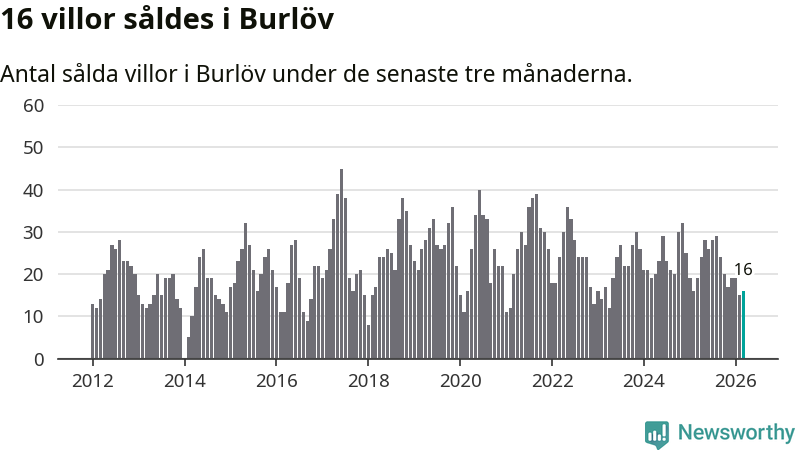 Mellan januari och mars gjordes sammanlagt 16 affärer med villor i Burlövs kommun. Det kan jämföras med 19 vid motsvarande tid i fjol.