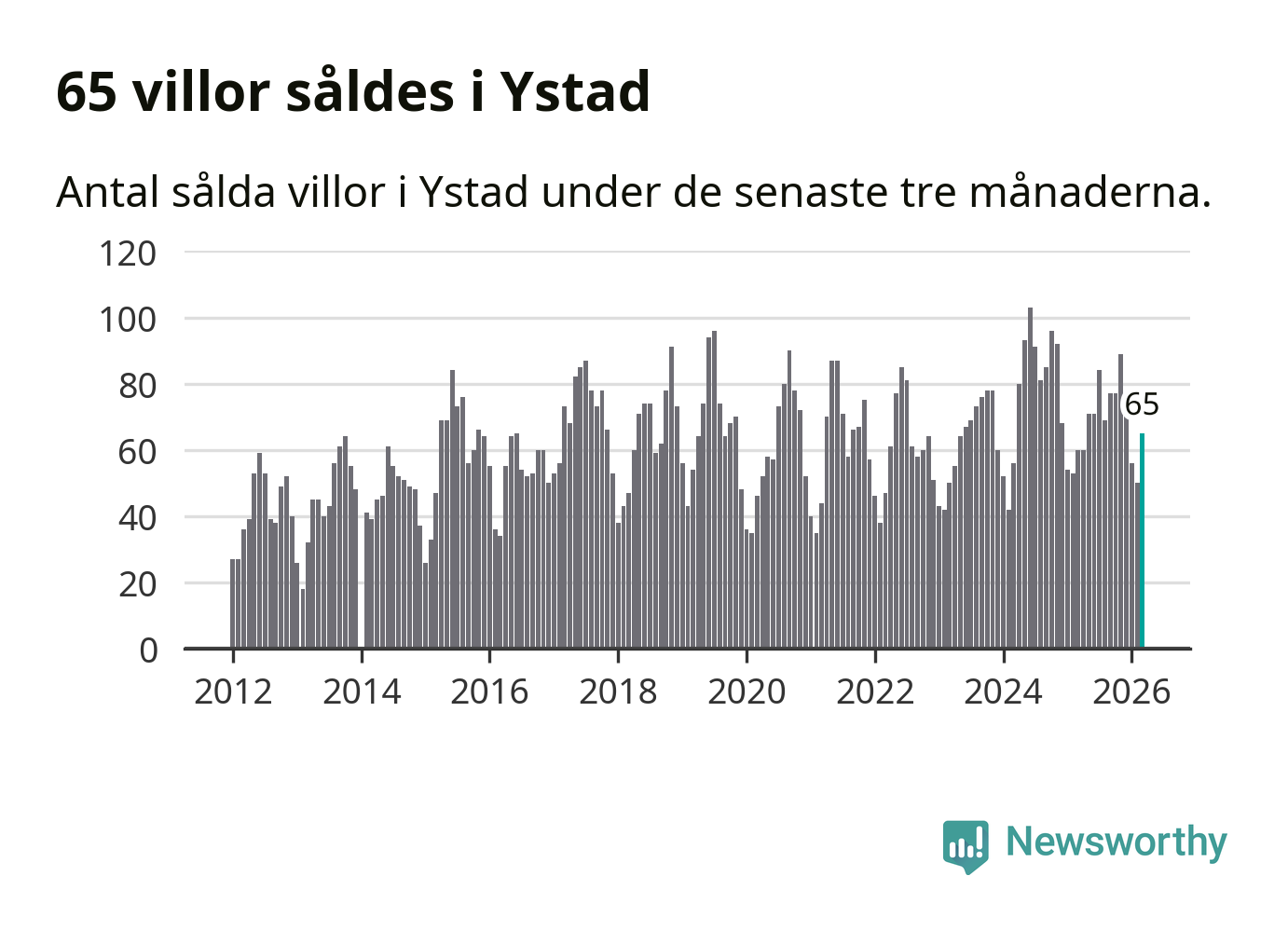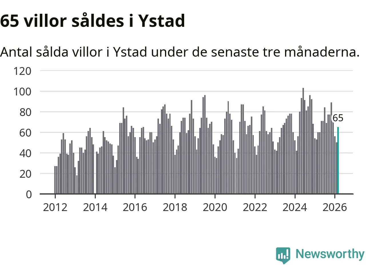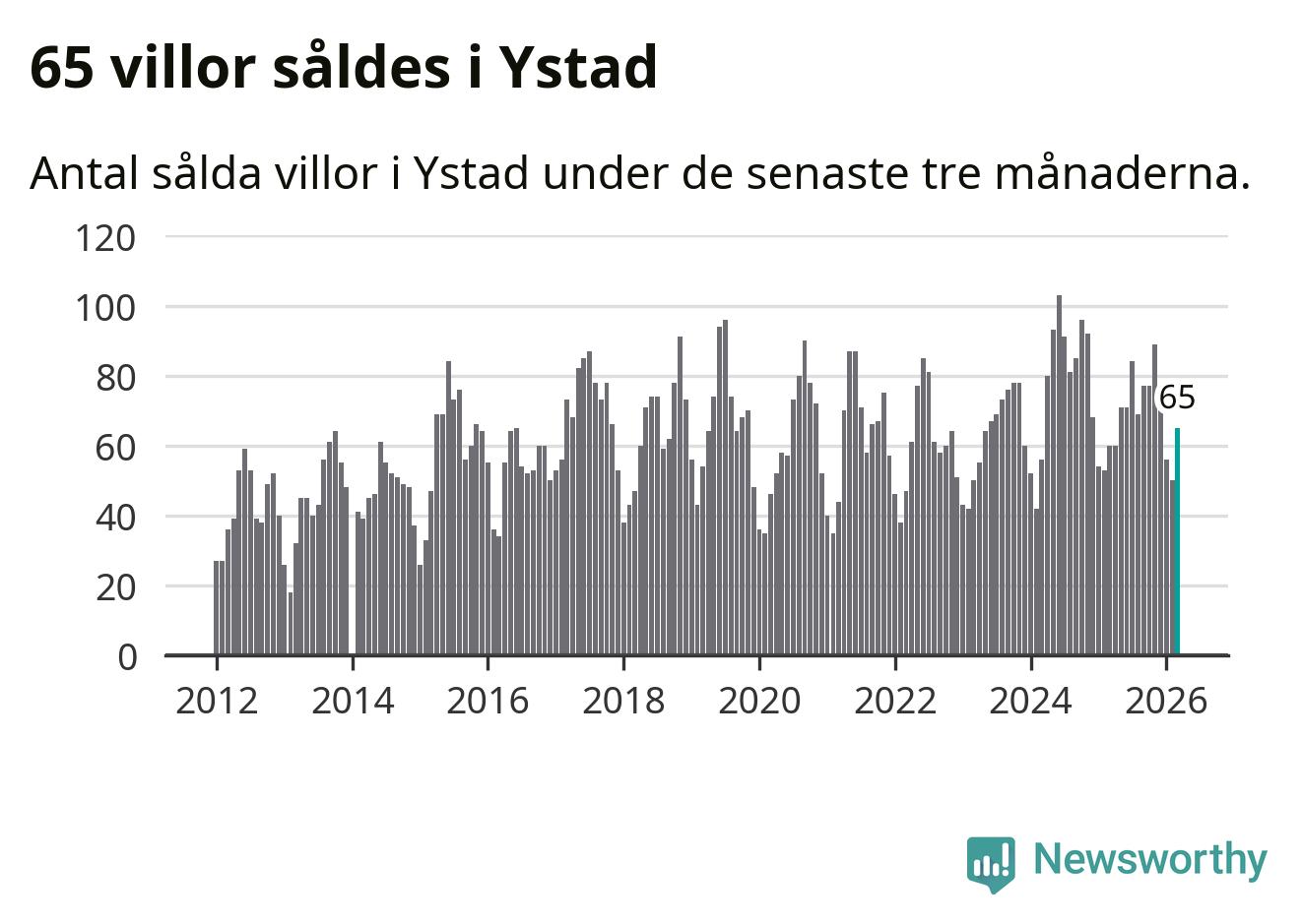Sammanlagt såldes 65 villor i Ystads kommun mellan januari och mars till ett genomsnittligt pris på 4,0 miljoner kronor. I fjol gjordes 60 affärer vid den här tiden på året.