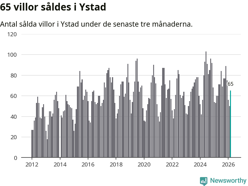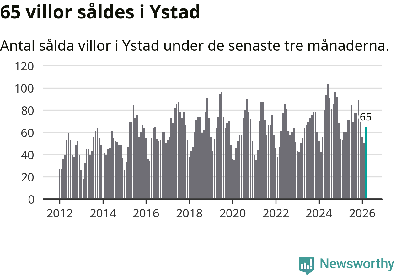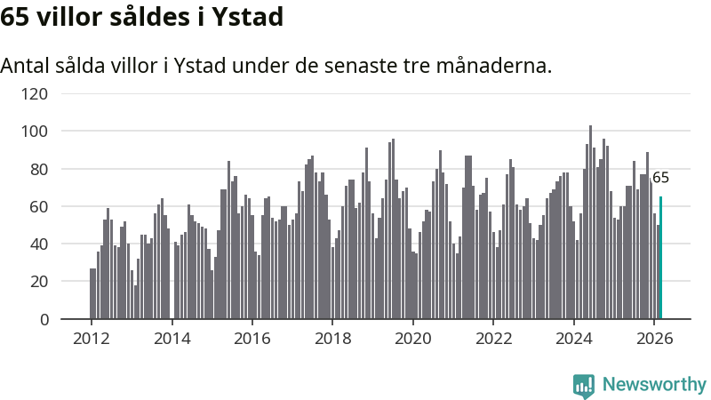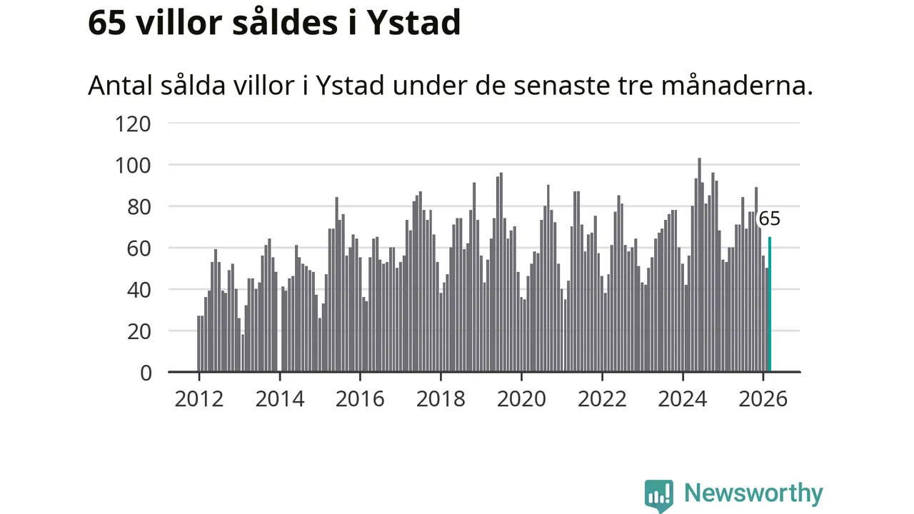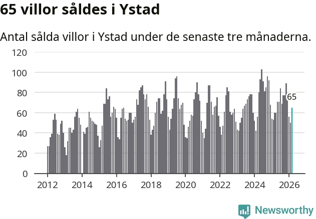 Sammanlagt såldes 65 villor i Ystads kommun mellan januari och mars till ett genomsnittligt pris på 4,0 miljoner kronor. I fjol gjordes 60 affärer vid den här tiden på året.
