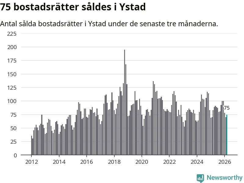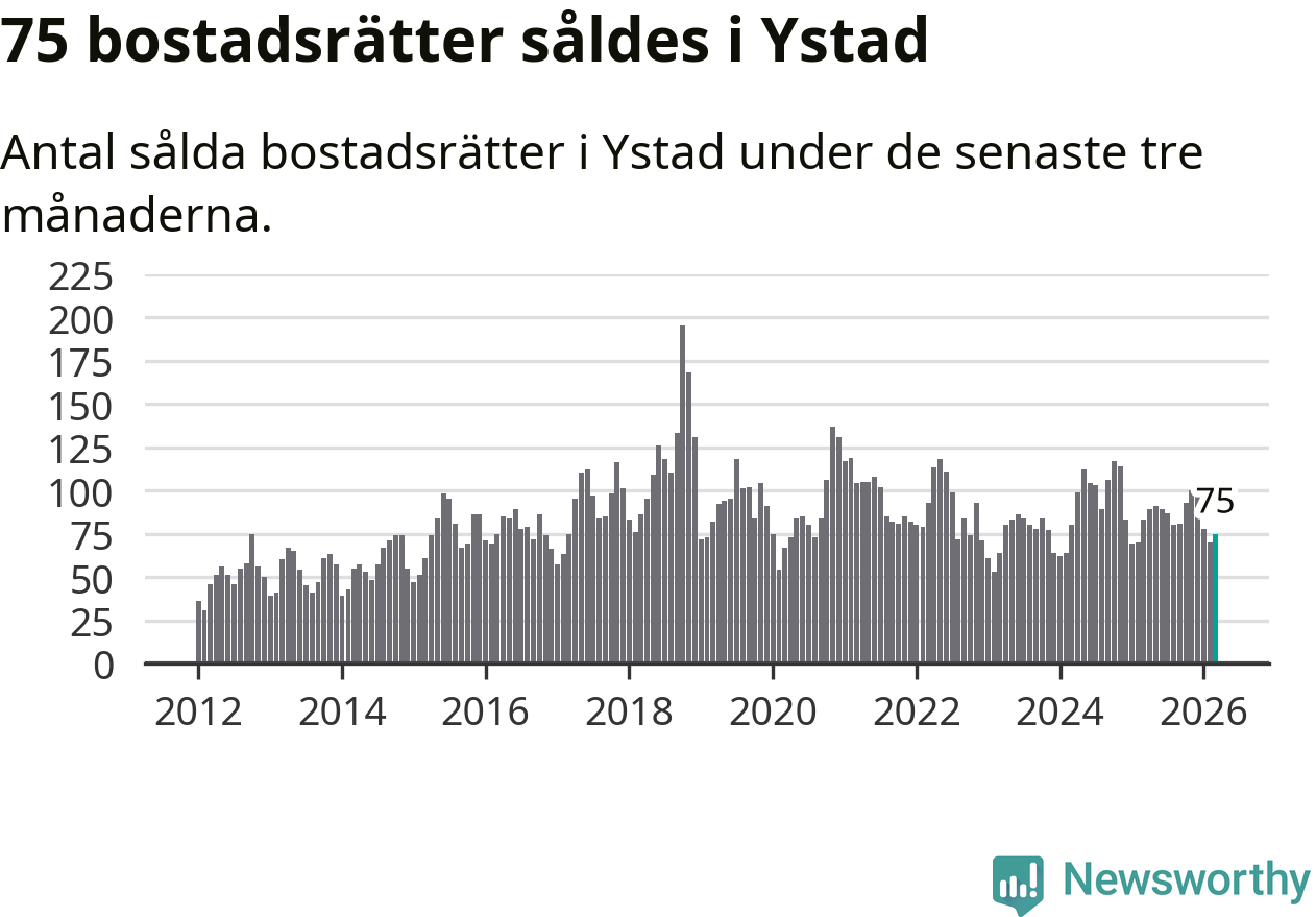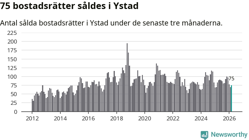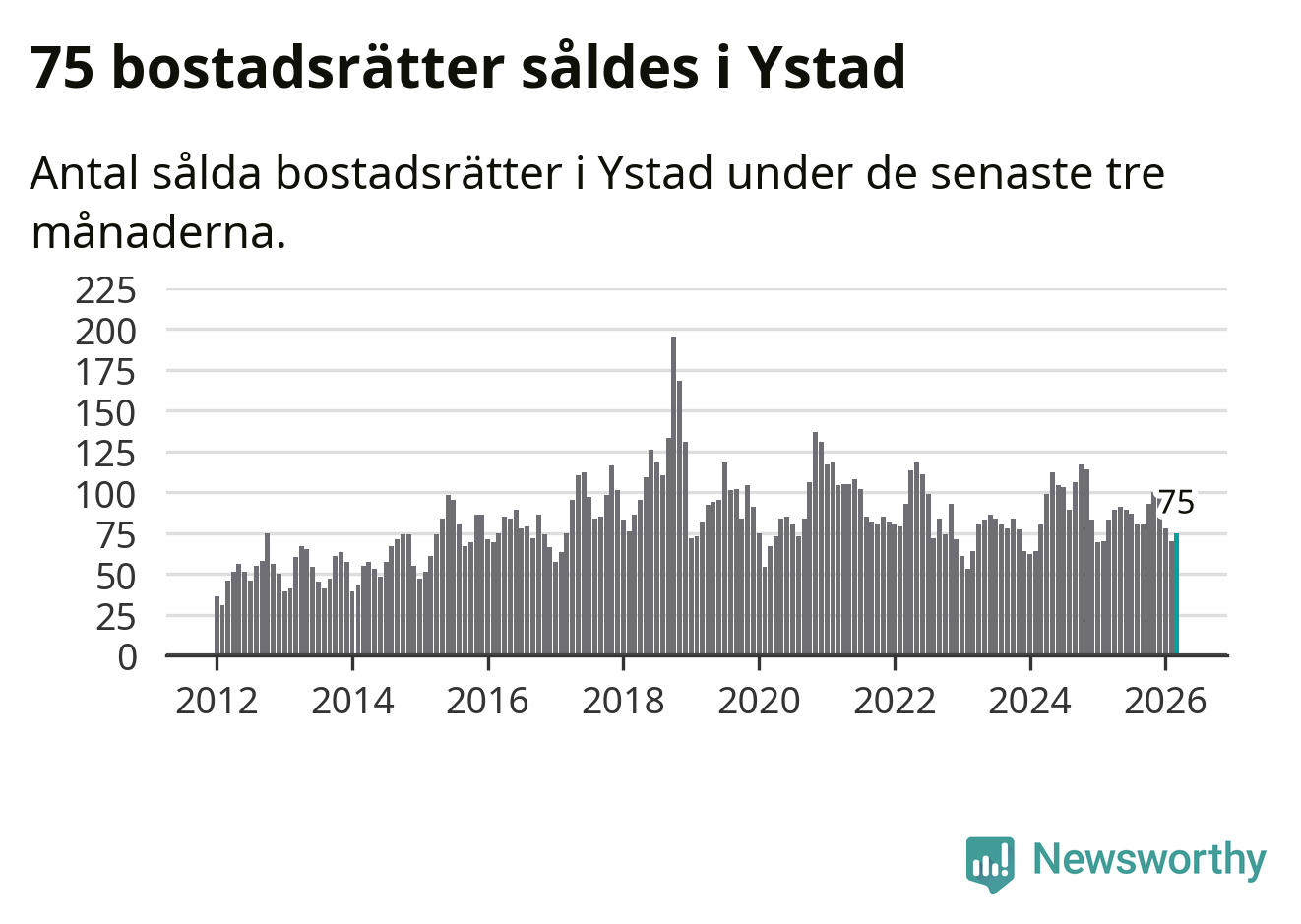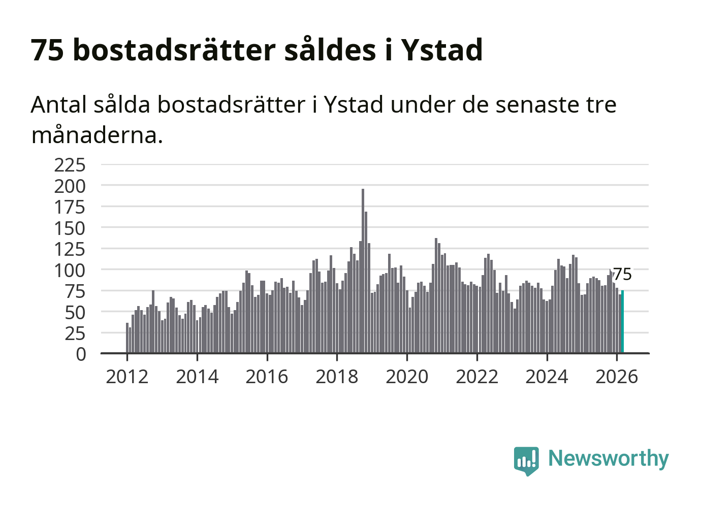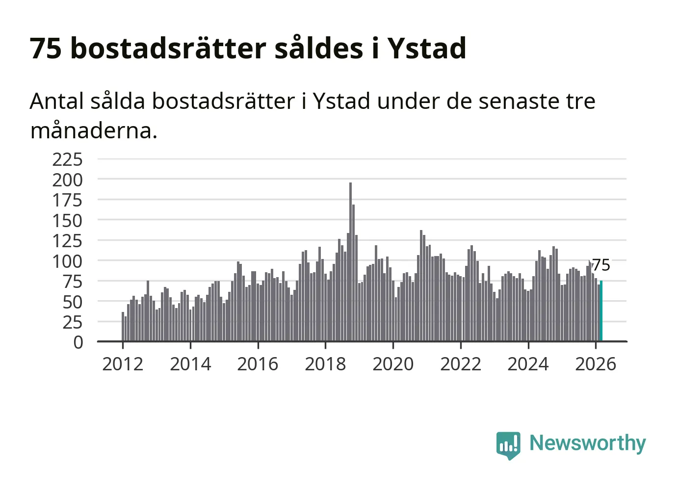 Sammanlagt såldes 75 bostadsrätter i Ystads kommun mellan januari och mars till ett genomsnittligt pris på 1,7 miljoner kronor. I fjol gjordes 83 affärer vid den här tiden på året.