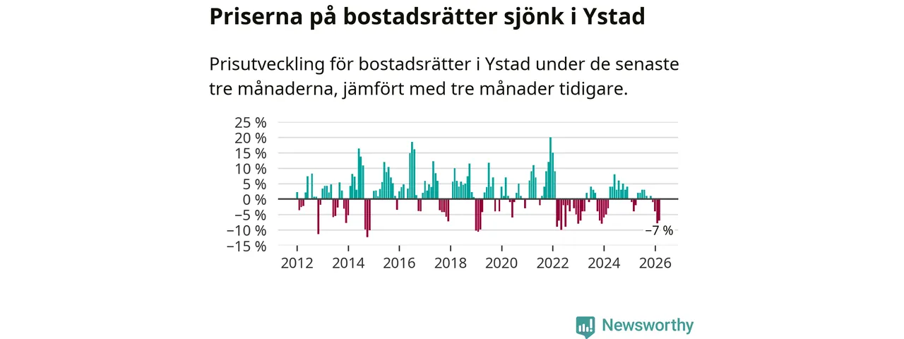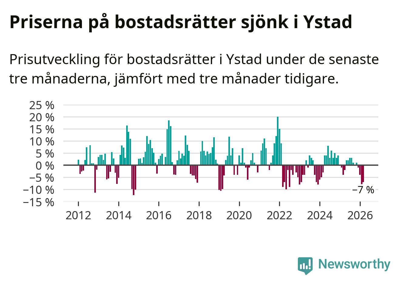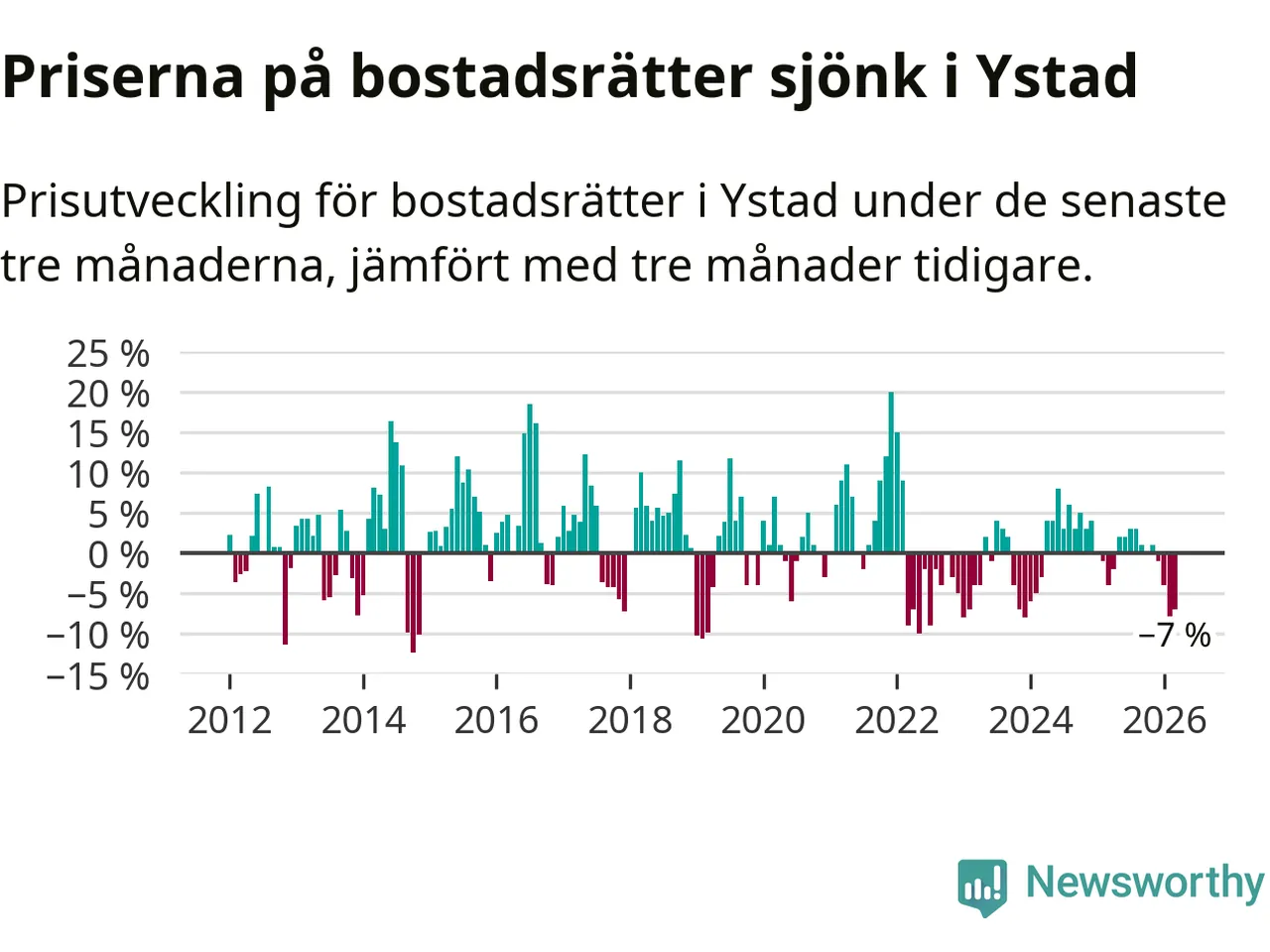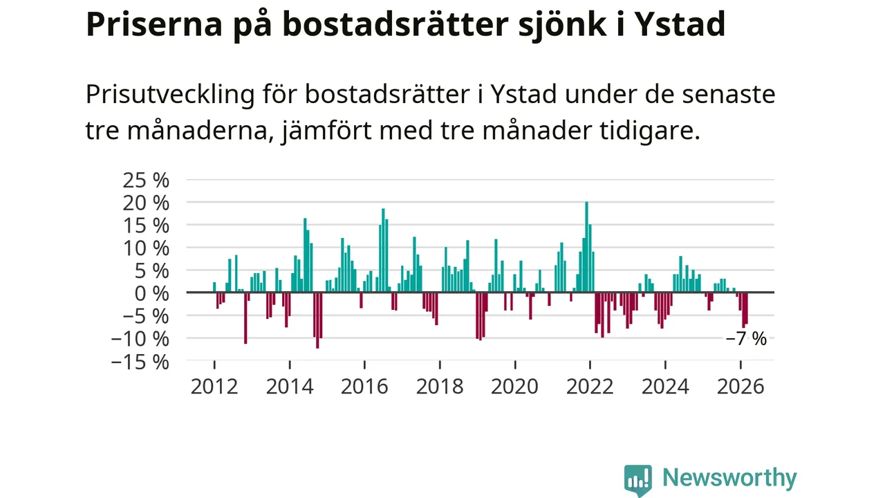 Priserna på bostadsrätter har gått ner i Ystads kommun. Medelpriset på försäljningarna under de senaste tre månaderna visar på en nedgång med 7 procent.