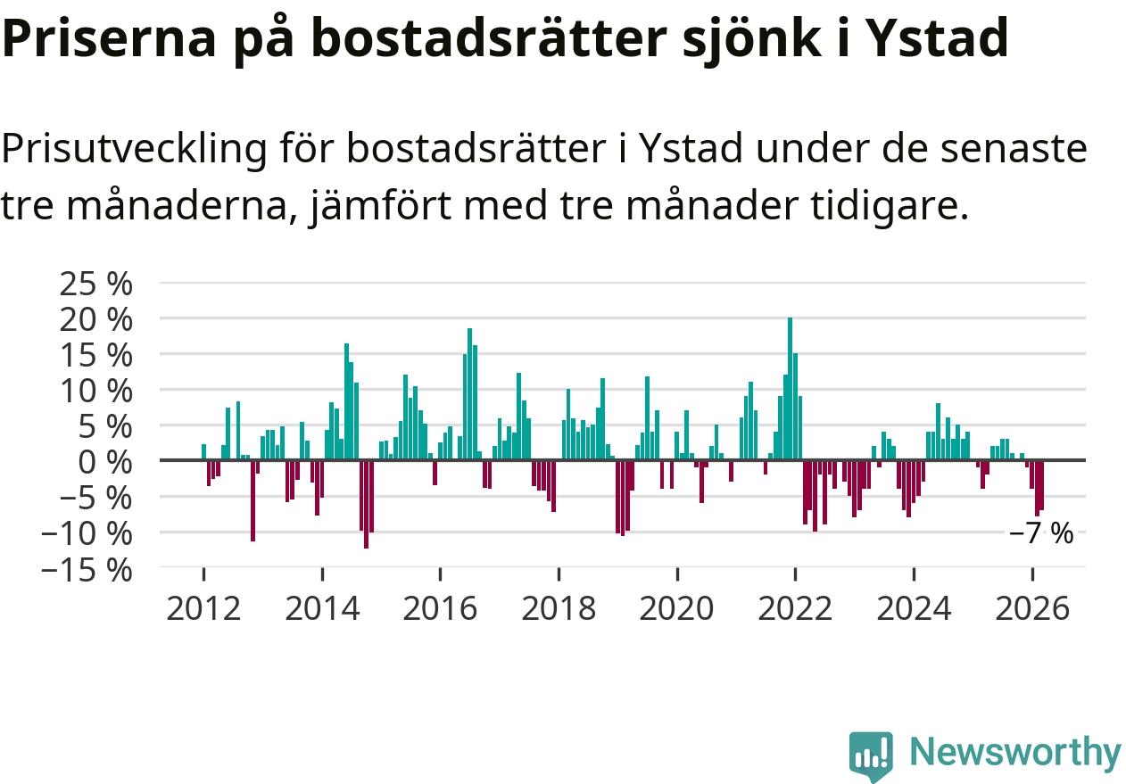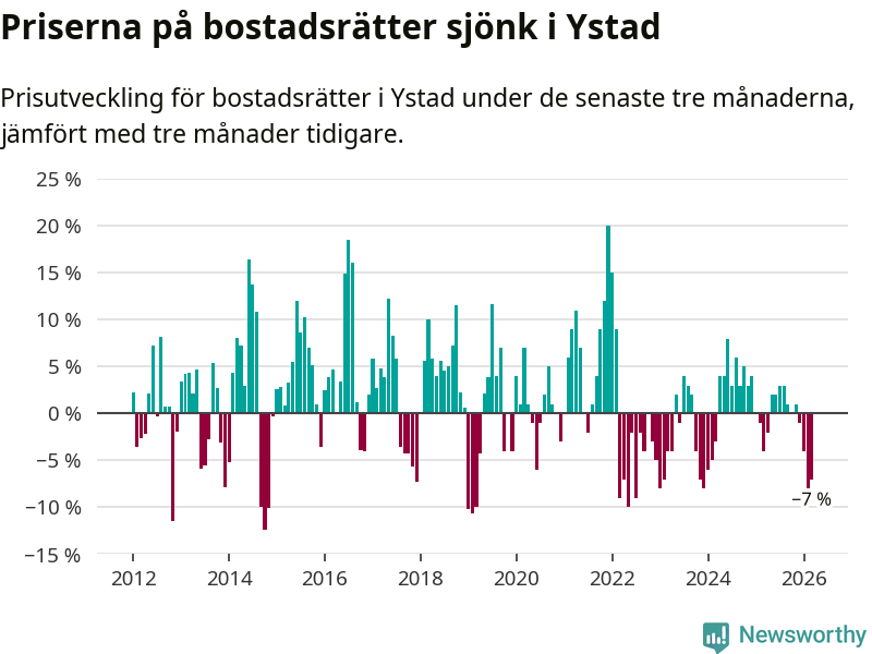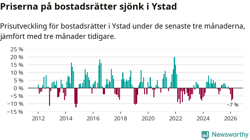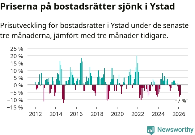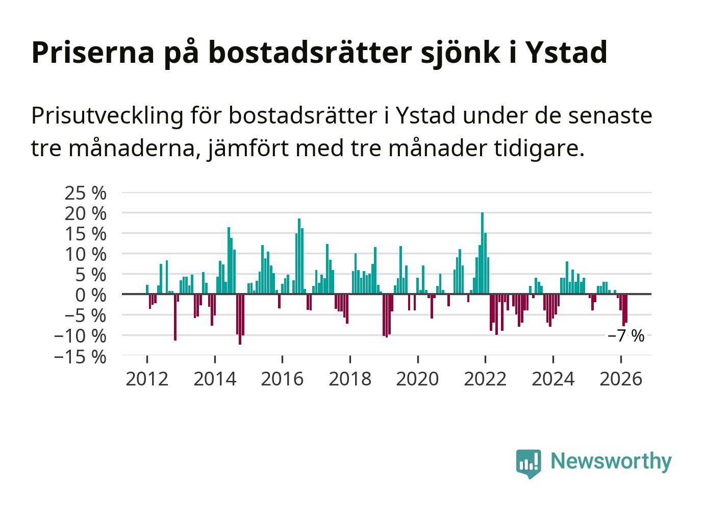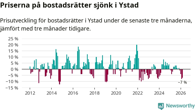Priserna på bostadsrätter har gått ner i Ystads kommun. Medelpriset på försäljningarna under de senaste tre månaderna visar på en nedgång med 7 procent.