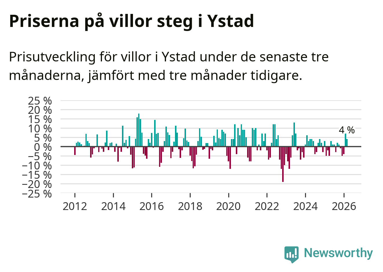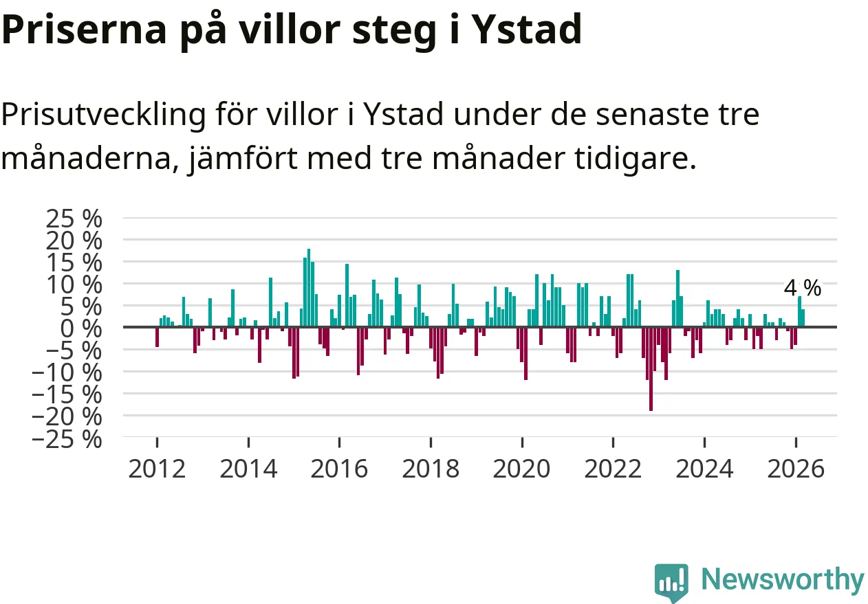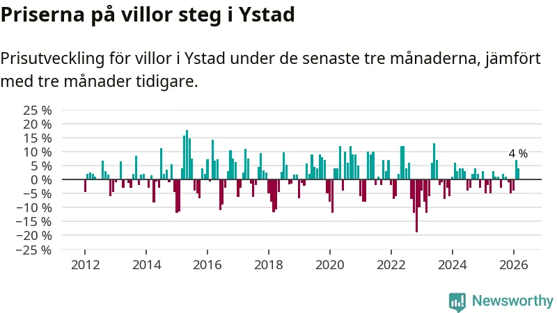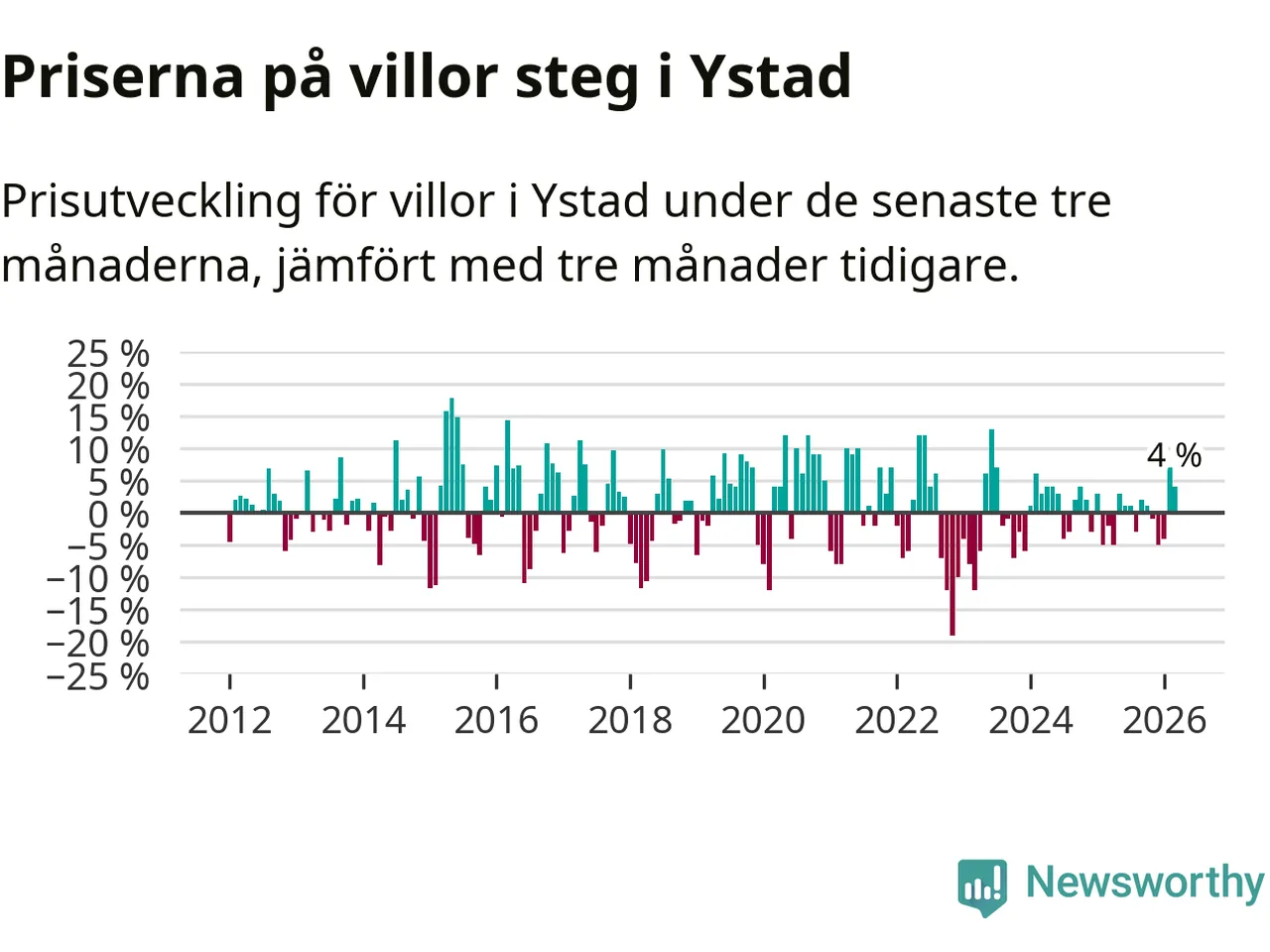 Villapriserna har gått upp i Ystads kommun. Medelpriset på försäljningarna under de senaste tre månaderna visar på en uppgång med 4 procent.