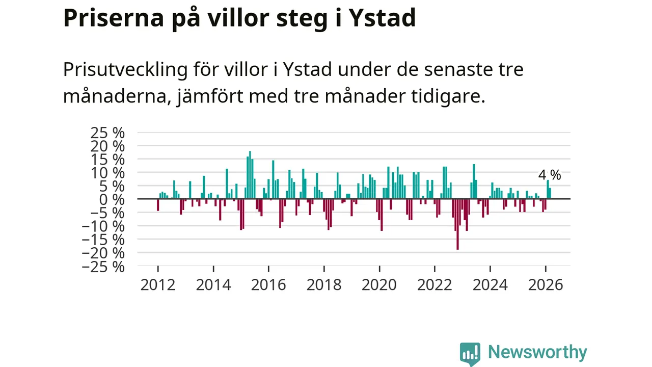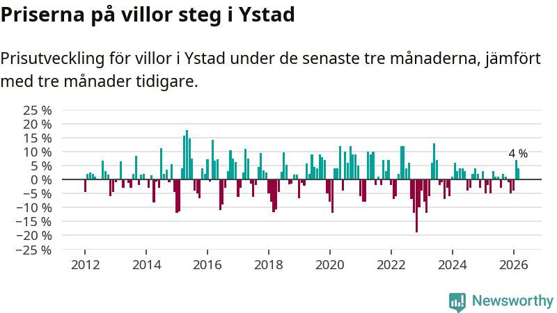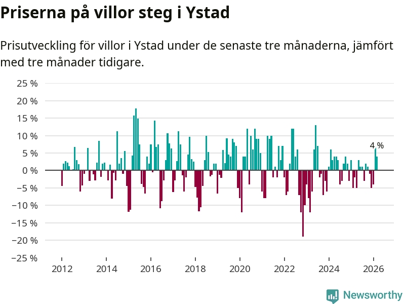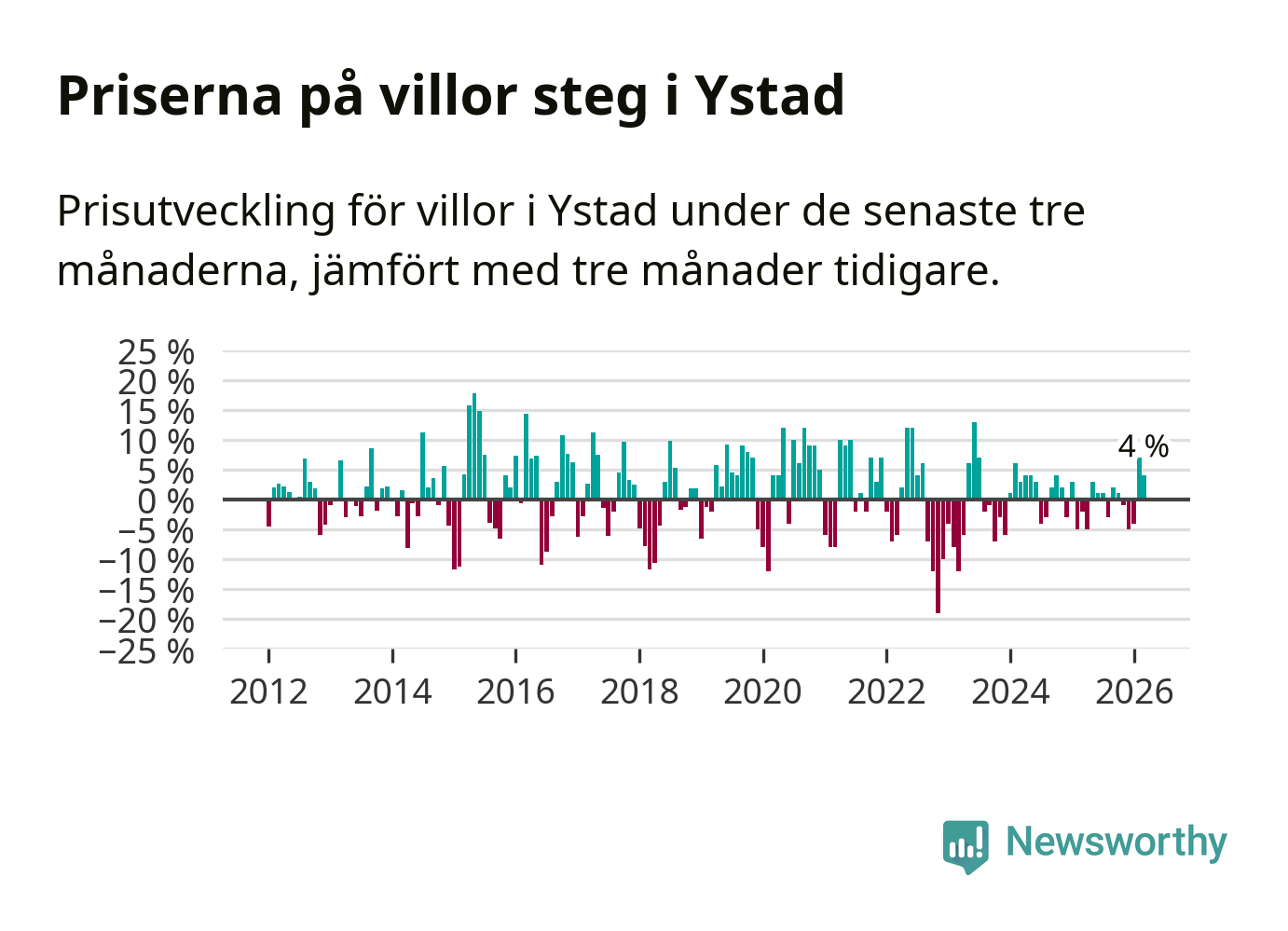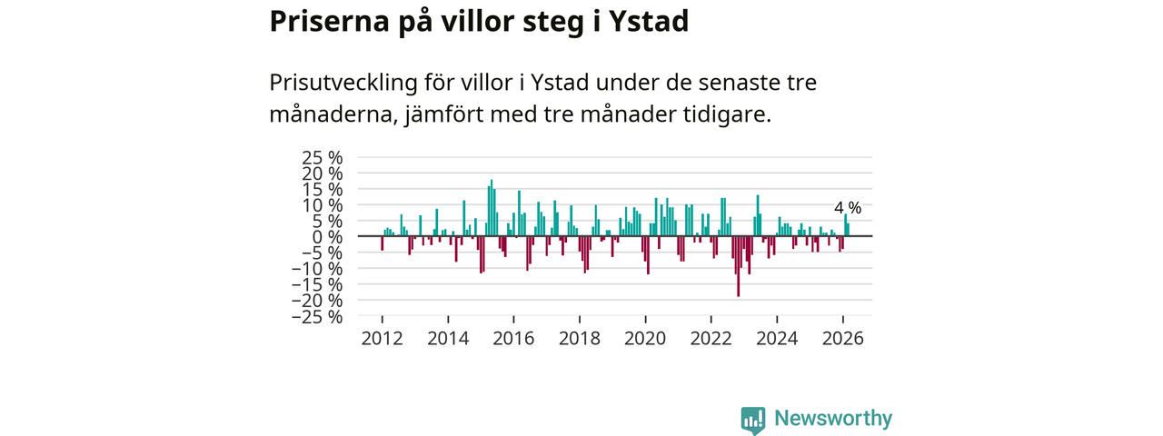 Villapriserna har gått upp i Ystads kommun. Medelpriset på försäljningarna under de senaste tre månaderna visar på en uppgång med 4 procent.