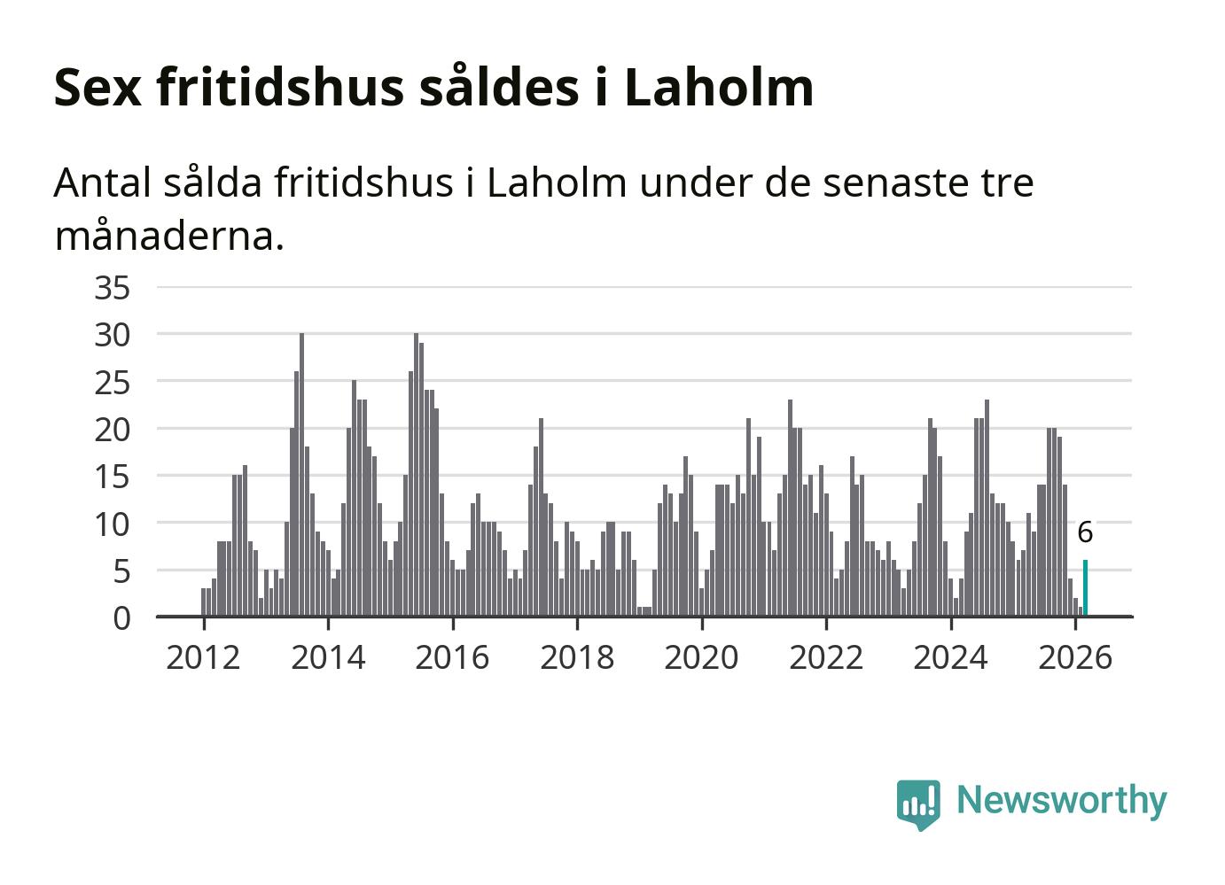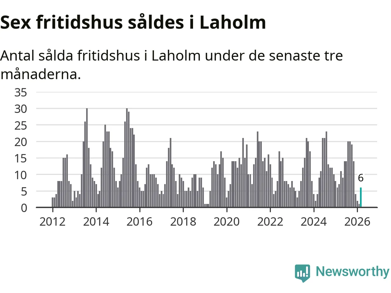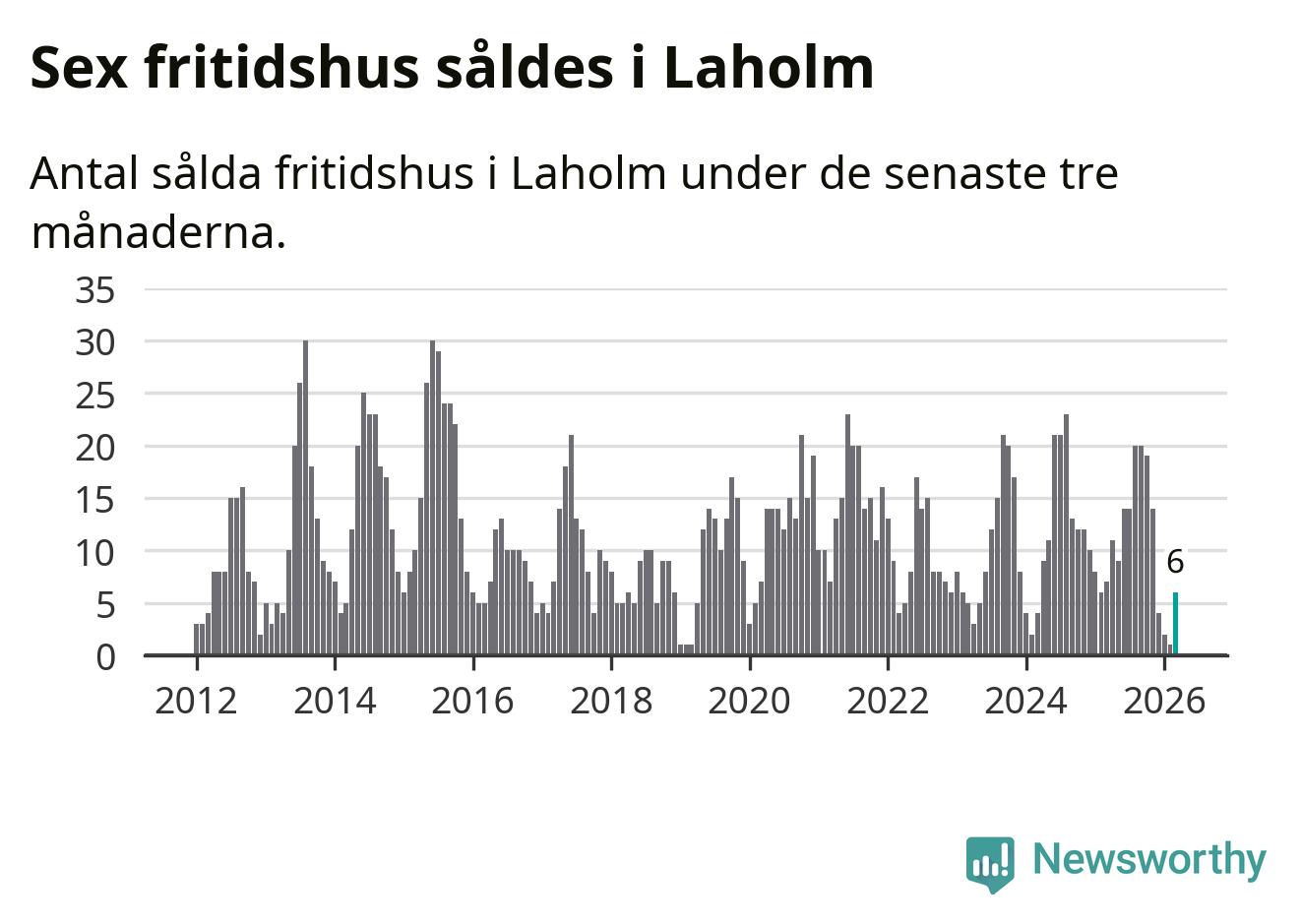Sammanlagt såldes sex fritidshus i Laholms kommun mellan januari och mars till ett genomsnittligt pris på 1,8 miljoner kronor. I fjol gjordes sju affärer vid den här tiden på året.
