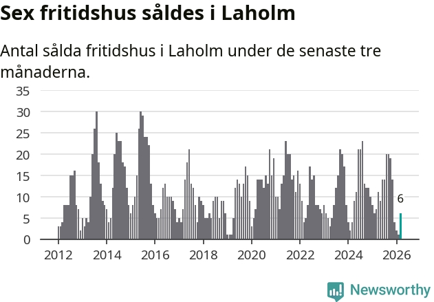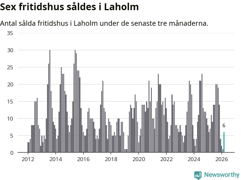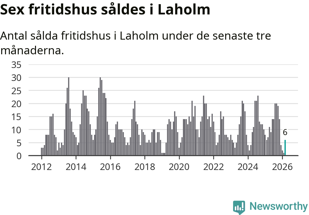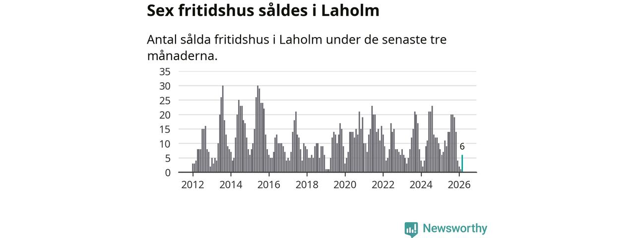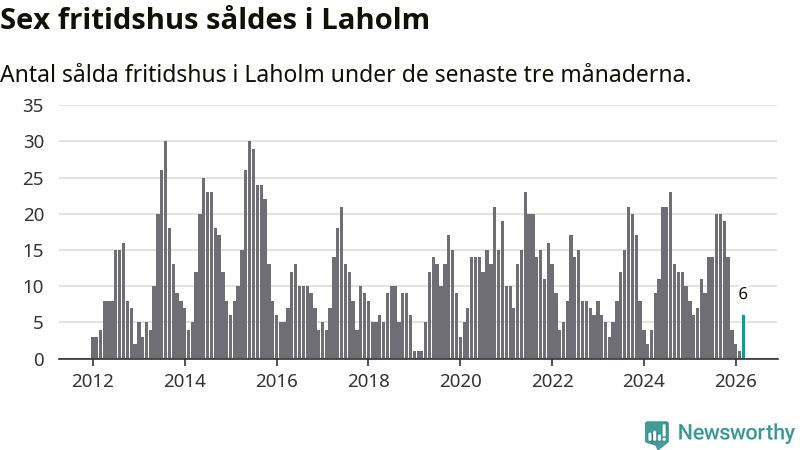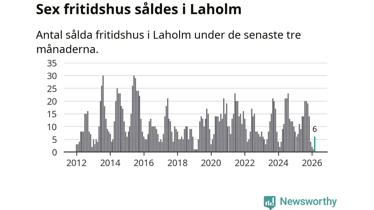 Sammanlagt såldes sex fritidshus i Laholms kommun mellan januari och mars till ett genomsnittligt pris på 1,8 miljoner kronor. I fjol gjordes sju affärer vid den här tiden på året.