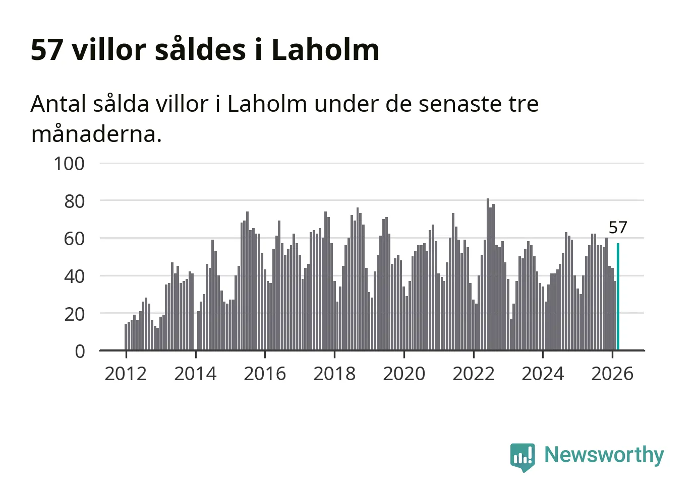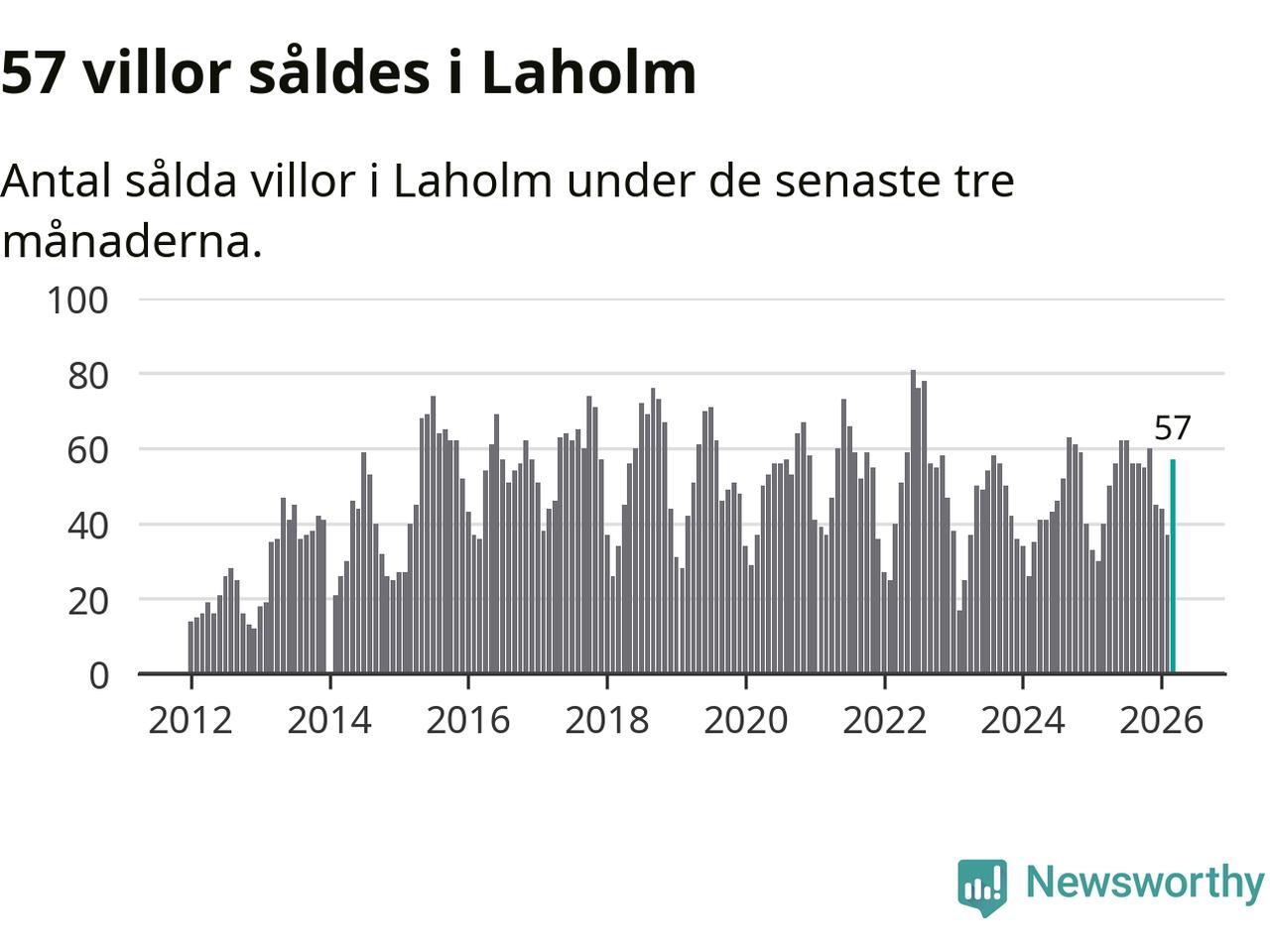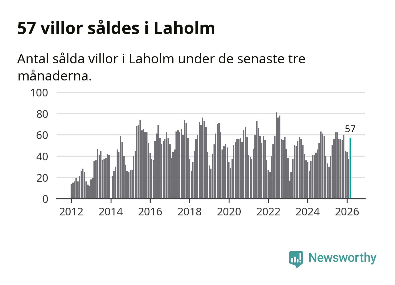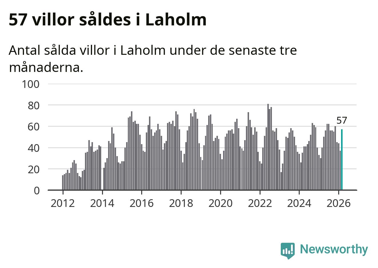 Mellan januari och mars såldes 57 villor i Laholms kommun. Det är relativt många sett till aktiviteten på bostadsmarknaden i kommunen under de senaste tolv månaderna, samt det historiska snittet för den här tiden på året.