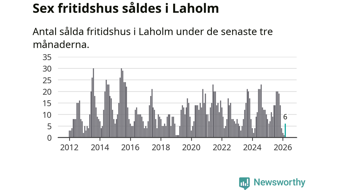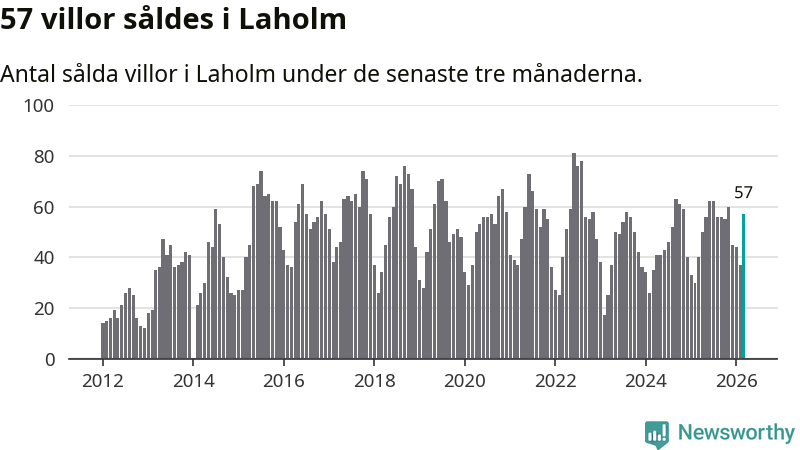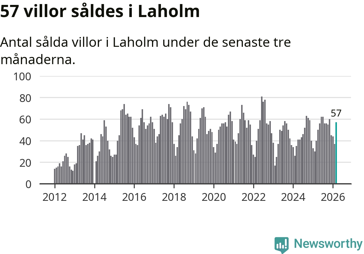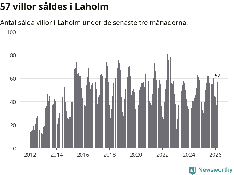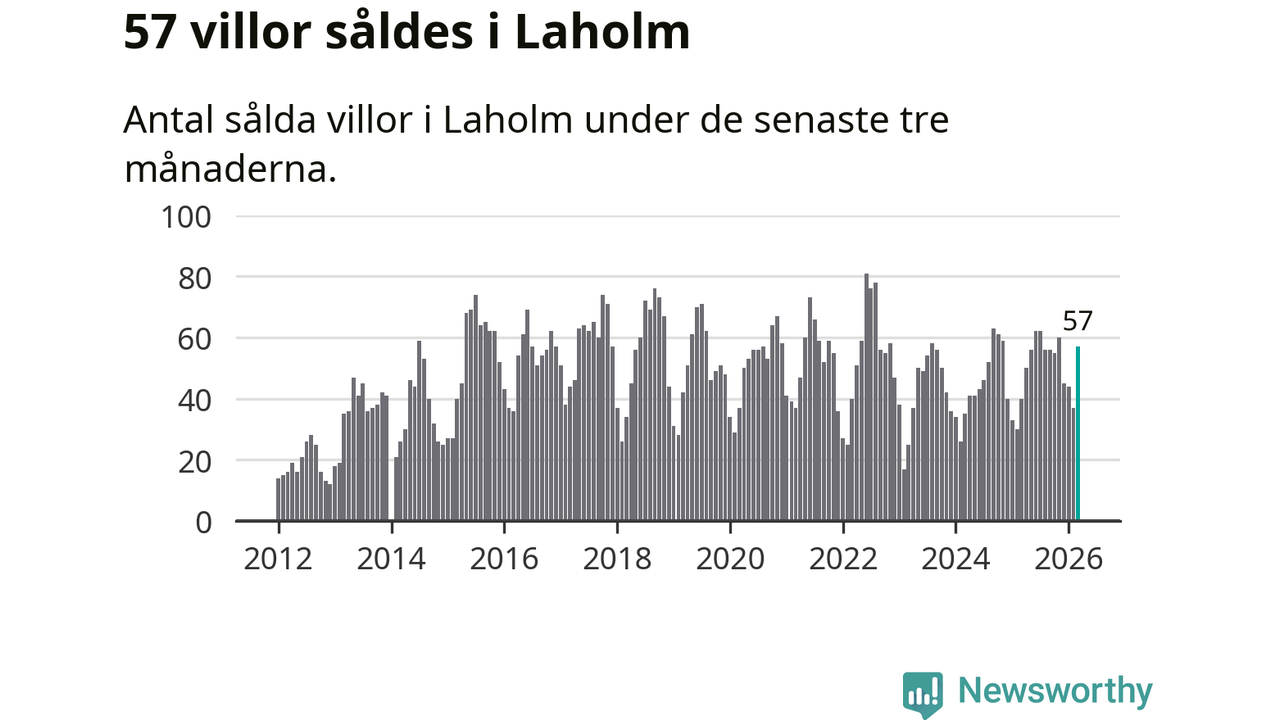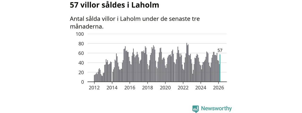 Mellan januari och mars såldes 57 villor i Laholms kommun. Det är relativt många sett till aktiviteten på bostadsmarknaden i kommunen under de senaste tolv månaderna, samt det historiska snittet för den här tiden på året.