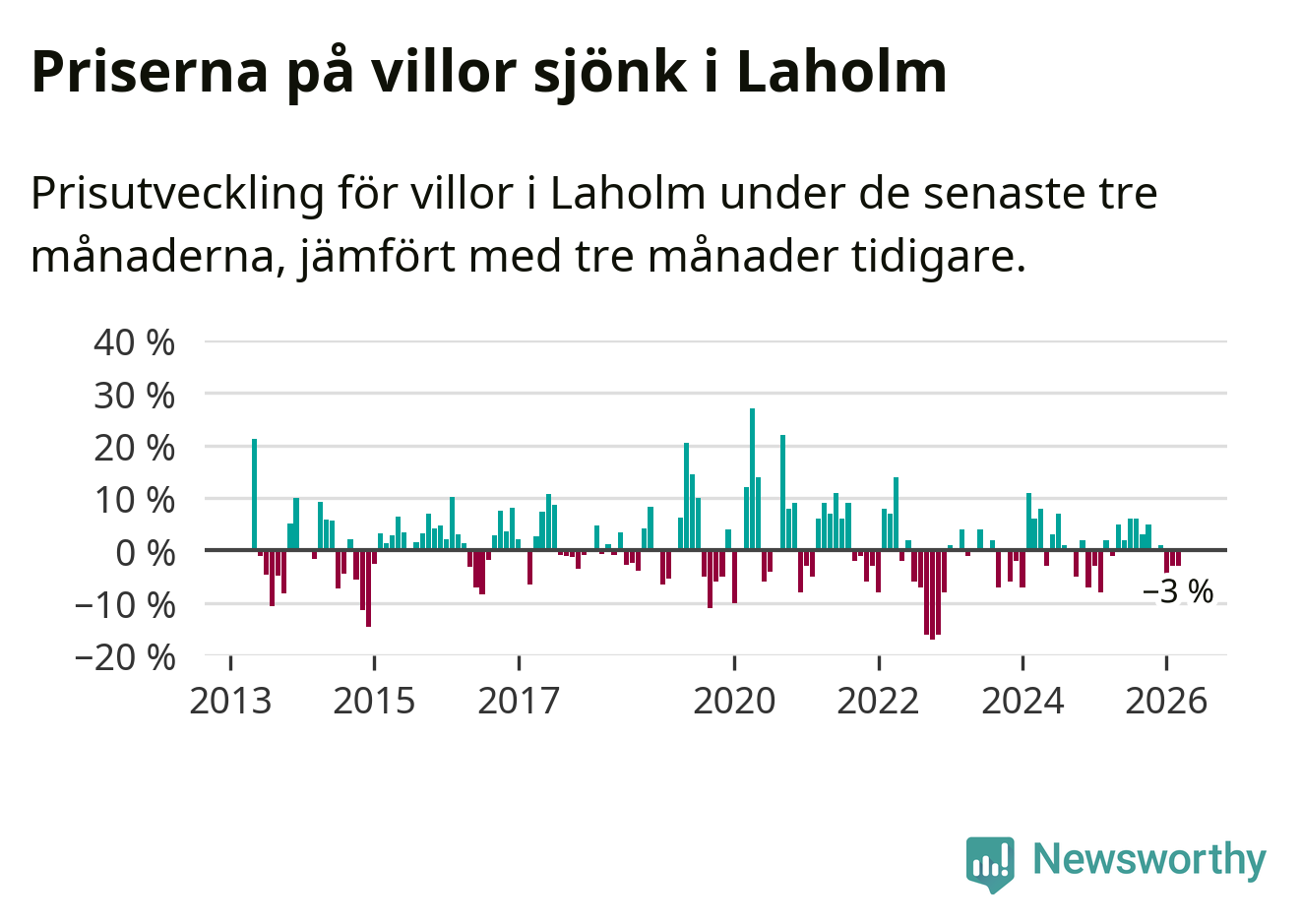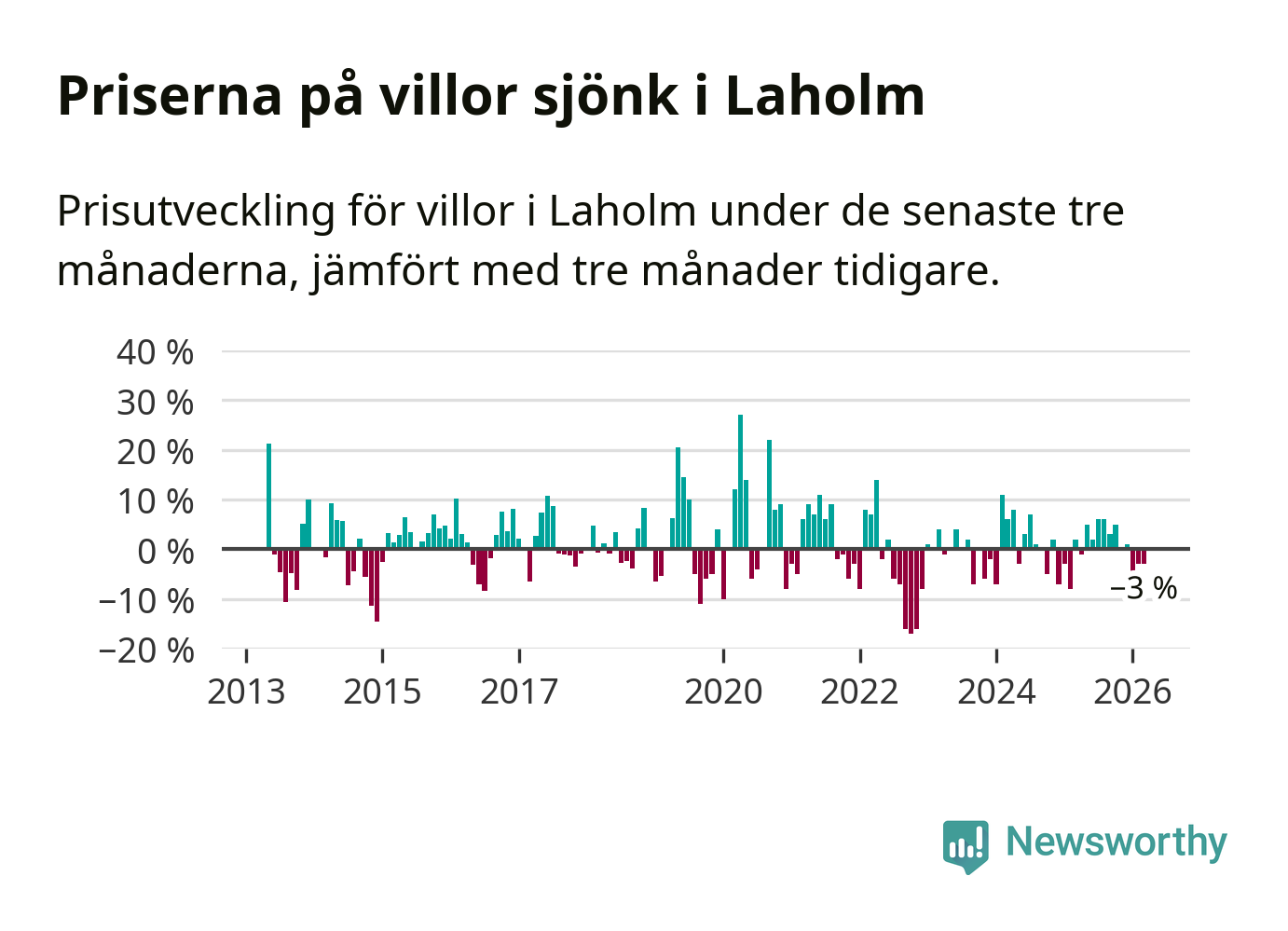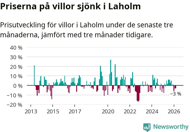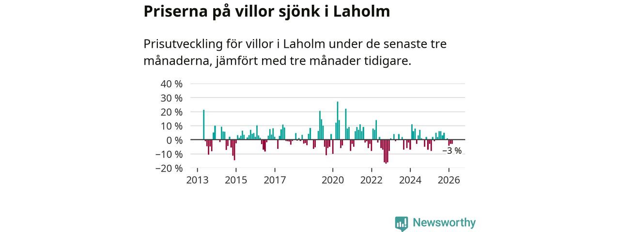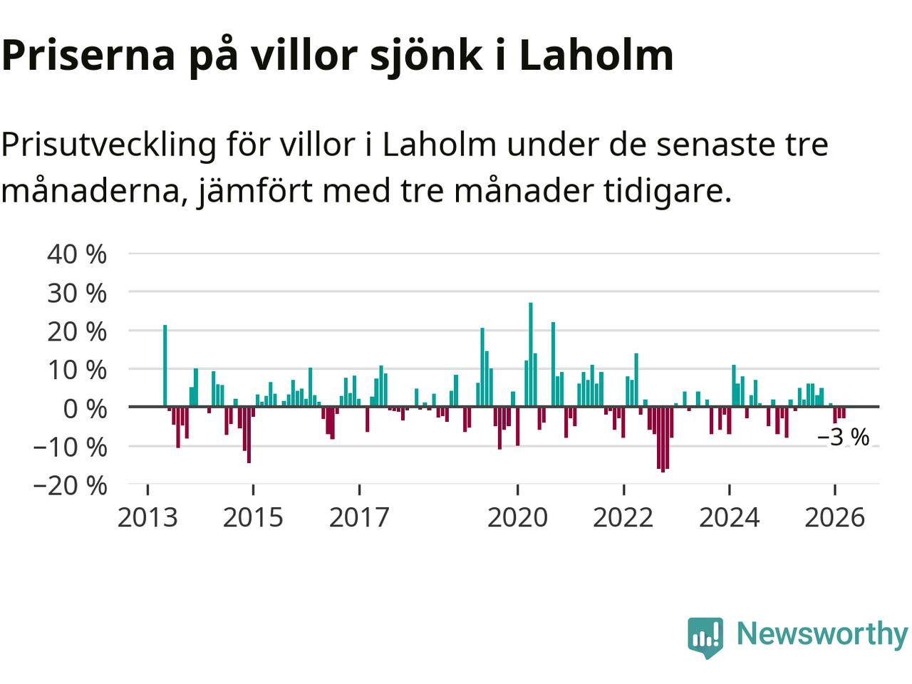 Statistiken visar även på en prisnedgång i Laholms kommun. Medelpriset på försäljningarna av villor i kommunen var 3 procent lägre än för tre månader sedan. I hela Halland däremot ökar villapriserna. I hela länet noterades en prisuppgång på 1 procent.