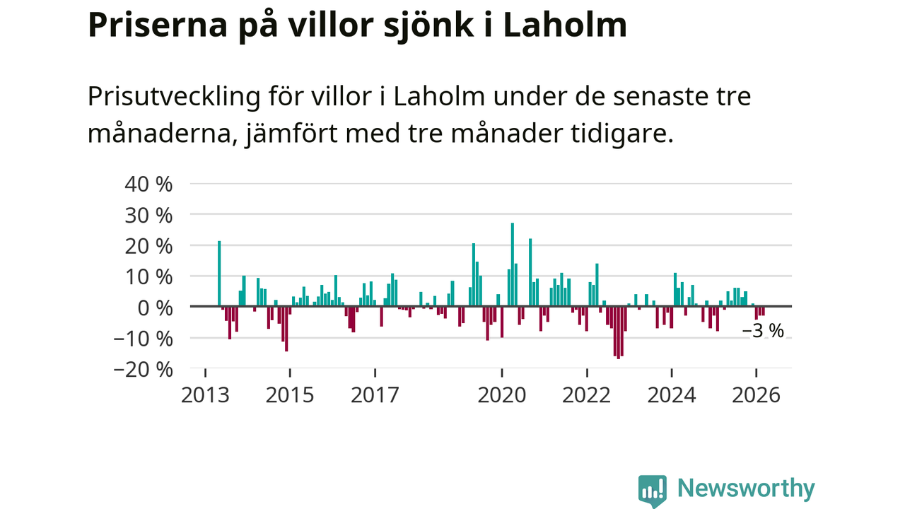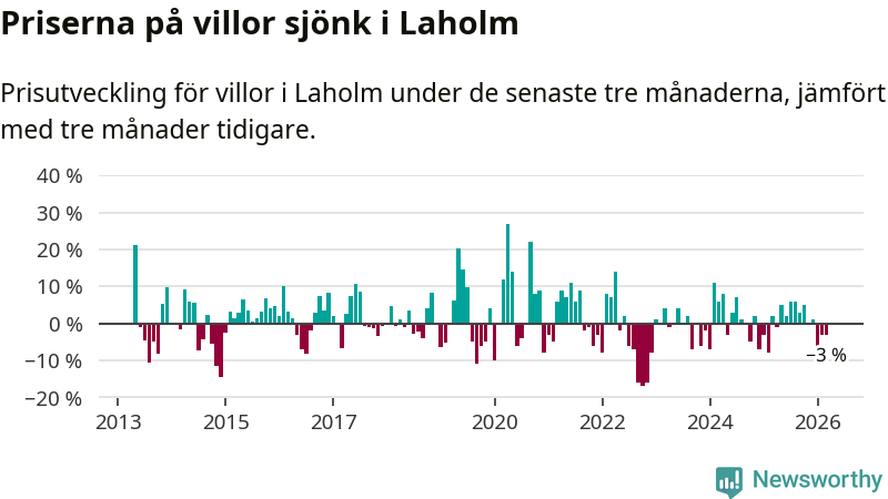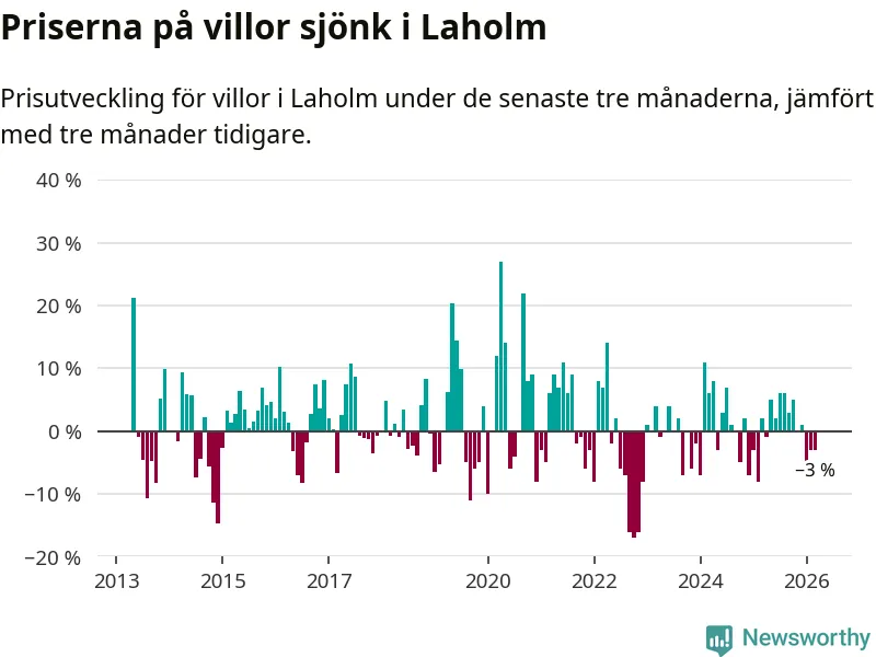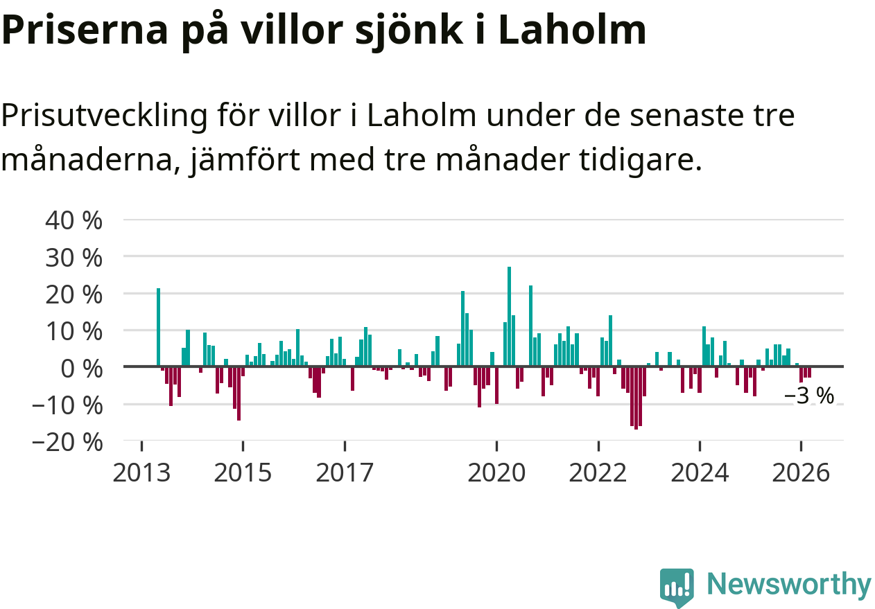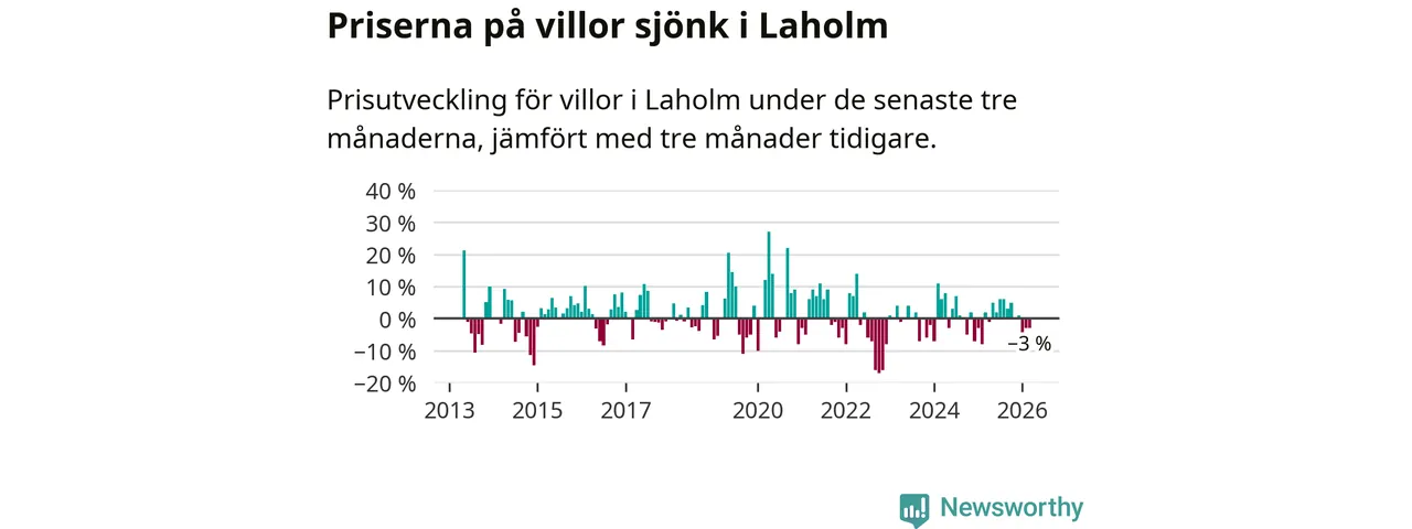 Statistiken visar även på en prisnedgång i Laholms kommun. Medelpriset på försäljningarna av villor i kommunen var 3 procent lägre än för tre månader sedan. I hela Halland däremot ökar villapriserna. I hela länet noterades en prisuppgång på 1 procent.