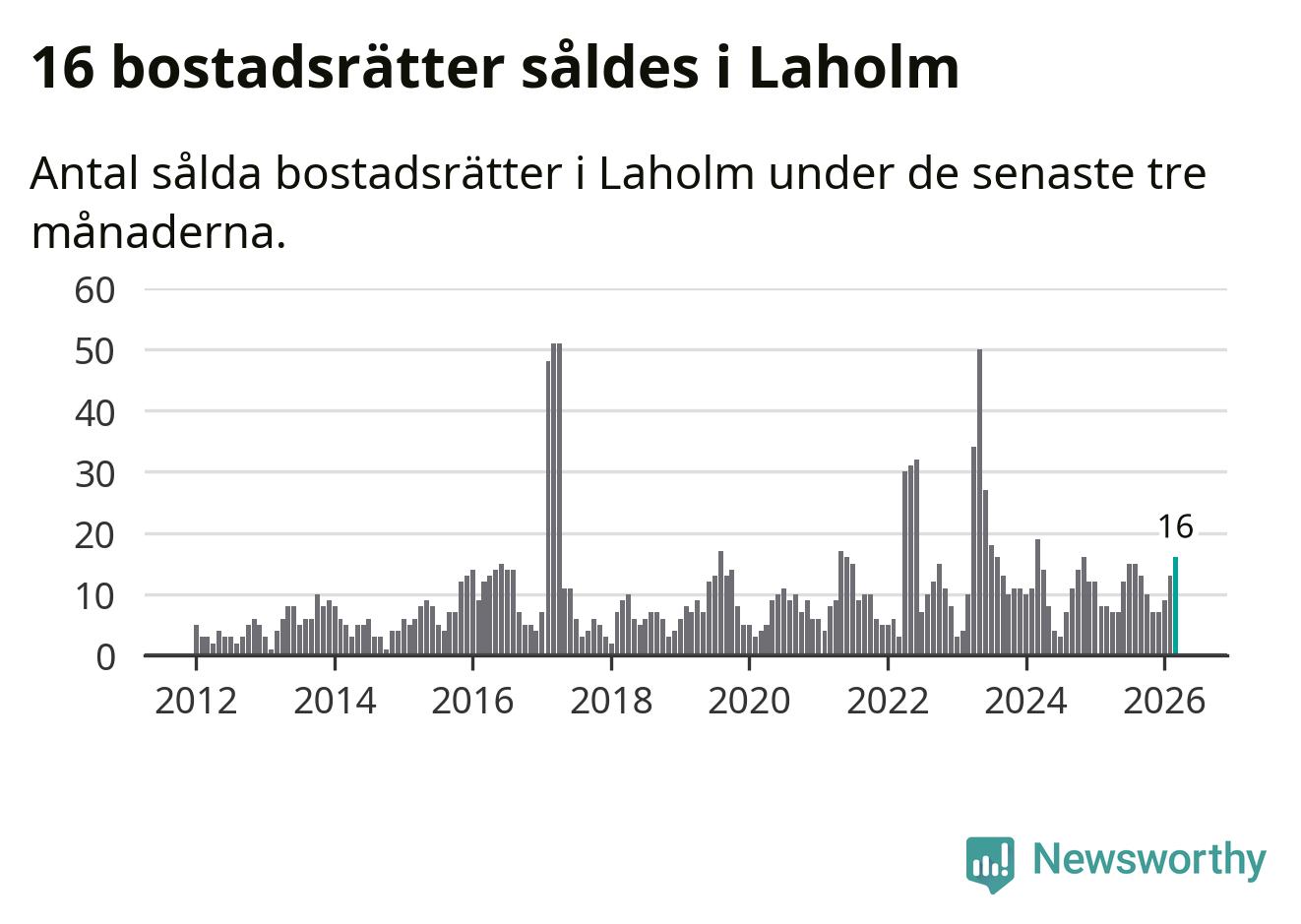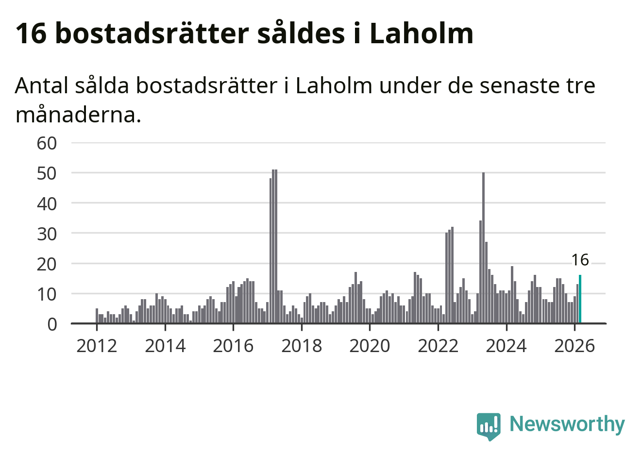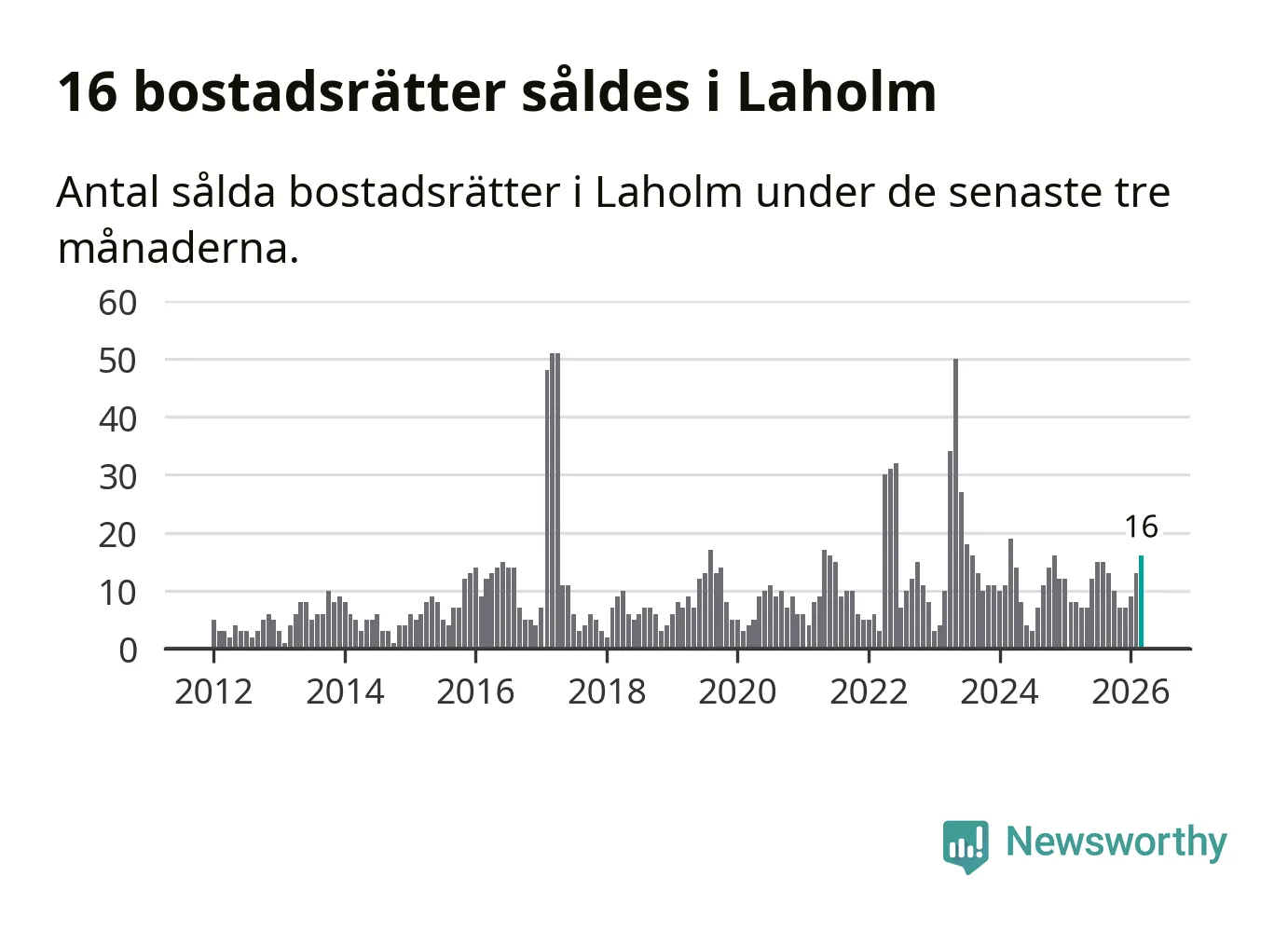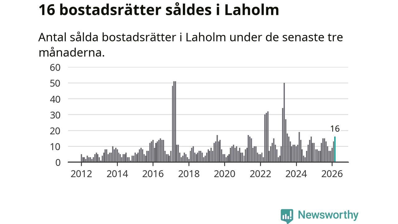 Mellan januari och mars gjordes sammanlagt 16 affärer med bostadsrätter i Laholms kommun. Det kan jämföras med åtta vid motsvarande tid i fjol.