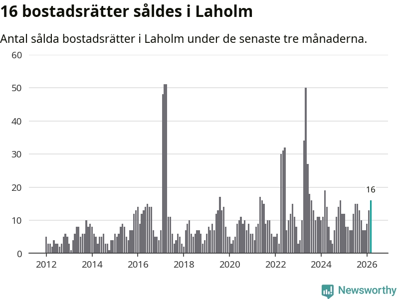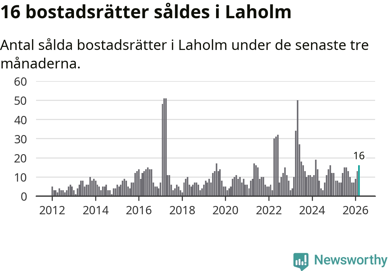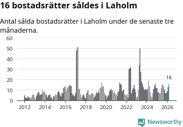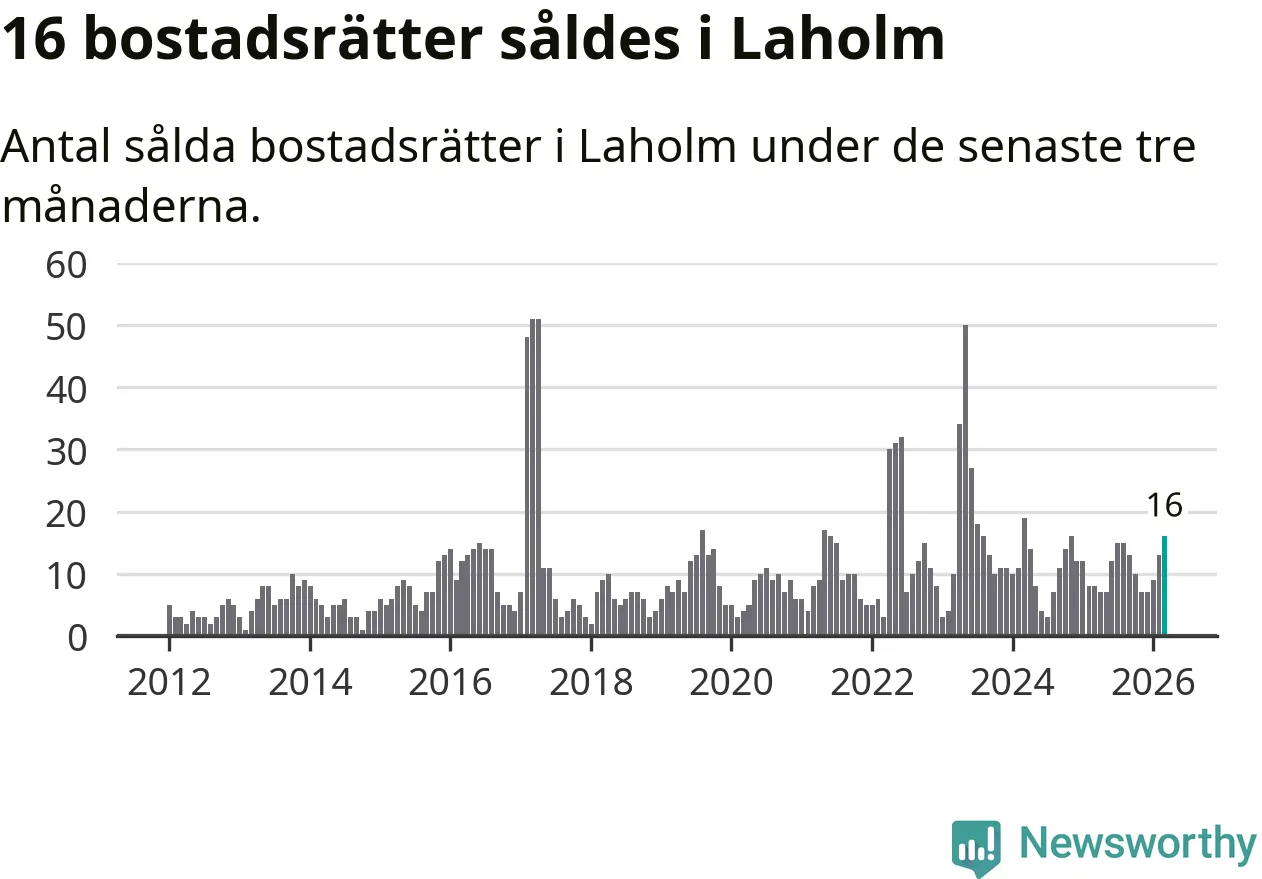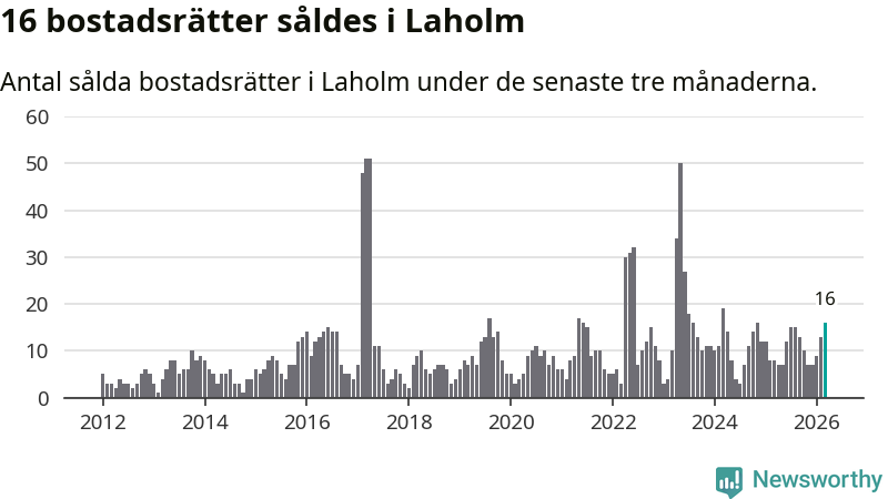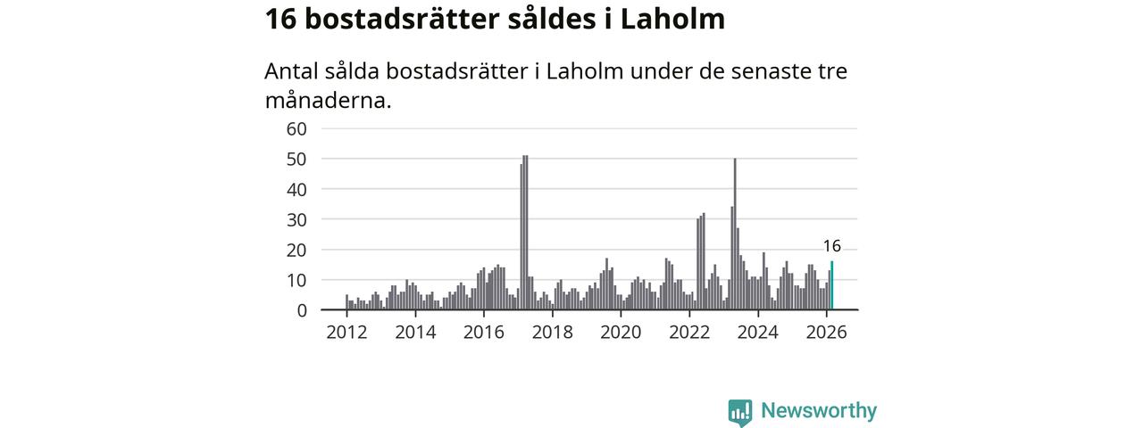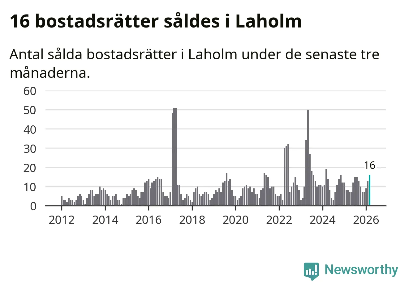 Mellan januari och mars gjordes sammanlagt 16 affärer med bostadsrätter i Laholms kommun. Det kan jämföras med åtta vid motsvarande tid i fjol.