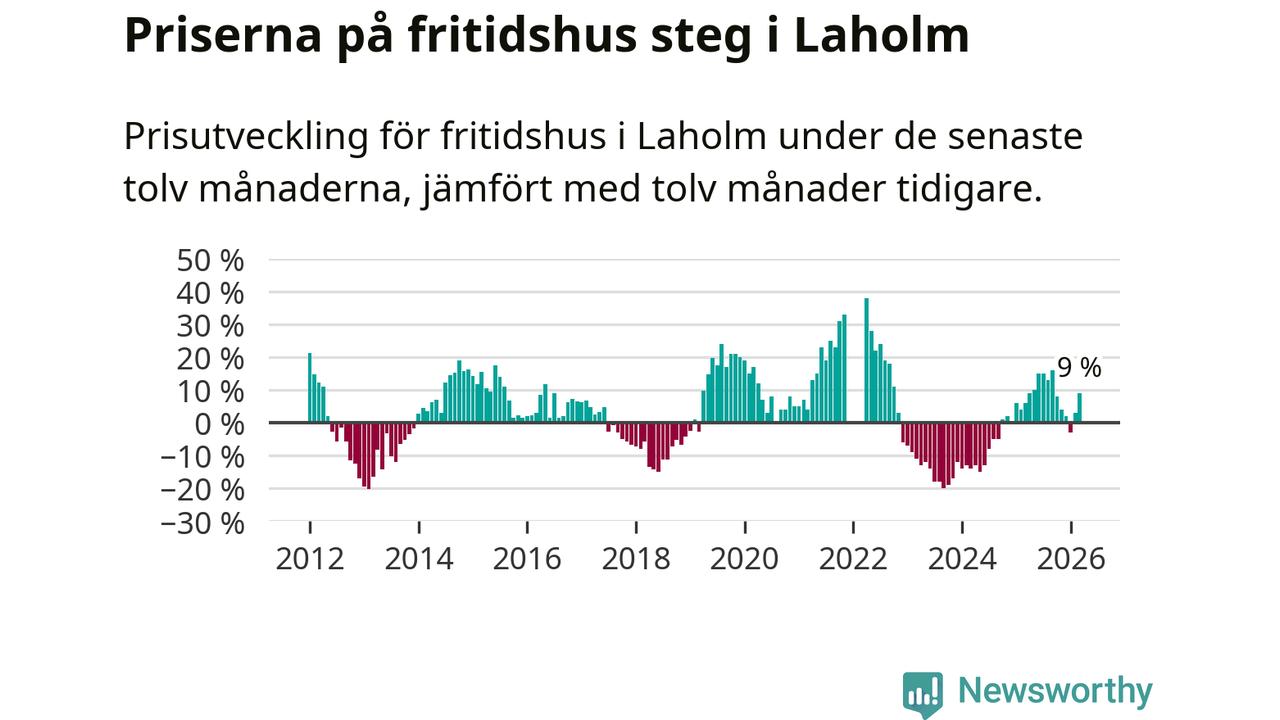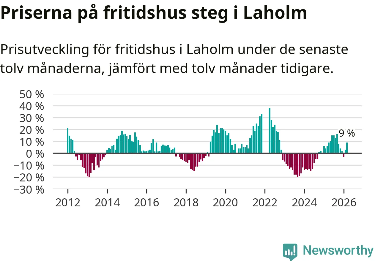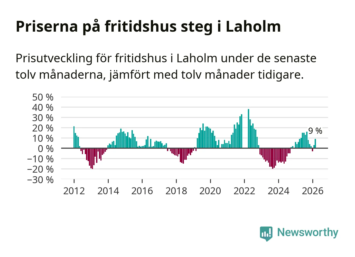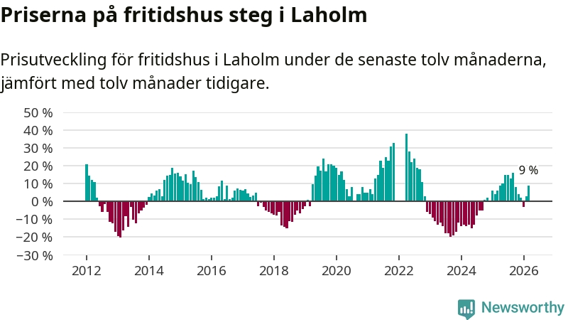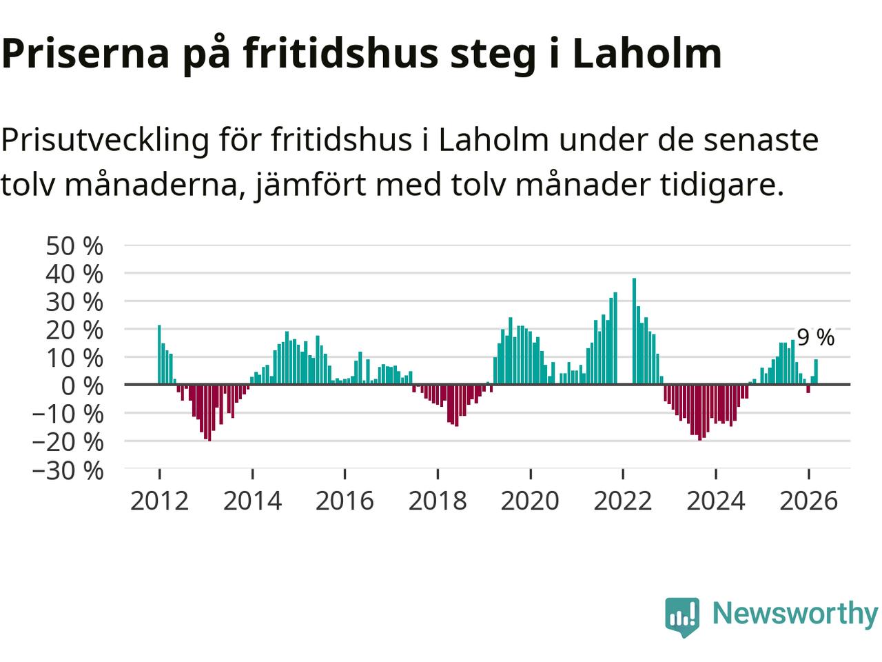 Priserna på fritidshus har gått upp i Laholms kommun. Medelpriset på försäljningarna under de senaste tolv månaderna visar på en uppgång med 9 procent.