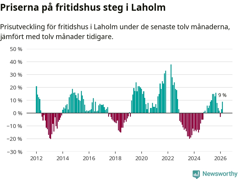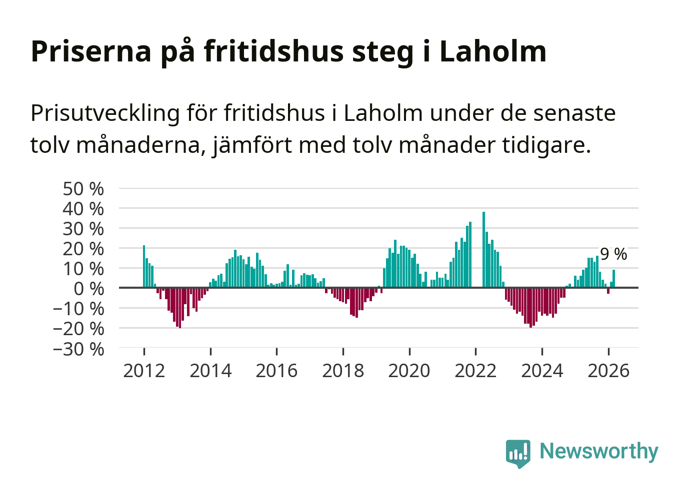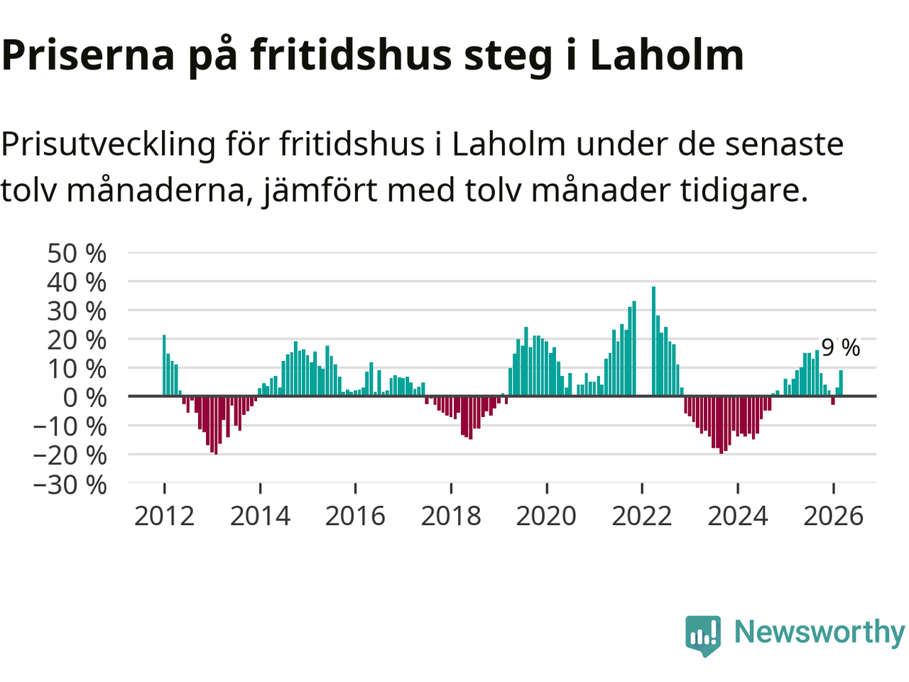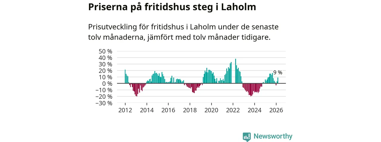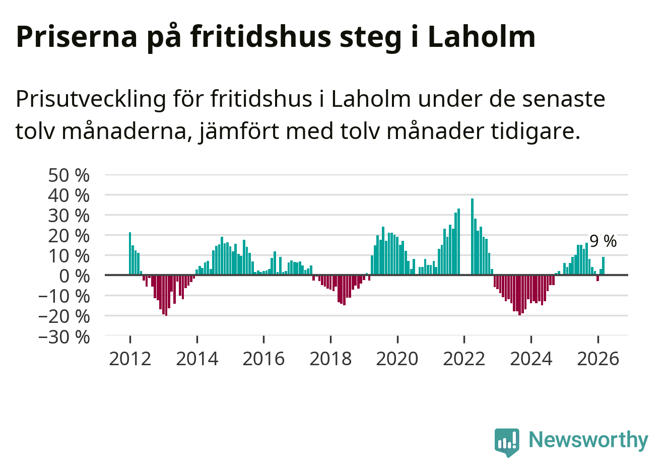 Priserna på fritidshus har gått upp i Laholms kommun. Medelpriset på försäljningarna under de senaste tolv månaderna visar på en uppgång med 9 procent.