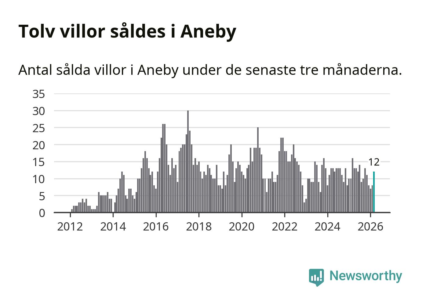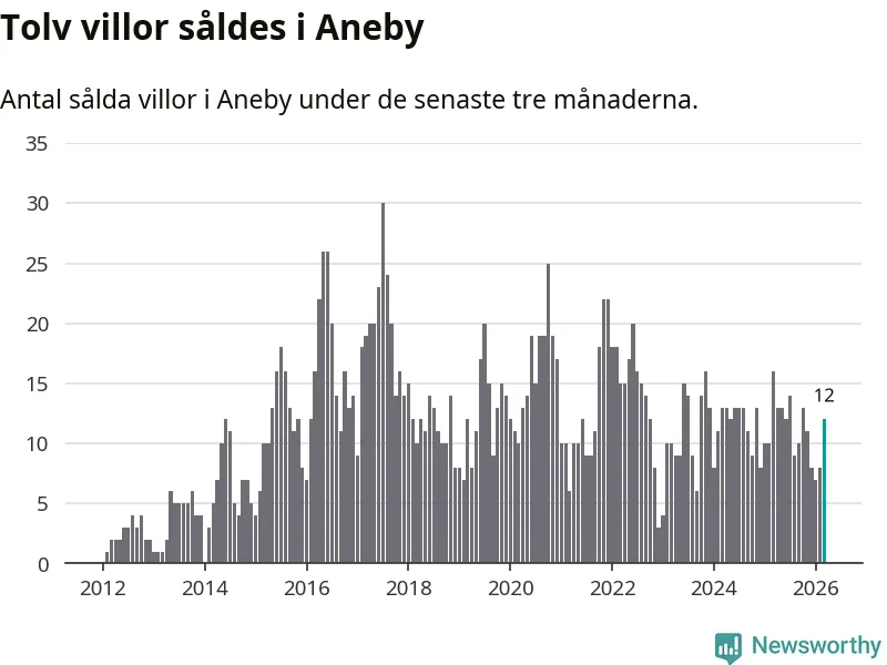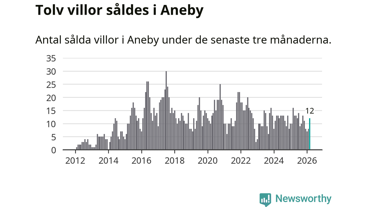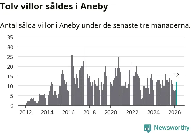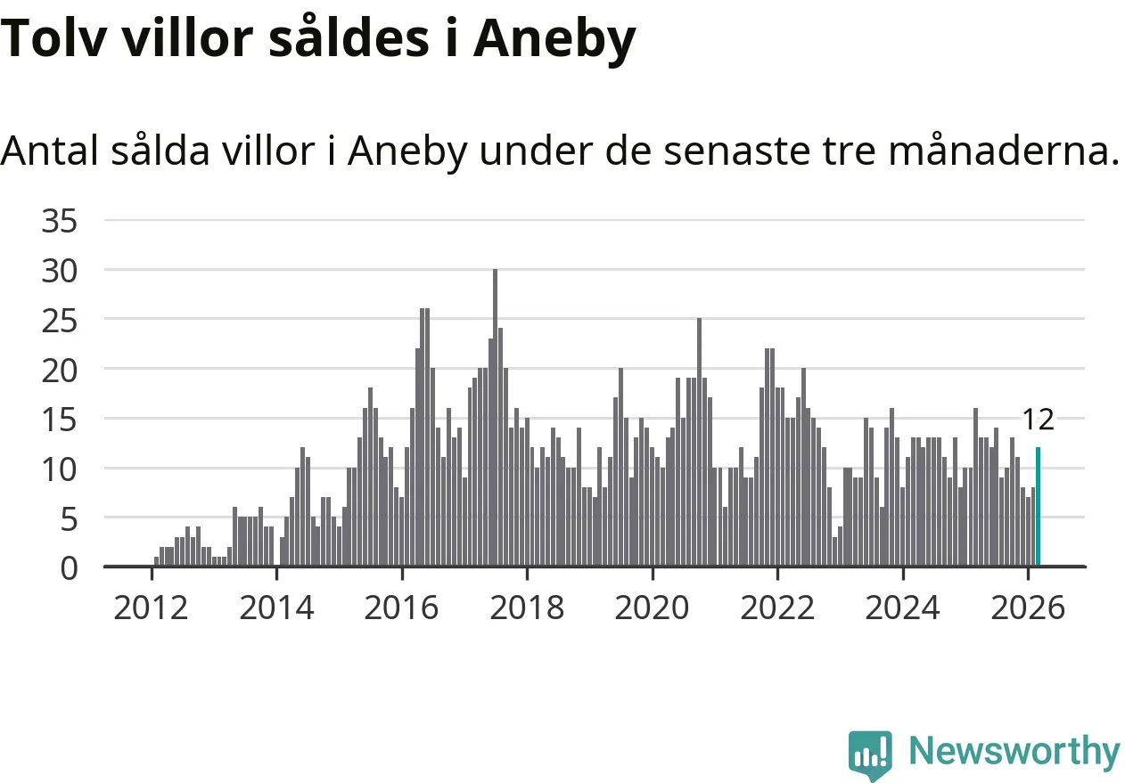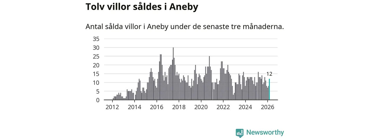 Mellan januari och mars gjordes sammanlagt tolv affärer med villor i Aneby kommun. Det kan jämföras med 16 vid motsvarande tid i fjol.