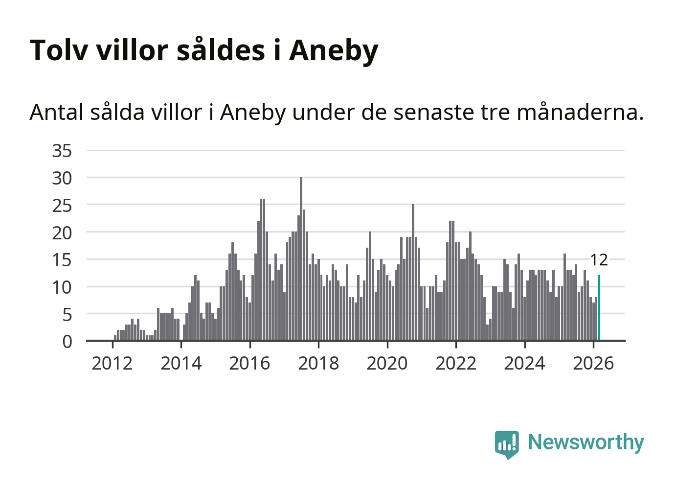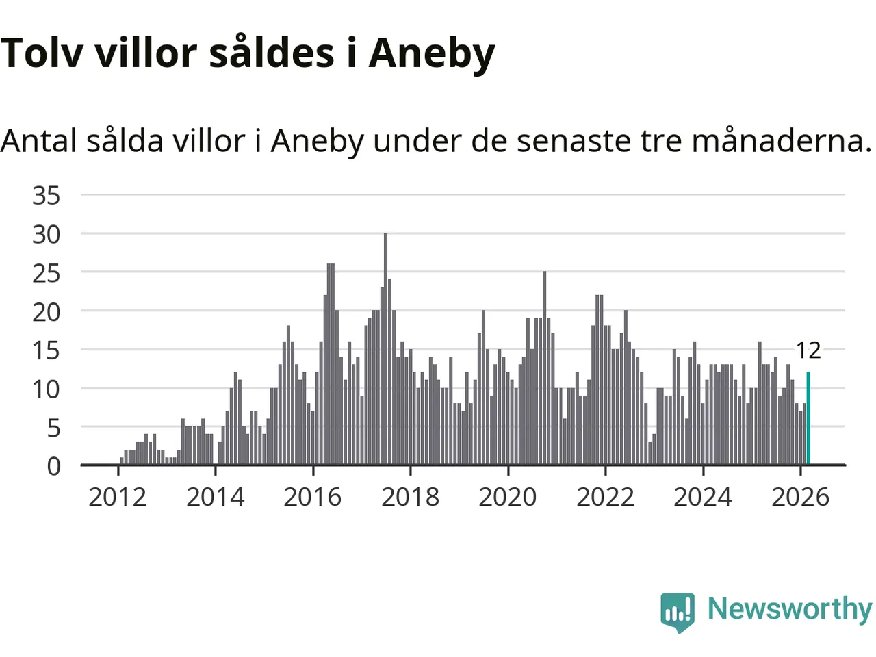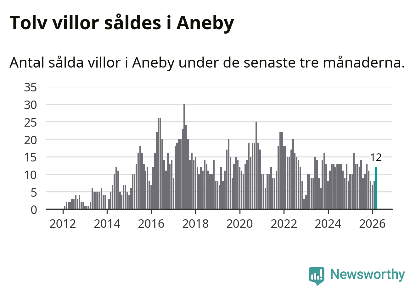 Mellan januari och mars gjordes sammanlagt tolv affärer med villor i Aneby kommun. Det kan jämföras med 16 vid motsvarande tid i fjol.
