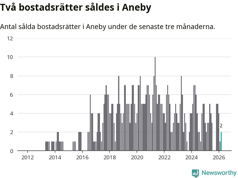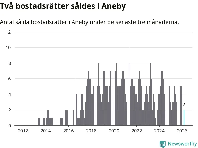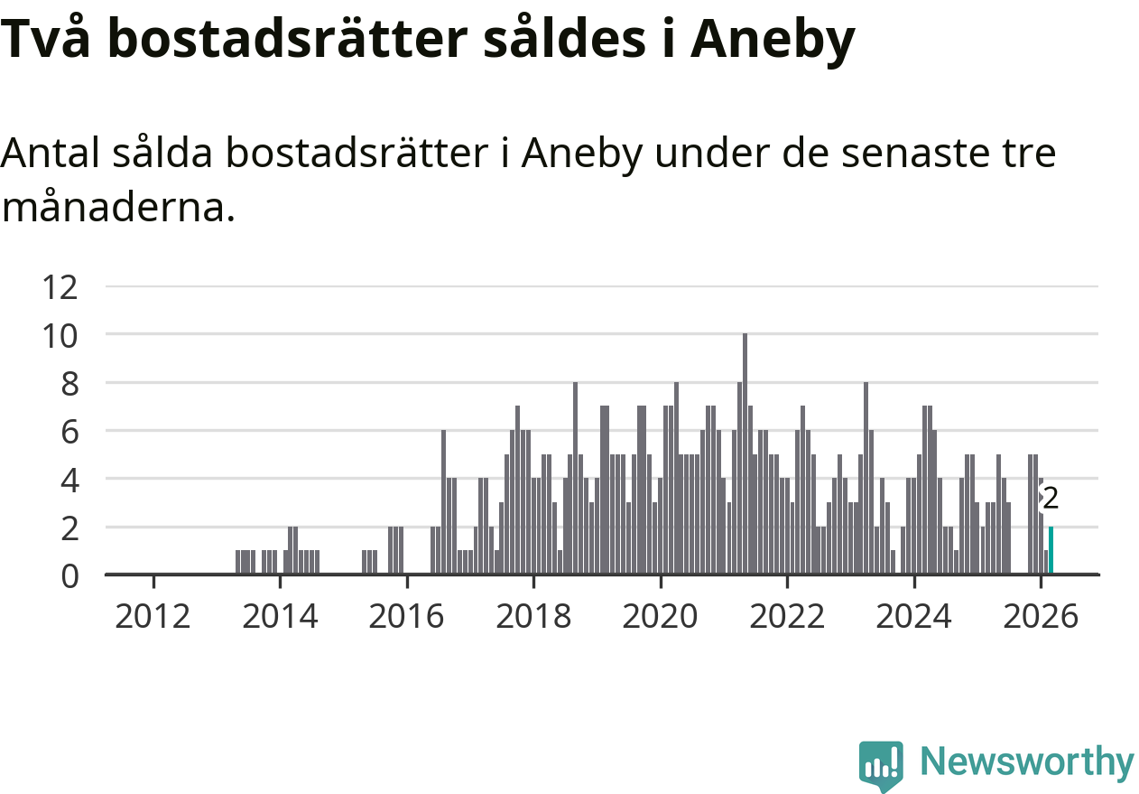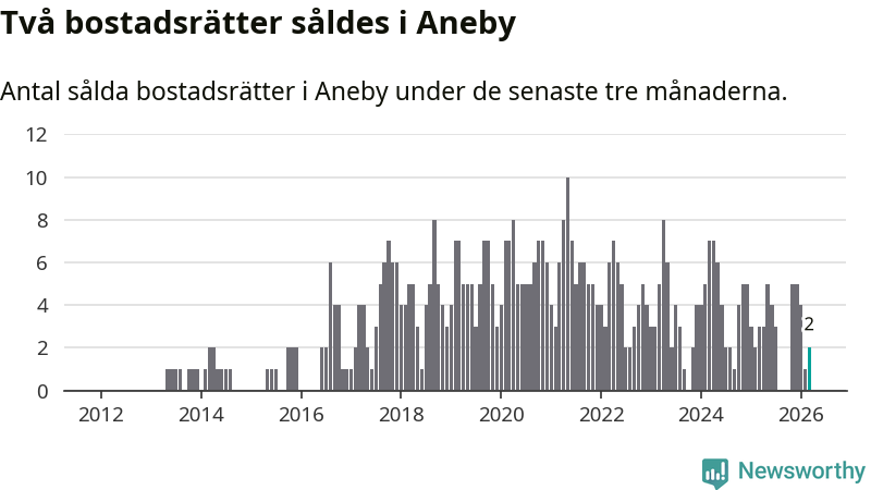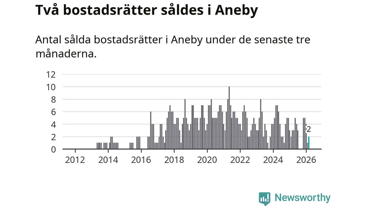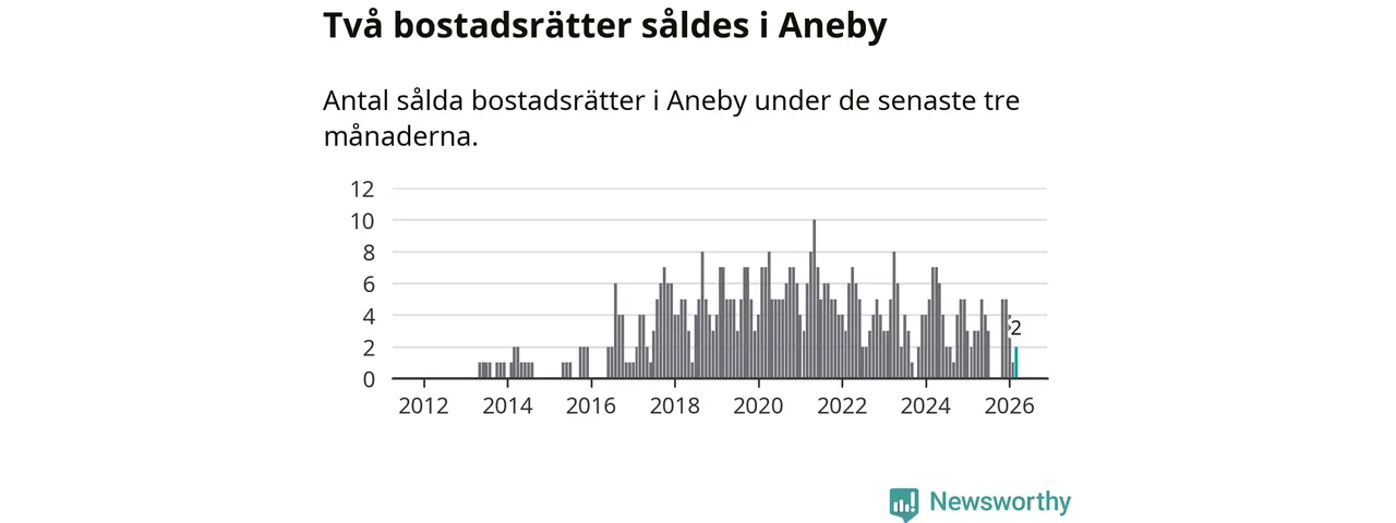 Mellan januari och mars gjordes sammanlagt två affärer med bostadsrätter i Aneby kommun. Det kan jämföras med tre vid motsvarande tid i fjol.