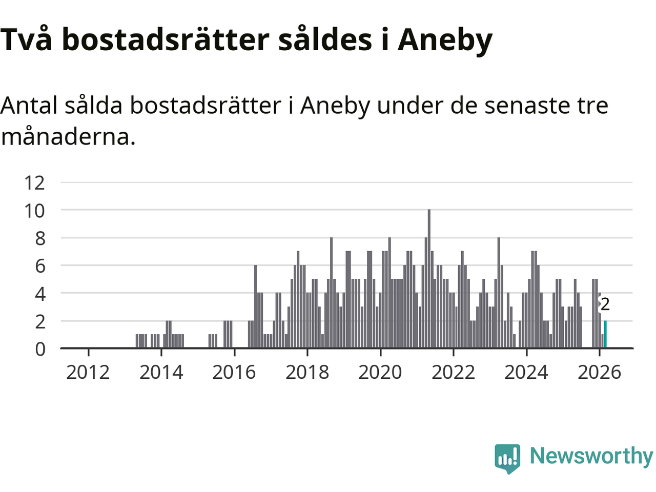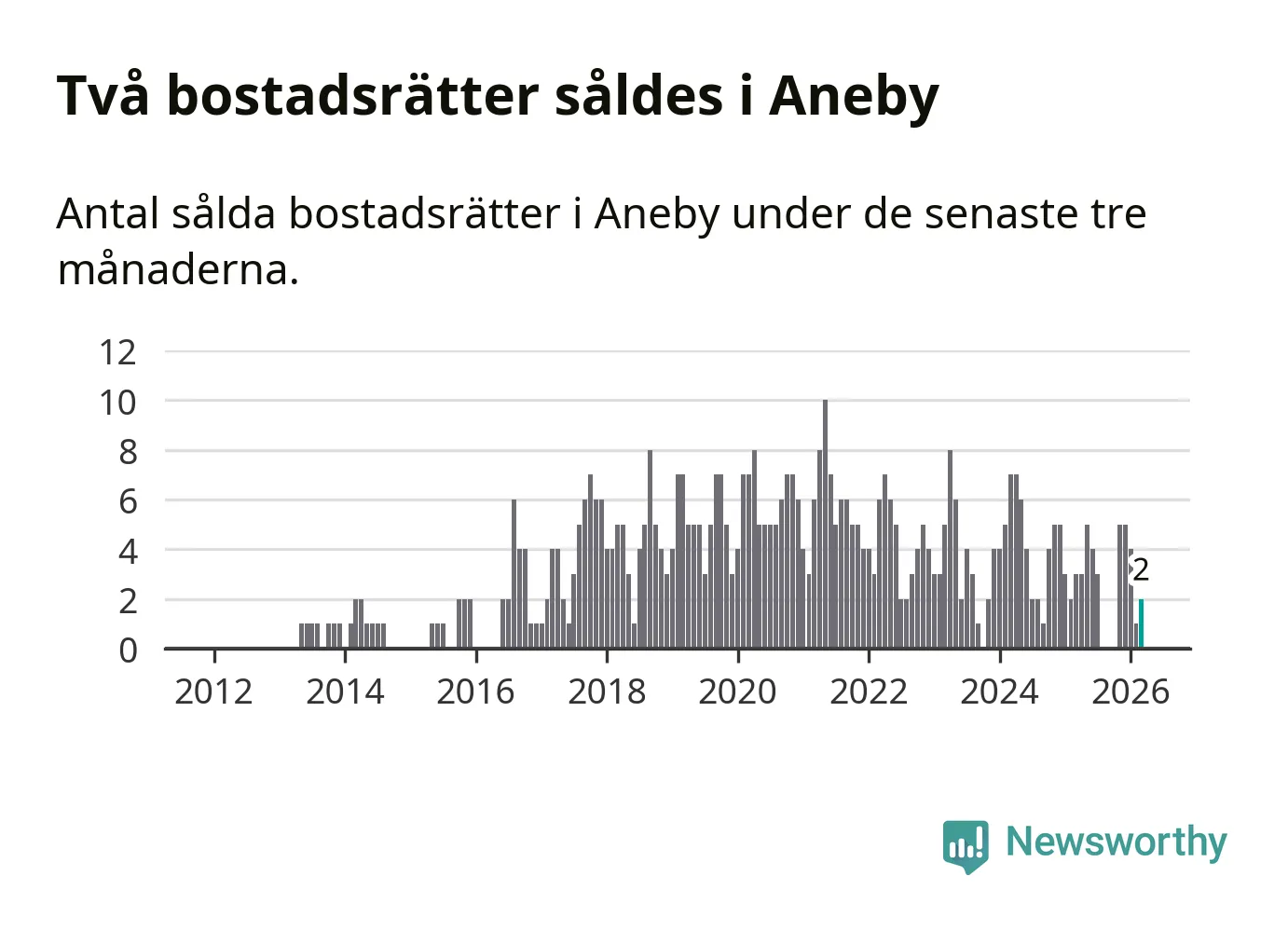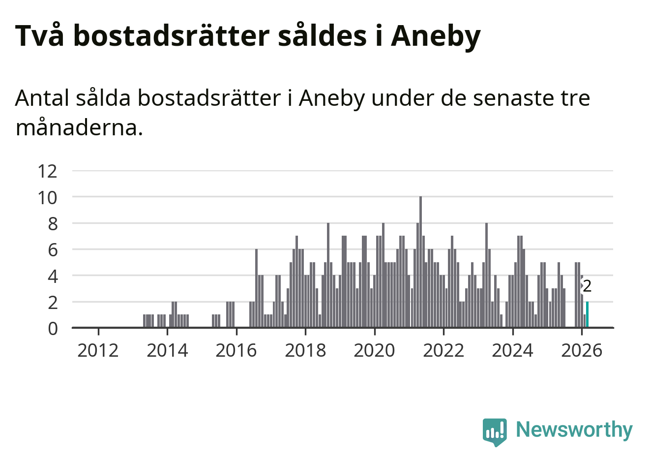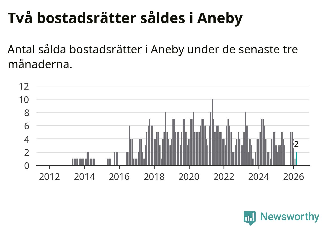 Mellan januari och mars gjordes sammanlagt två affärer med bostadsrätter i Aneby kommun. Det kan jämföras med tre vid motsvarande tid i fjol.