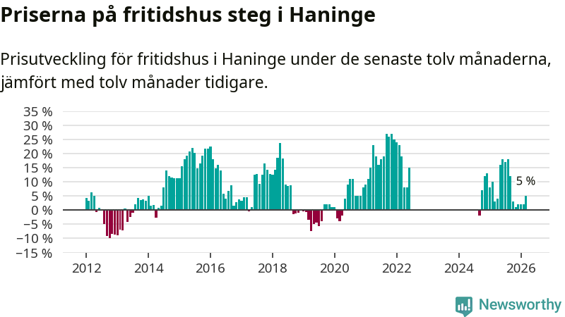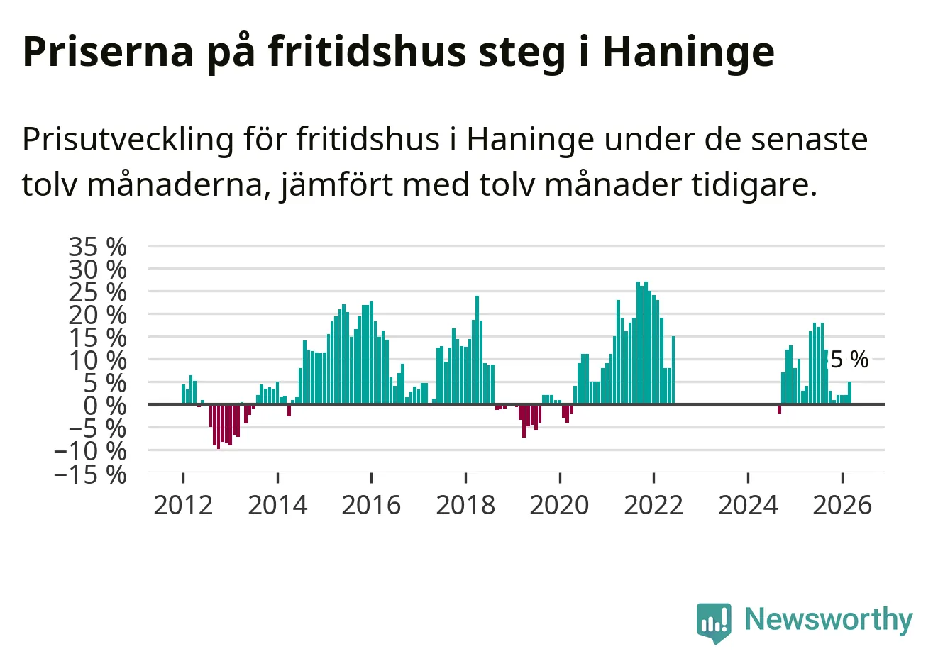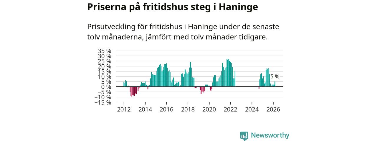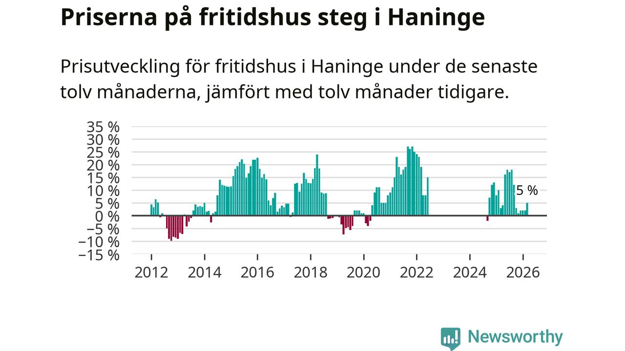 Priserna på fritidshus har gått upp i Haninge kommun. Medelpriset på försäljningarna under de senaste tolv månaderna visar på en uppgång med 5 procent.
