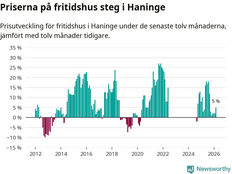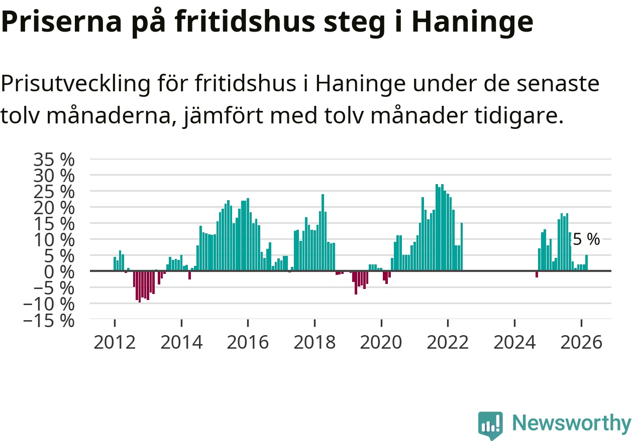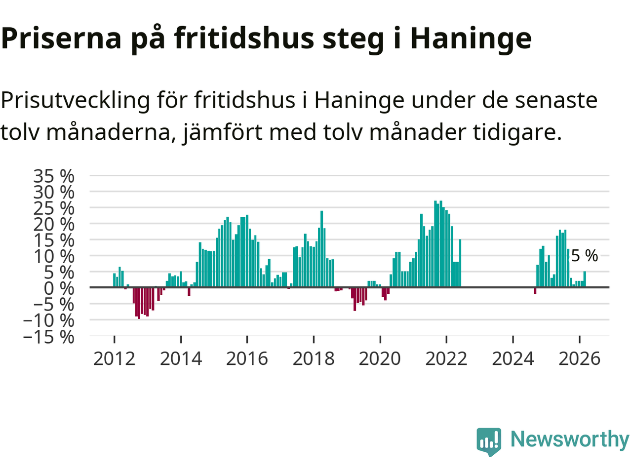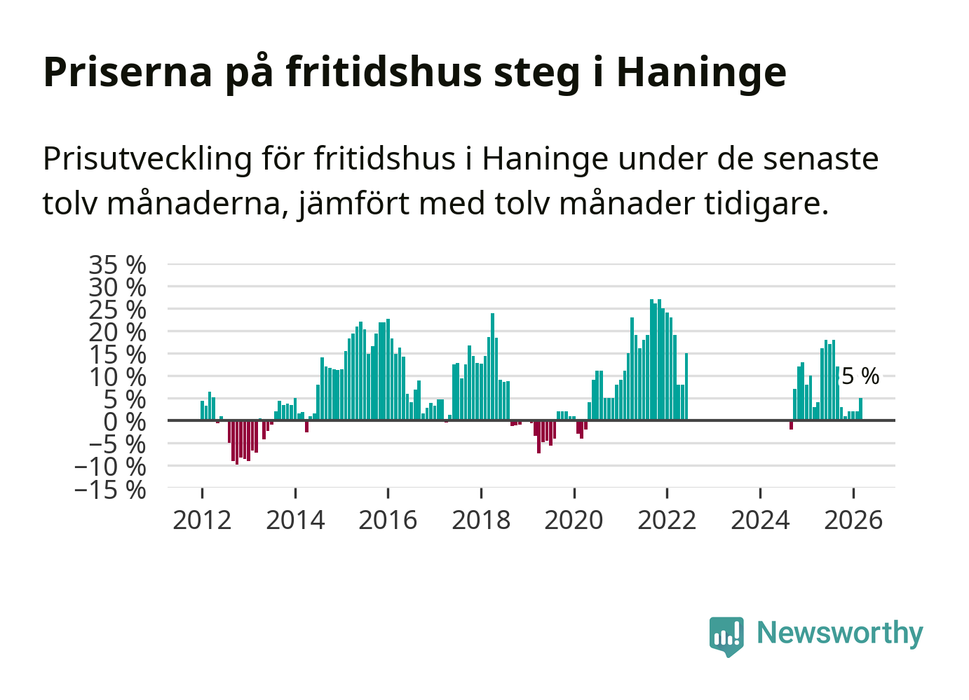Priserna på fritidshus har gått upp i Haninge kommun. Medelpriset på försäljningarna under de senaste tolv månaderna visar på en uppgång med 5 procent.