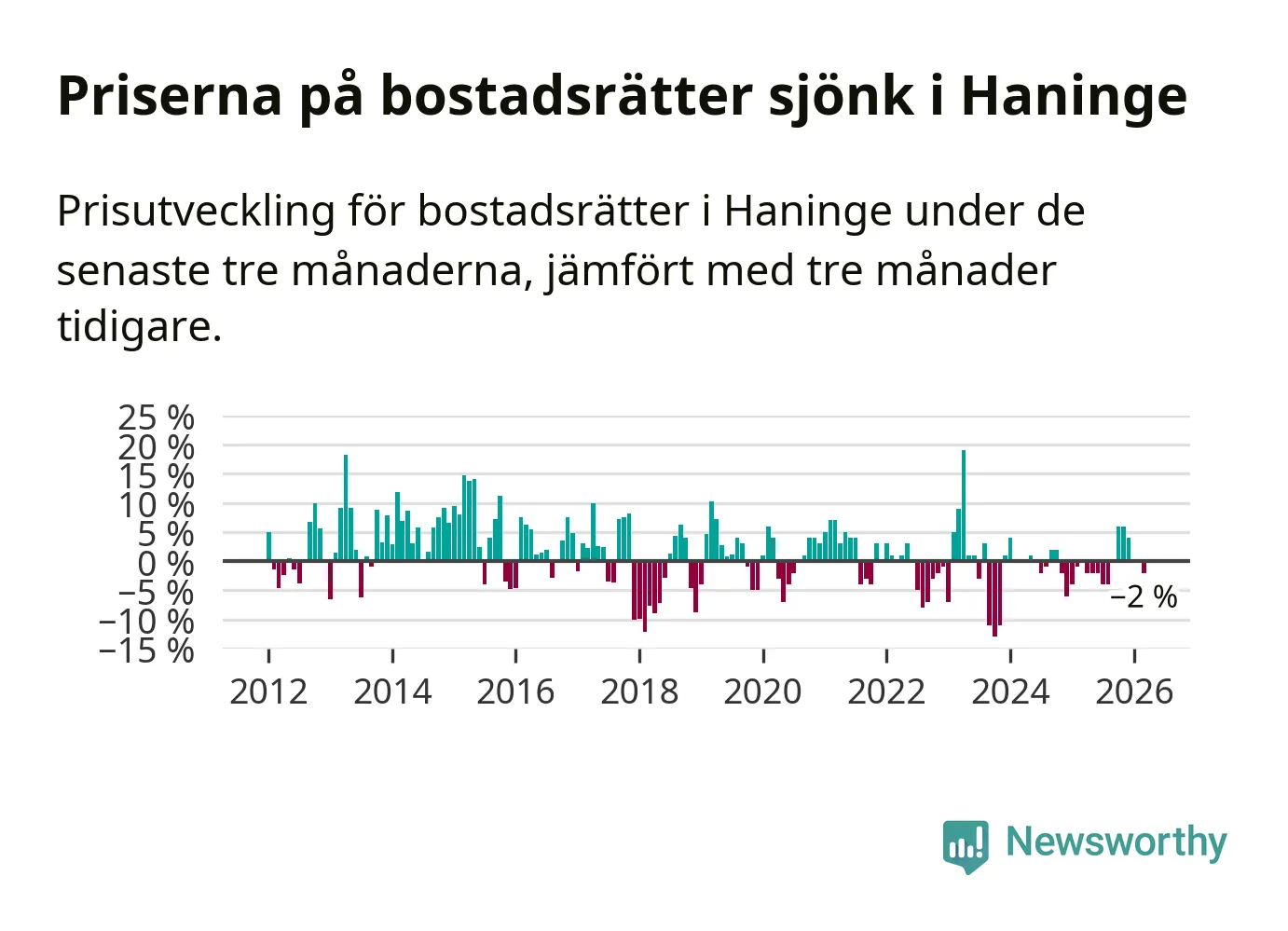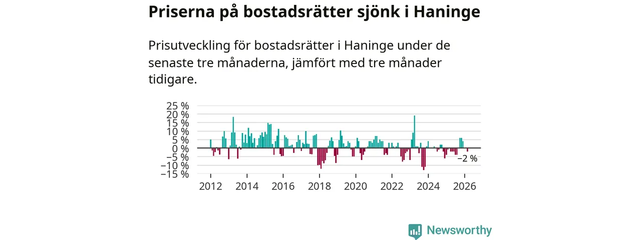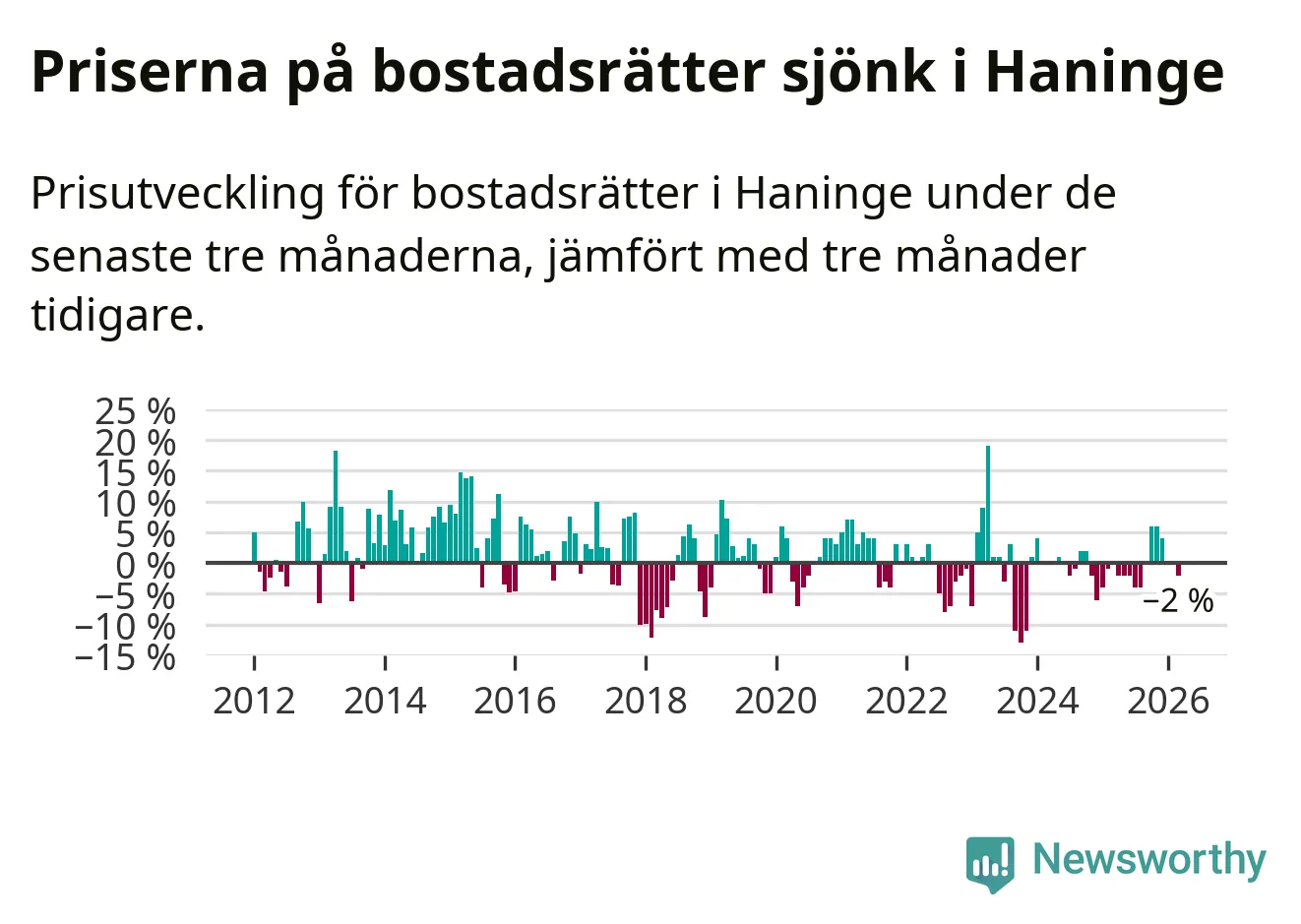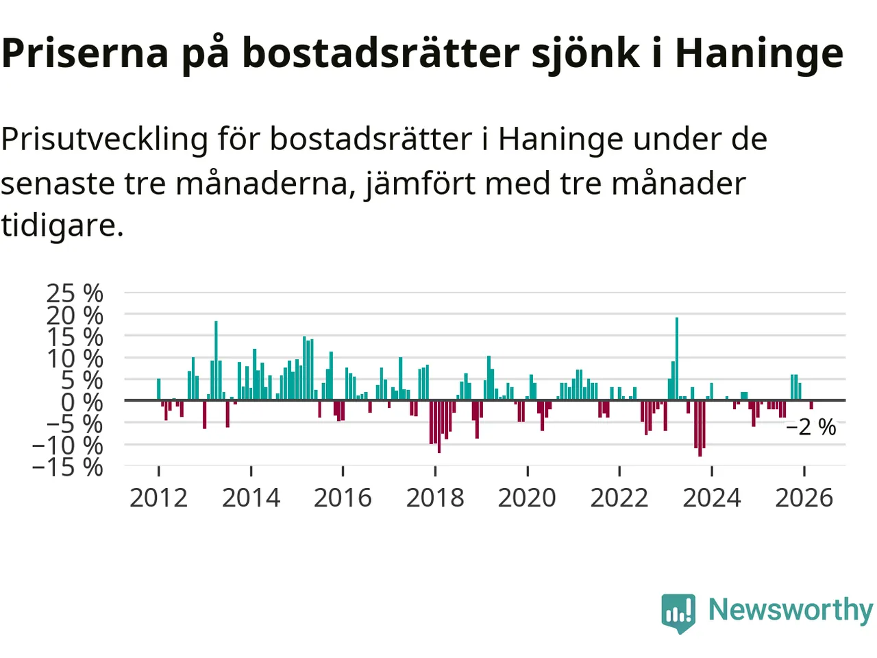 Priserna på bostadsrätter har gått ner i Haninge kommun. Medelpriset på försäljningarna under de senaste tre månaderna visar på en nedgång med 2 procent.