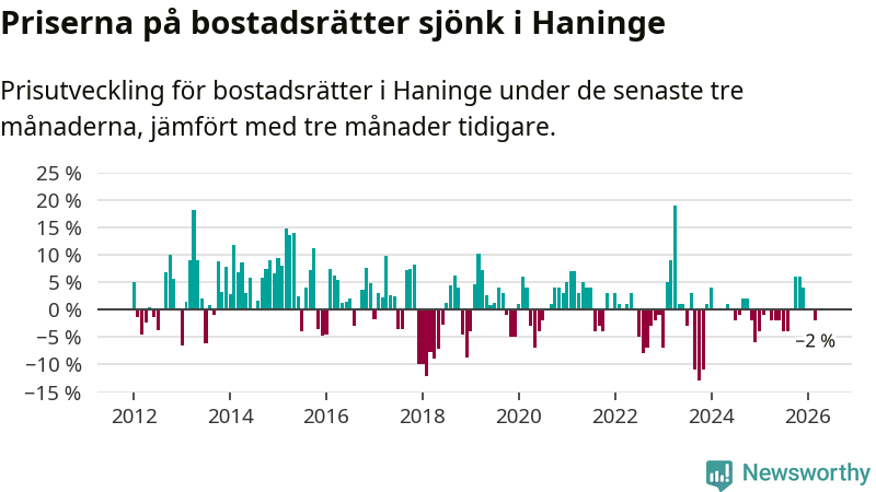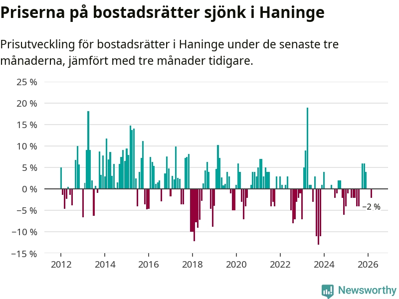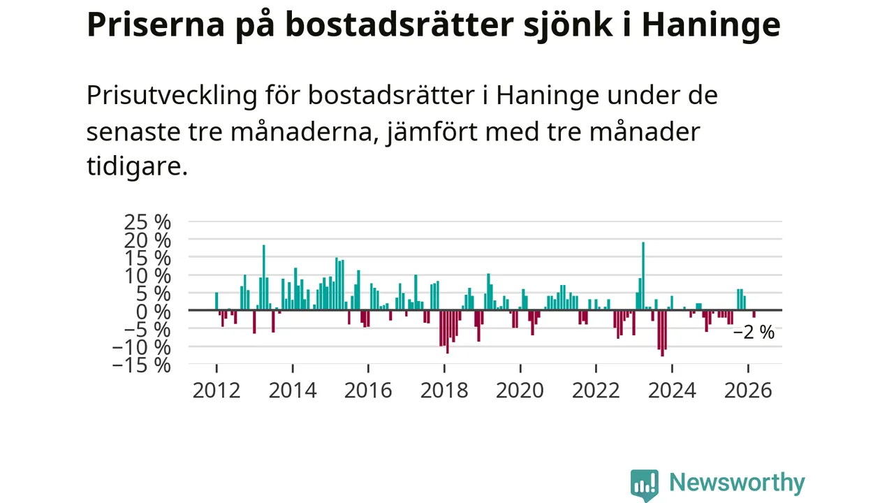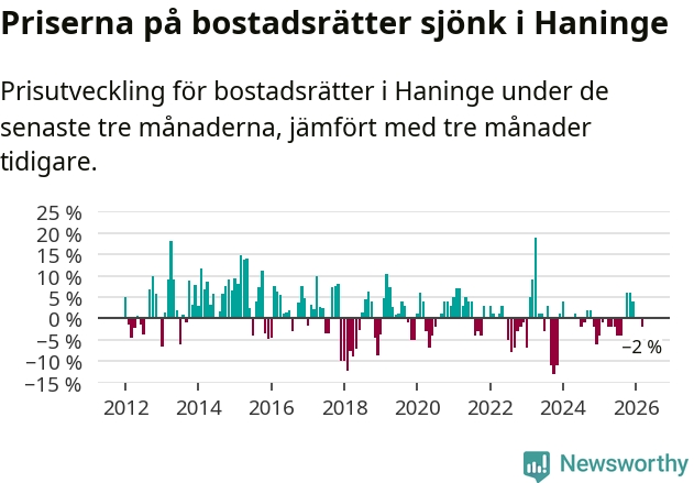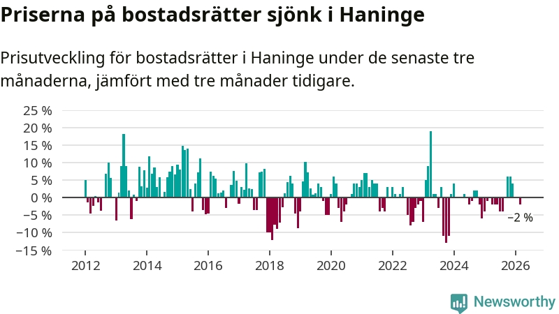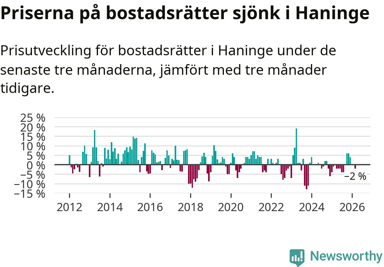 Priserna på bostadsrätter har gått ner i Haninge kommun. Medelpriset på försäljningarna under de senaste tre månaderna visar på en nedgång med 2 procent.