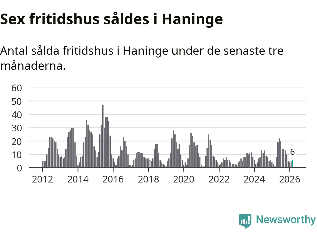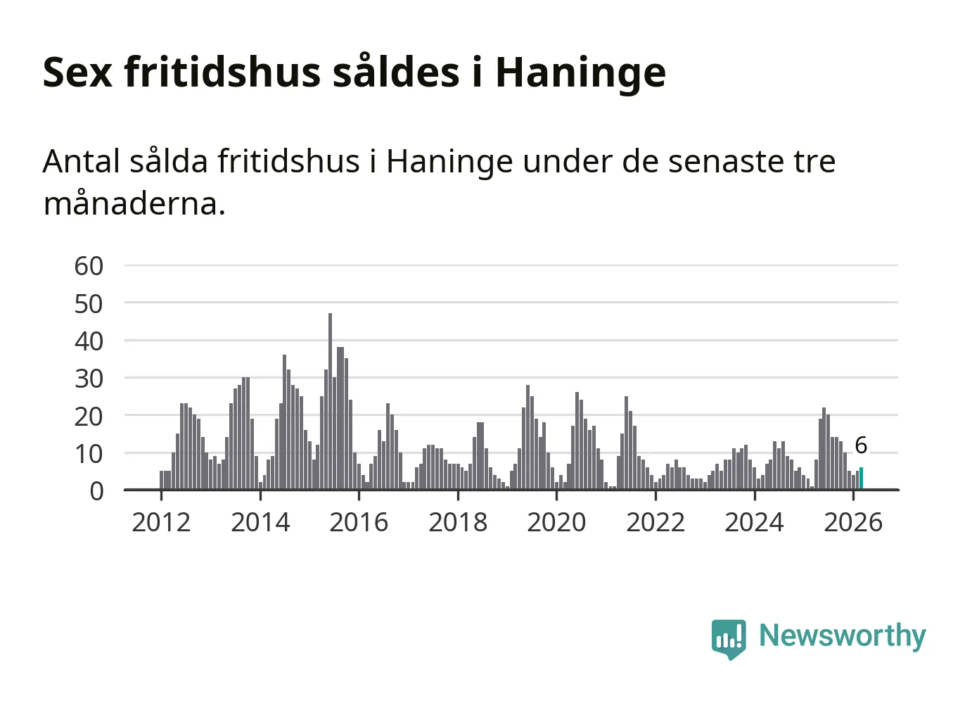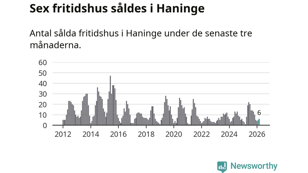 Sammanlagt såldes sex fritidshus i Haninge kommun mellan januari och mars till ett genomsnittligt pris på 4,0 miljoner kronor. I fjol gjordes en affärer vid den här tiden på året.