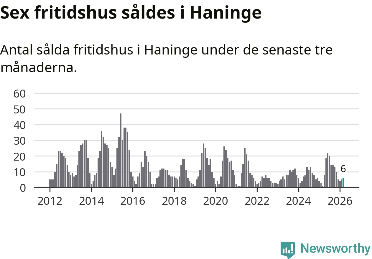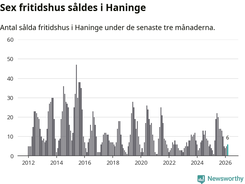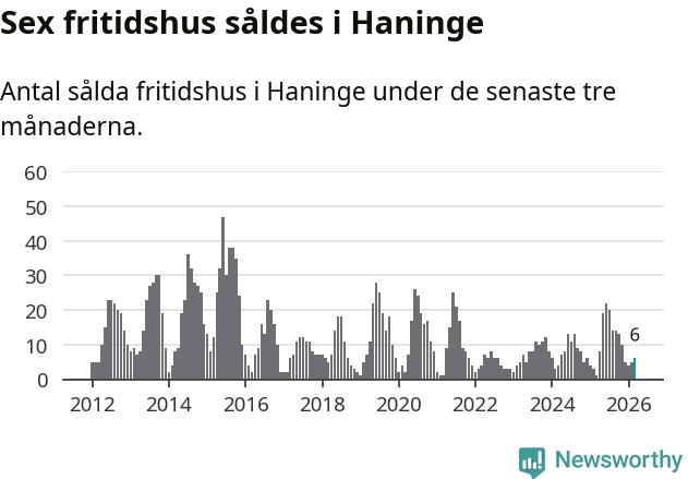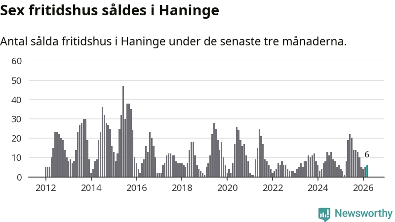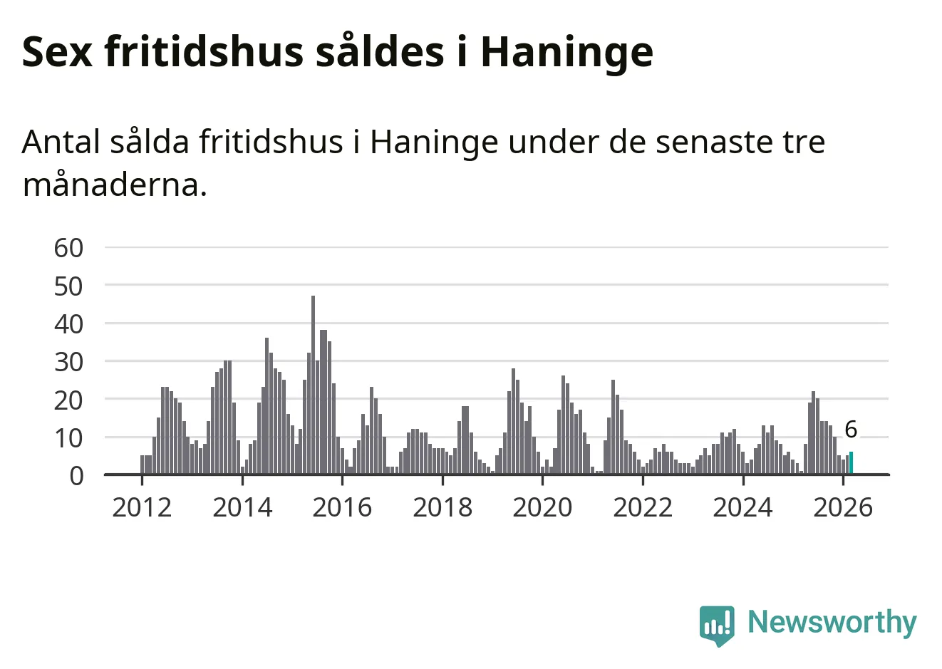 Sammanlagt såldes sex fritidshus i Haninge kommun mellan januari och mars till ett genomsnittligt pris på 4,0 miljoner kronor. I fjol gjordes en affärer vid den här tiden på året.