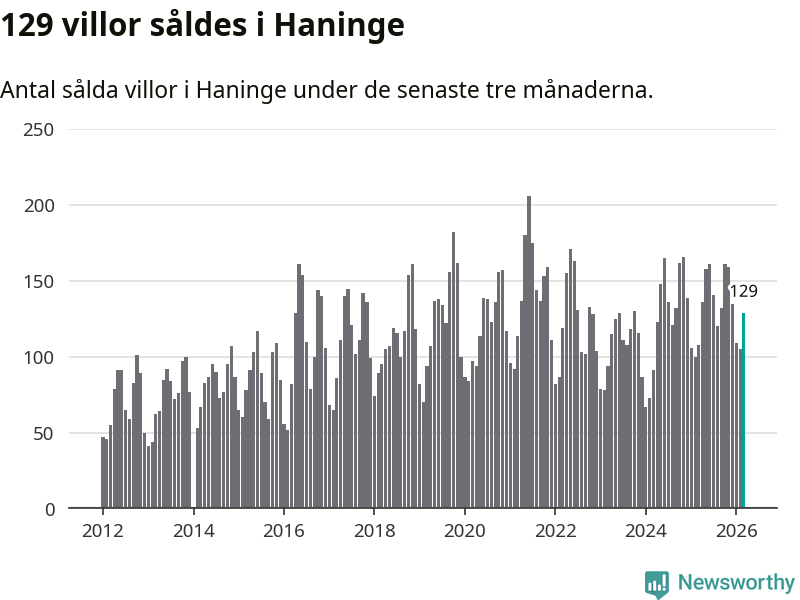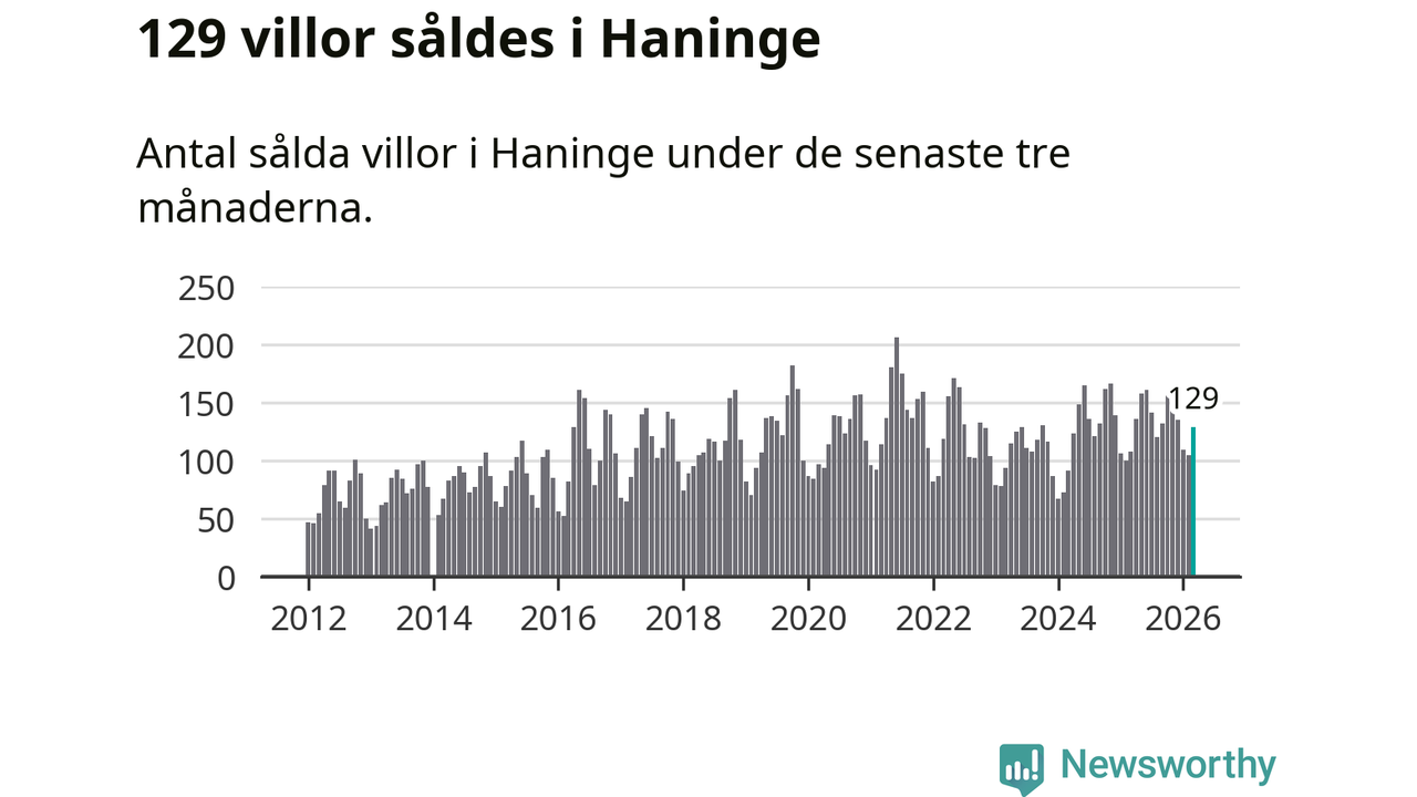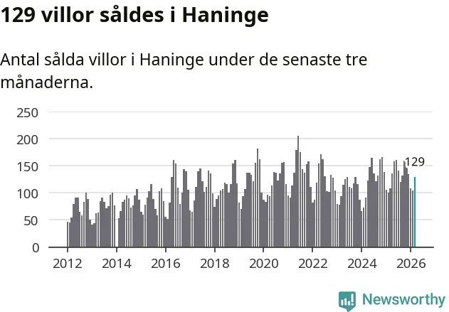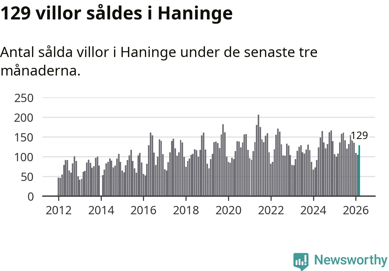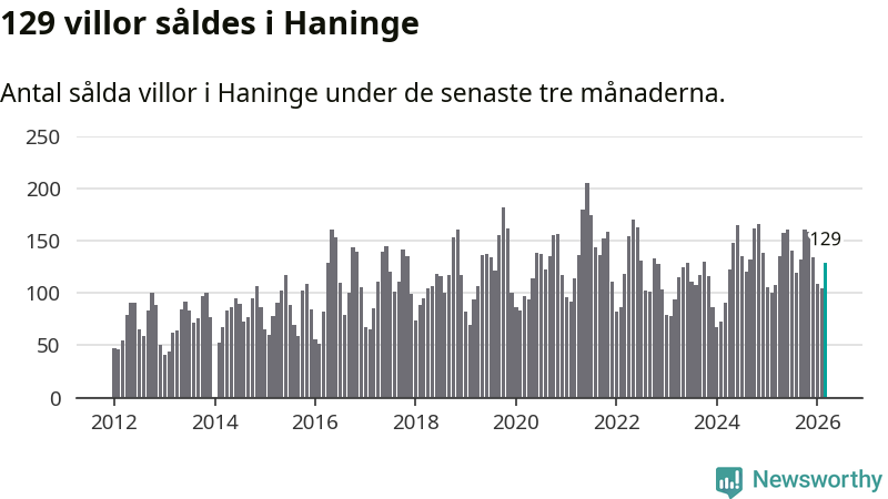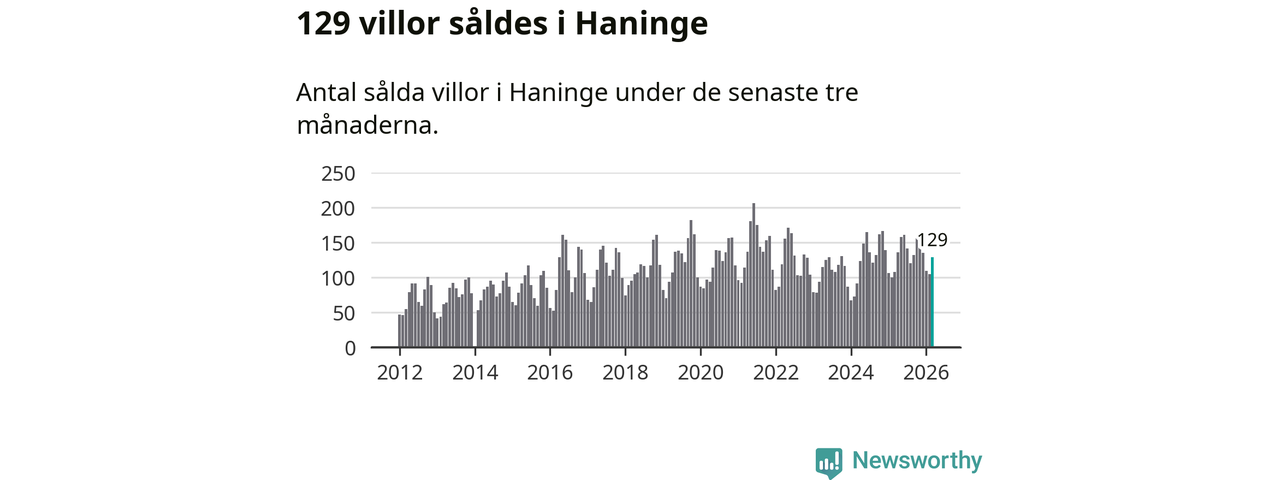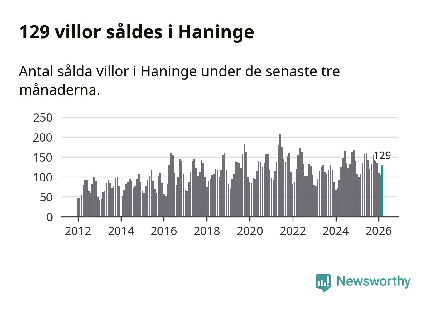 Sammanlagt såldes 129 villor i Haninge kommun mellan januari och mars till ett genomsnittligt pris på 5,5 miljoner kronor. I fjol gjordes 108 affärer vid den här tiden på året.