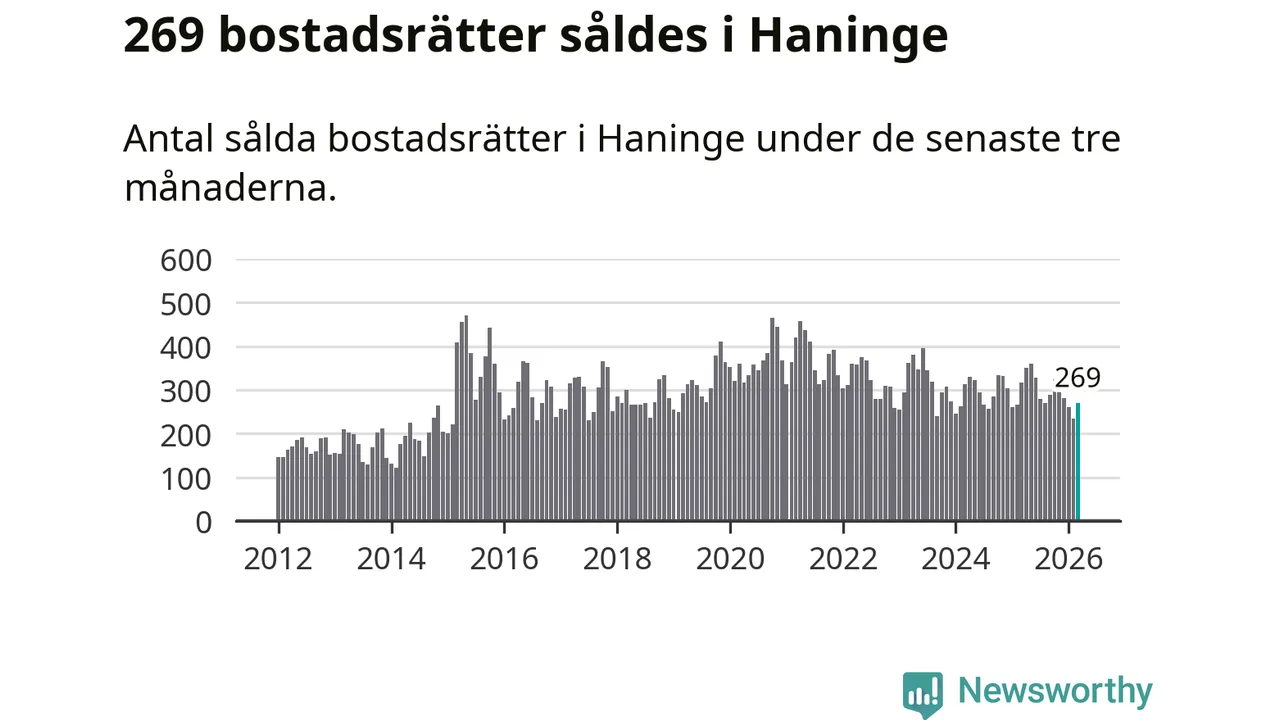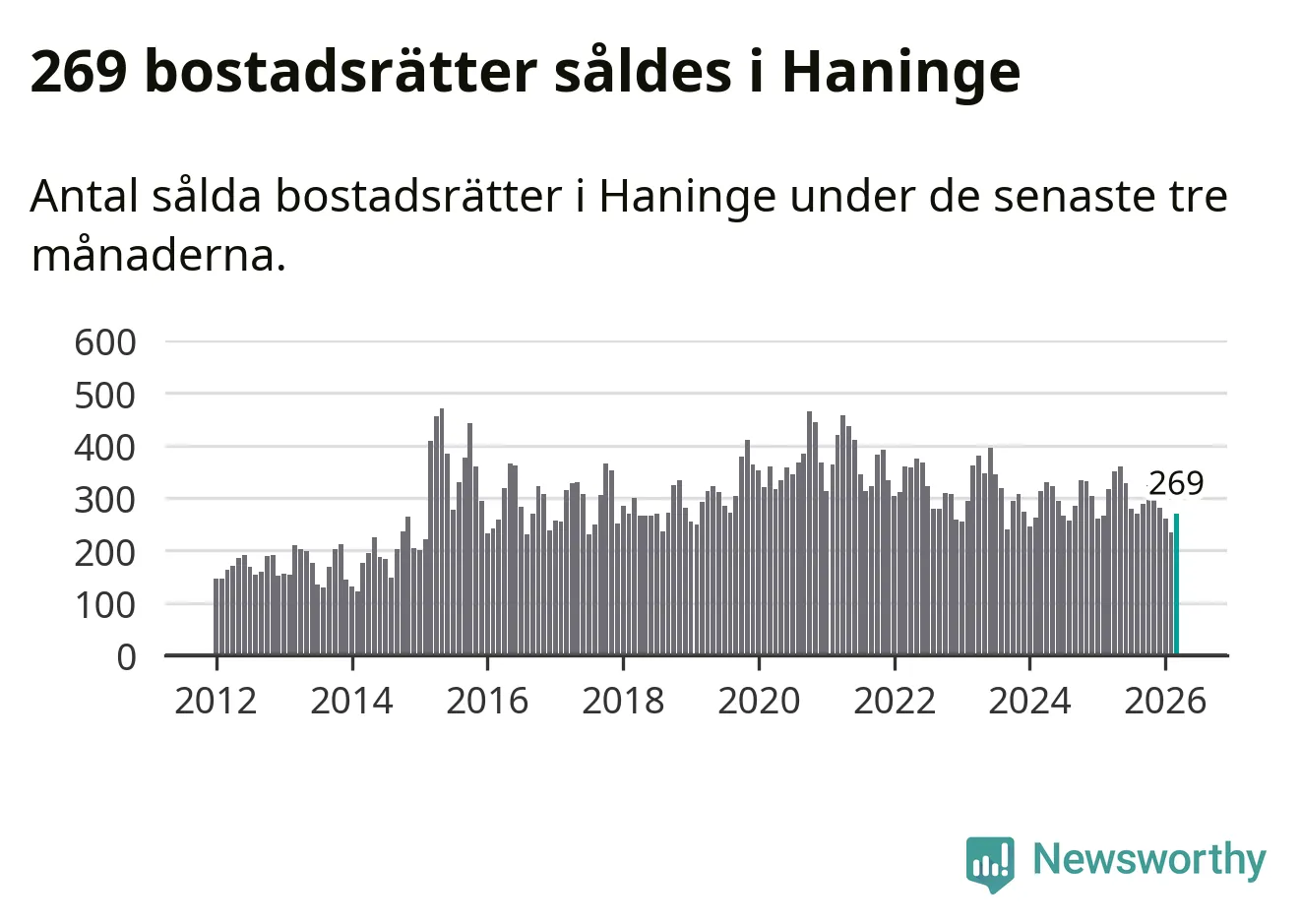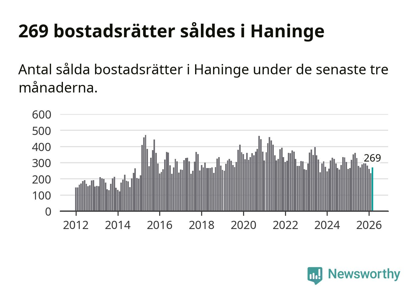 Sammanlagt såldes 269 bostadsrätter i Haninge kommun mellan januari och mars till ett genomsnittligt pris på 2,3 miljoner kronor. I fjol gjordes 317 affärer vid den här tiden på året.