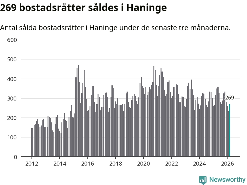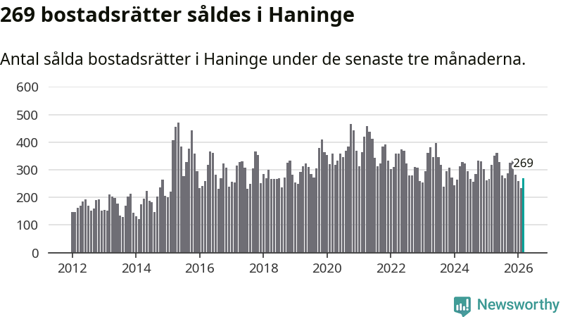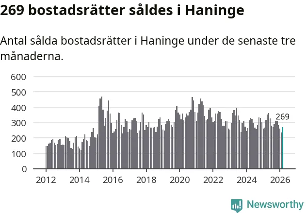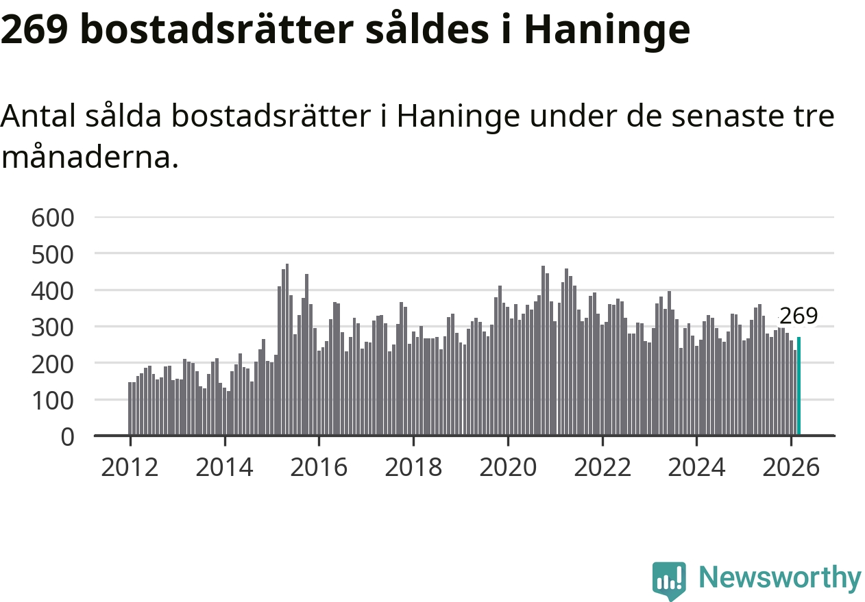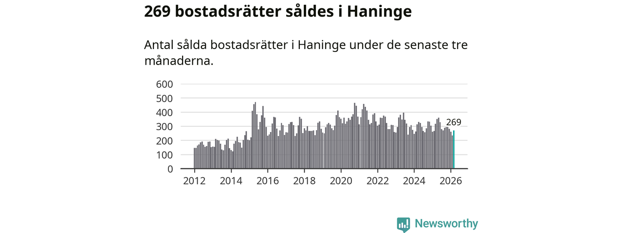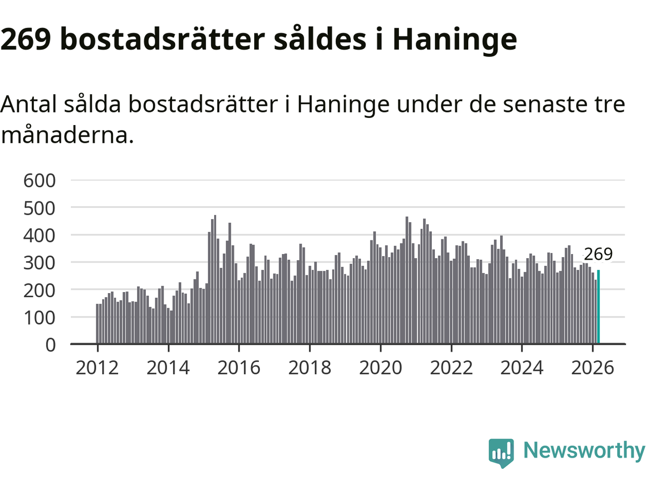 Sammanlagt såldes 269 bostadsrätter i Haninge kommun mellan januari och mars till ett genomsnittligt pris på 2,3 miljoner kronor. I fjol gjordes 317 affärer vid den här tiden på året.