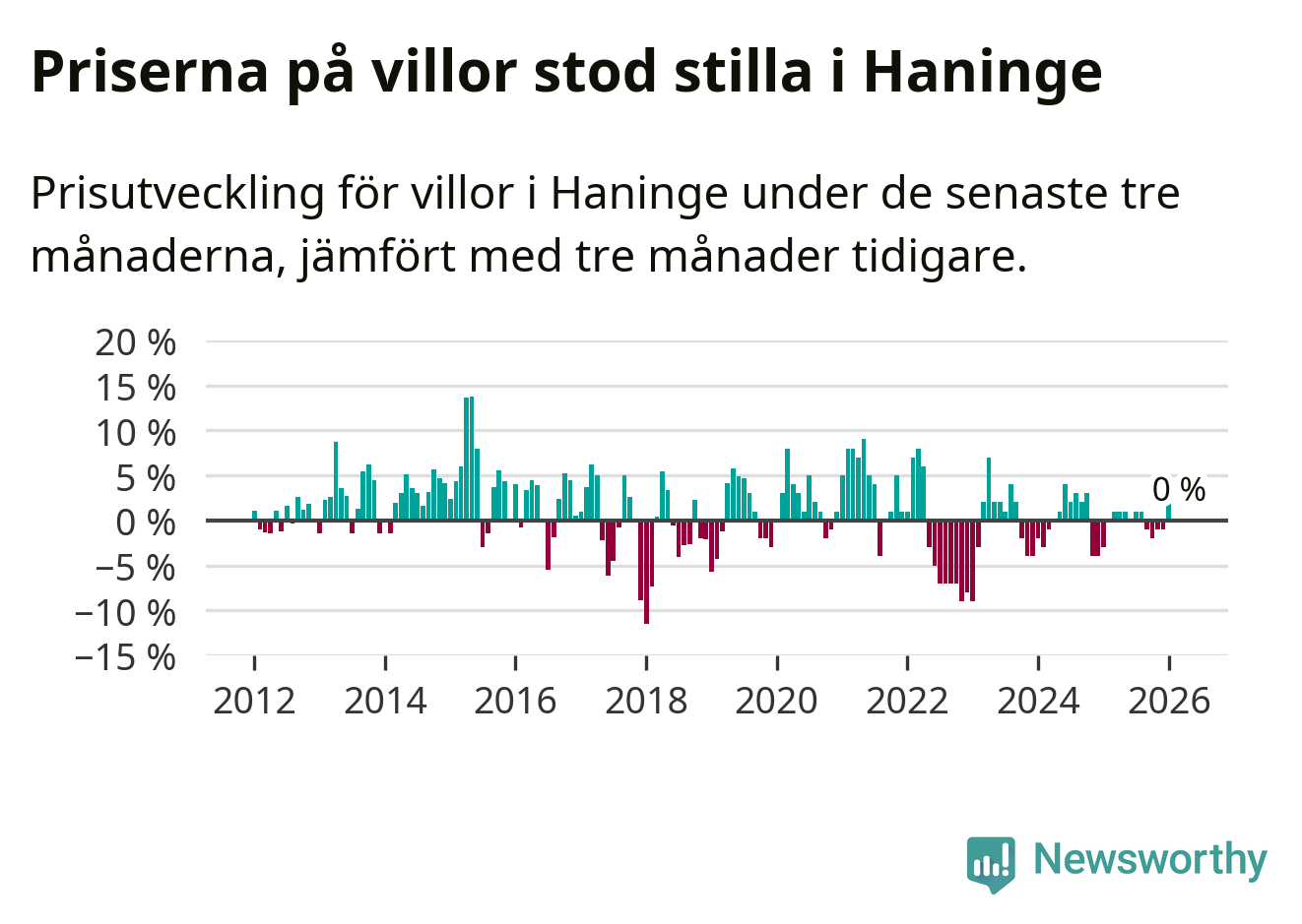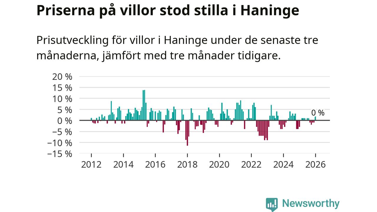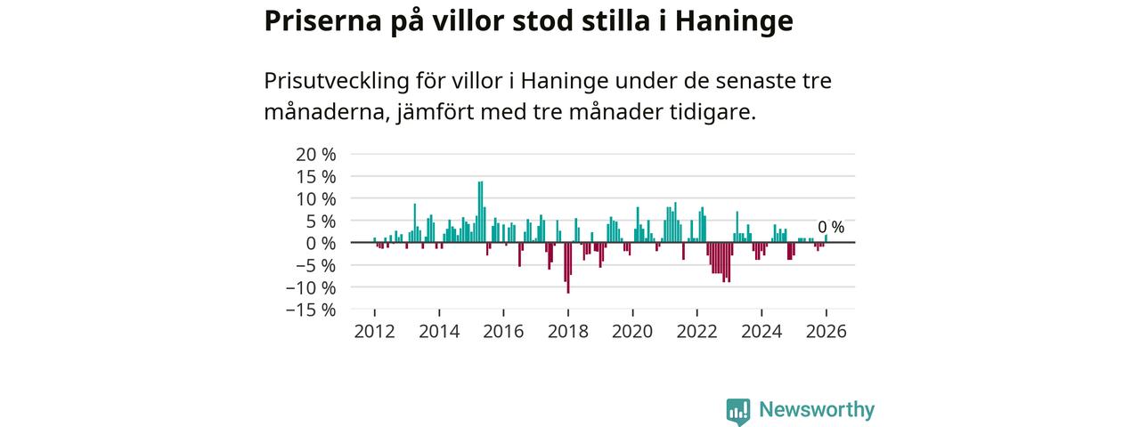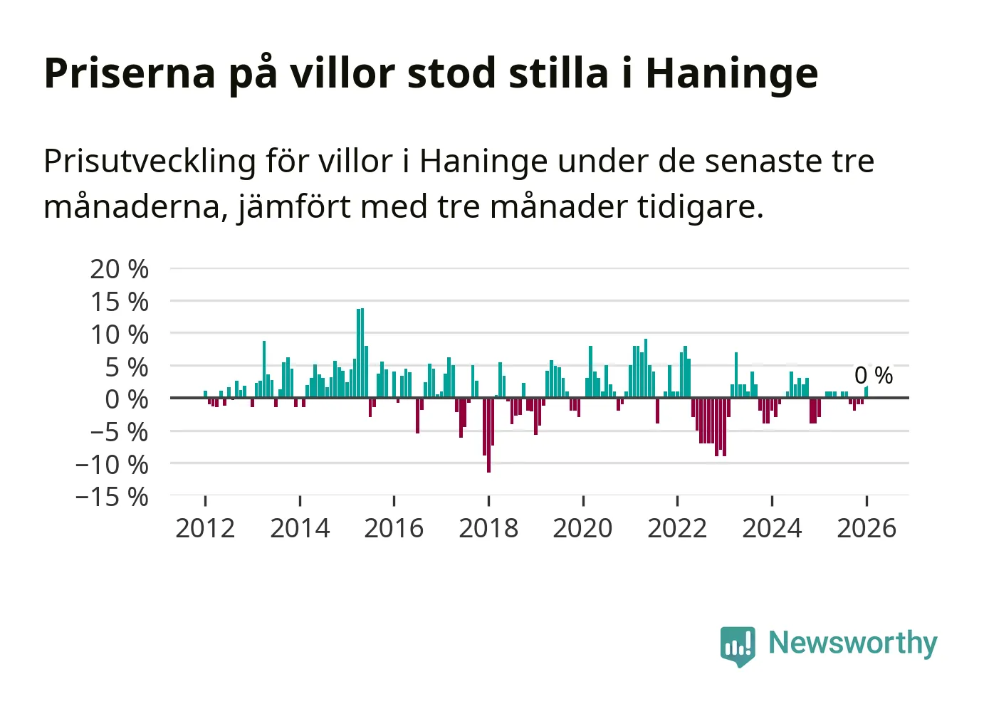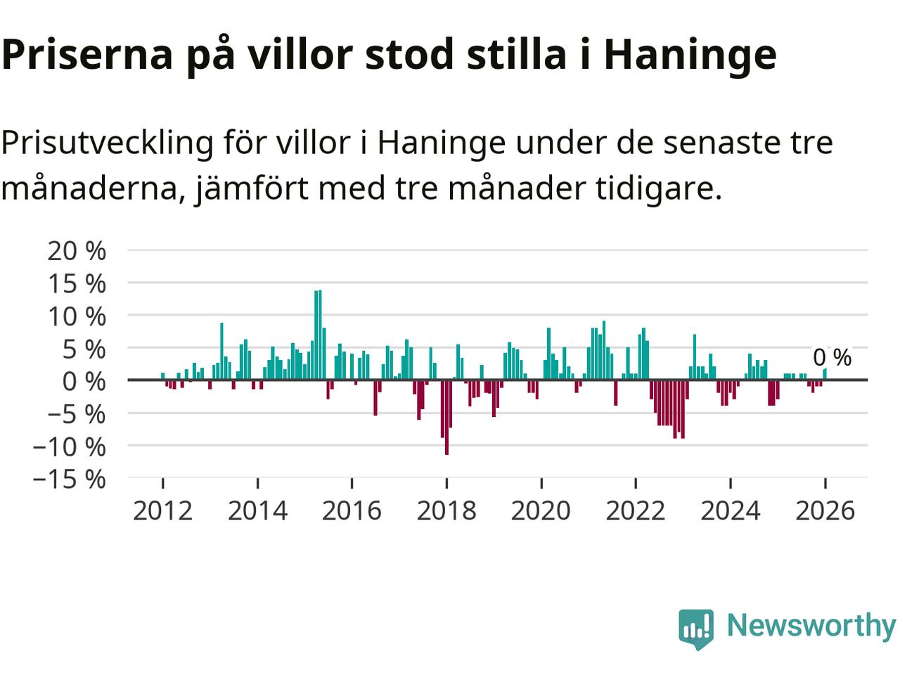 Villapriserna står i stort sett stilla i Haninge kommun. Medelpriset på de på försäljningarna under de senaste tre månaderna låg på samma nivå som för tre månader sedan.