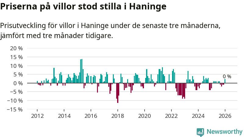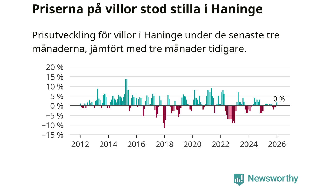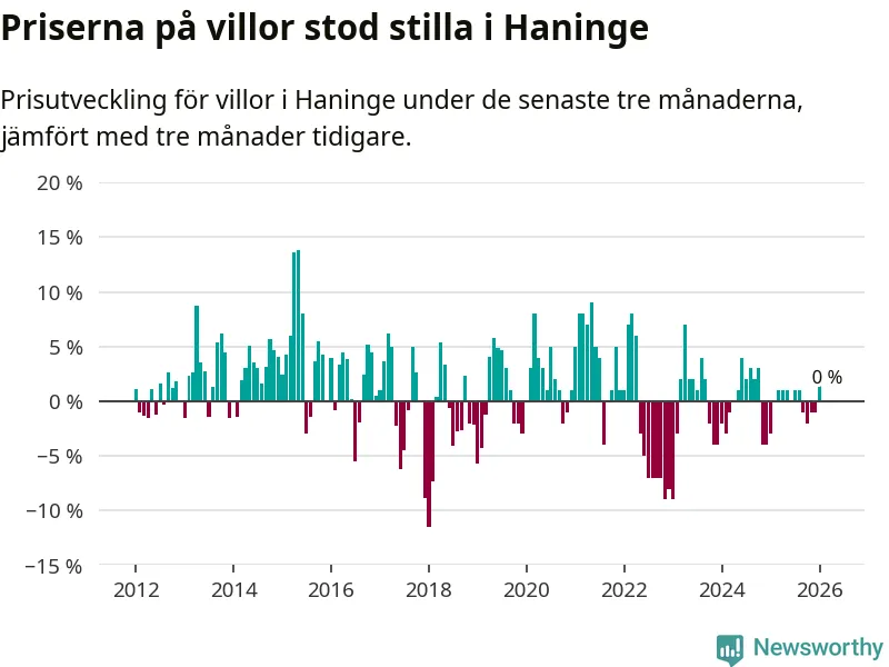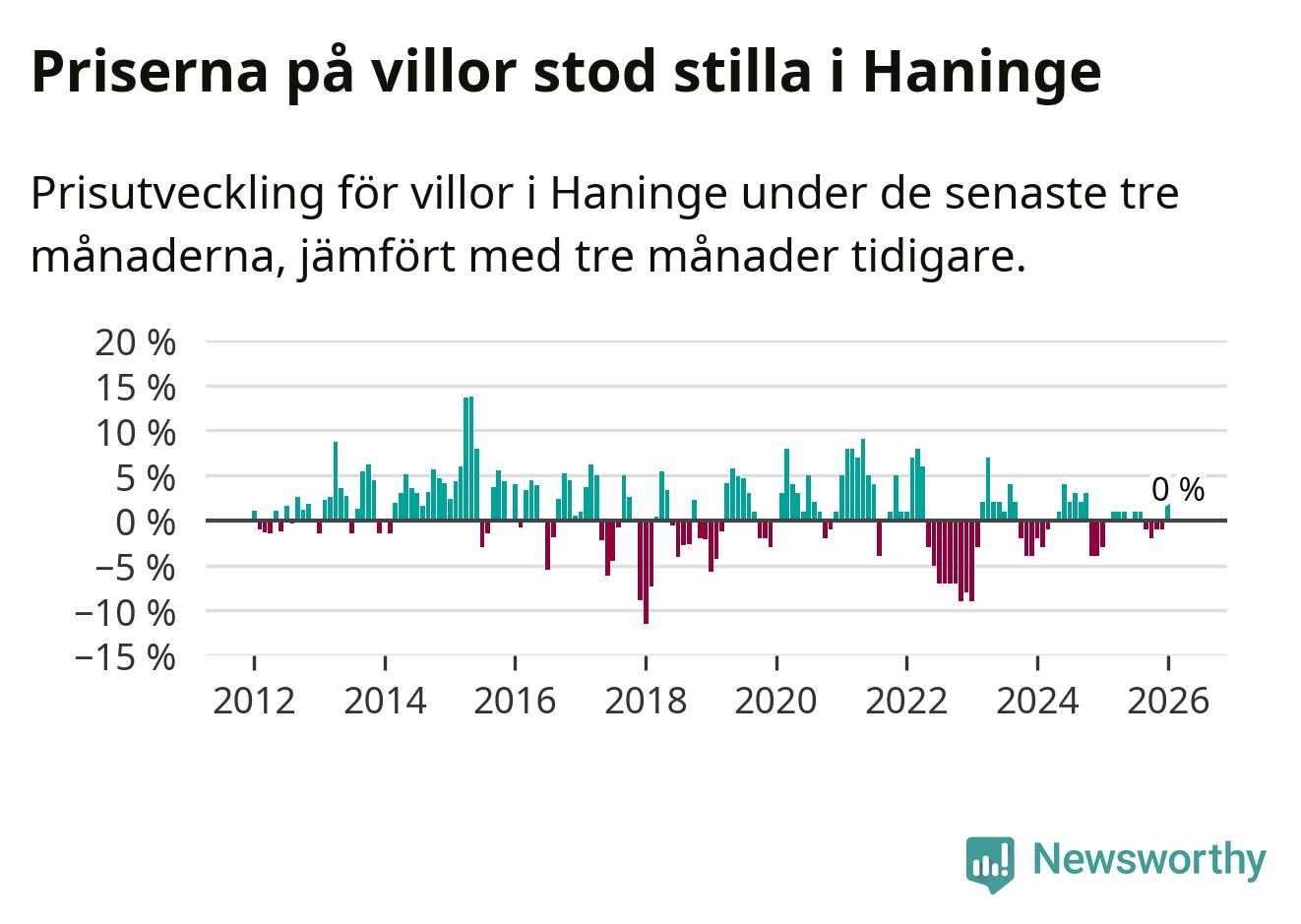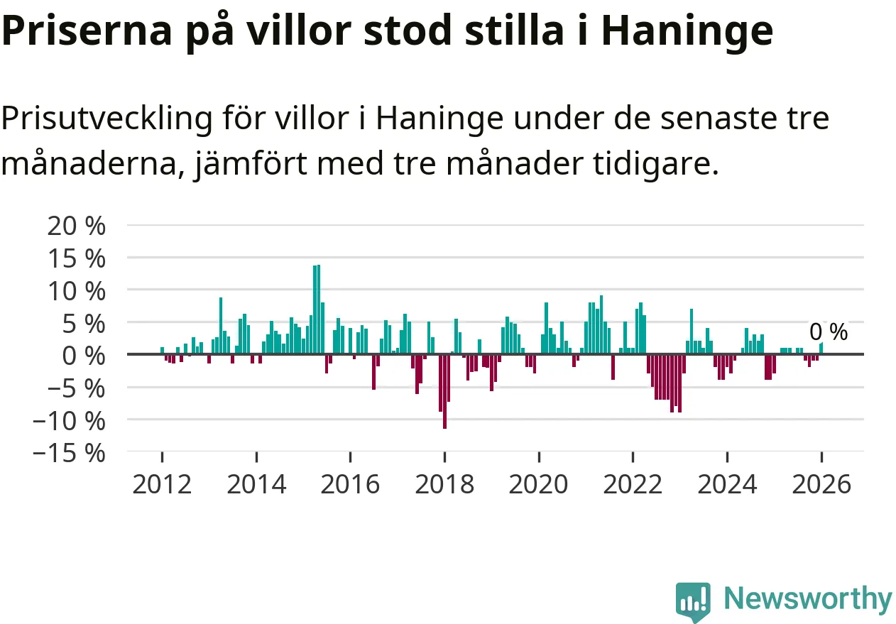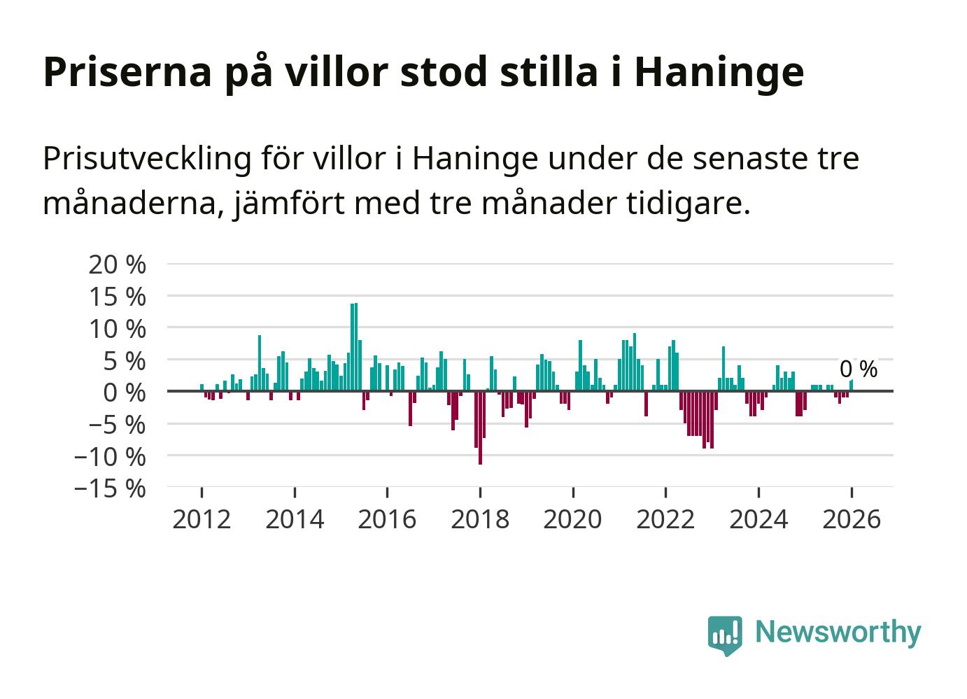 Villapriserna står i stort sett stilla i Haninge kommun. Medelpriset på de på försäljningarna under de senaste tre månaderna låg på samma nivå som för tre månader sedan.