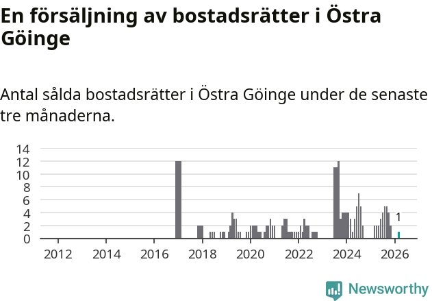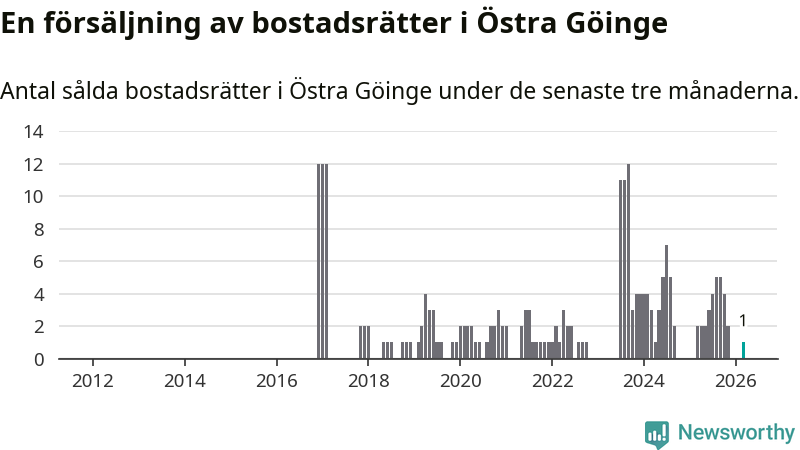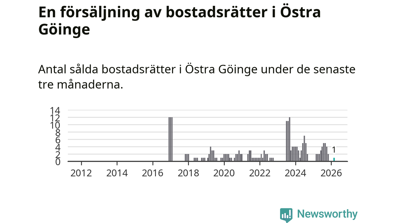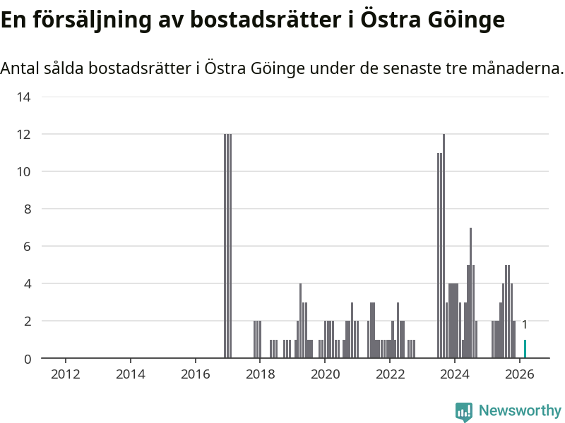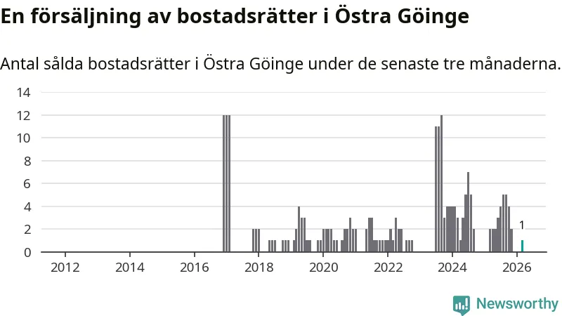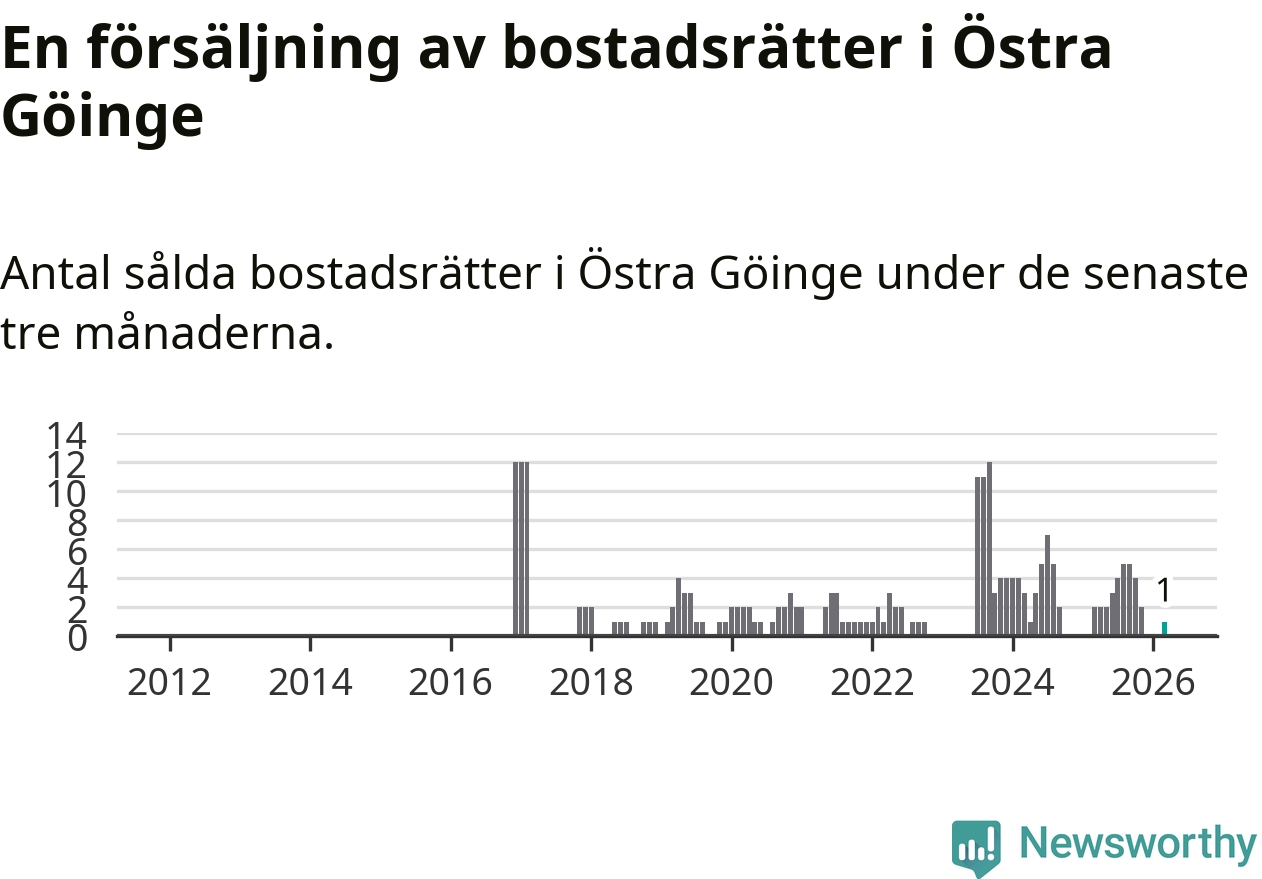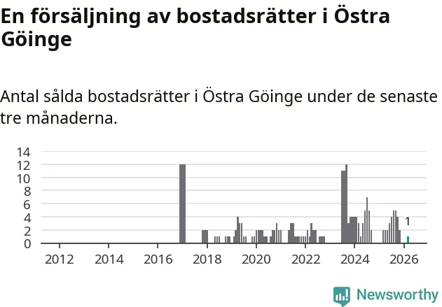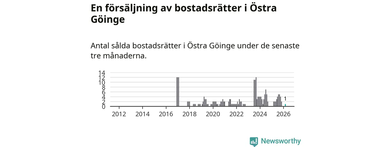 Mellan januari och mars gjordes sammanlagt en affär med bostadsrätter i Östra Göinge kommun. Det kan jämföras med två vid motsvarande tid i fjol.