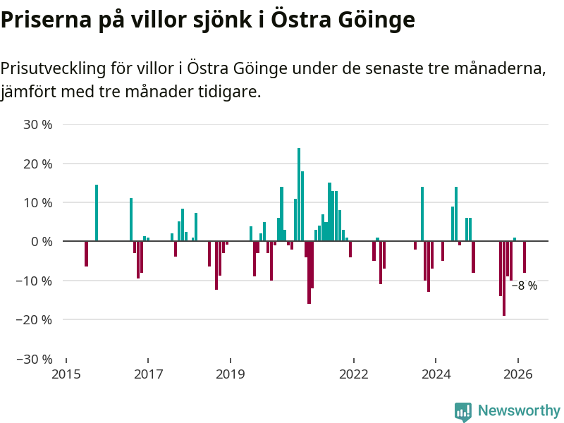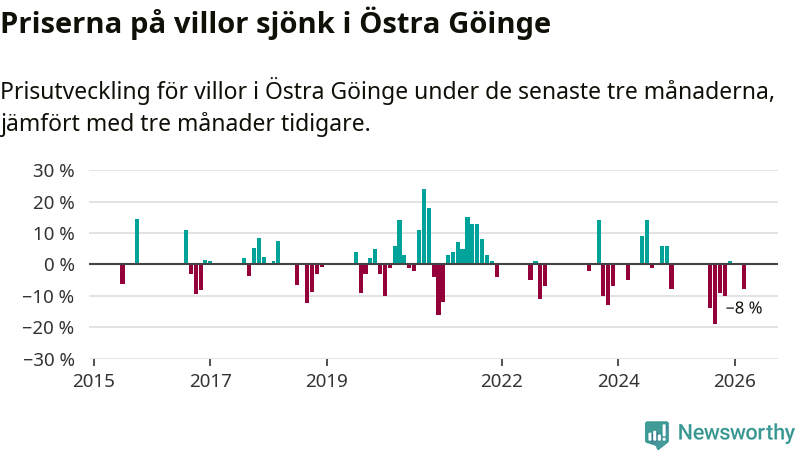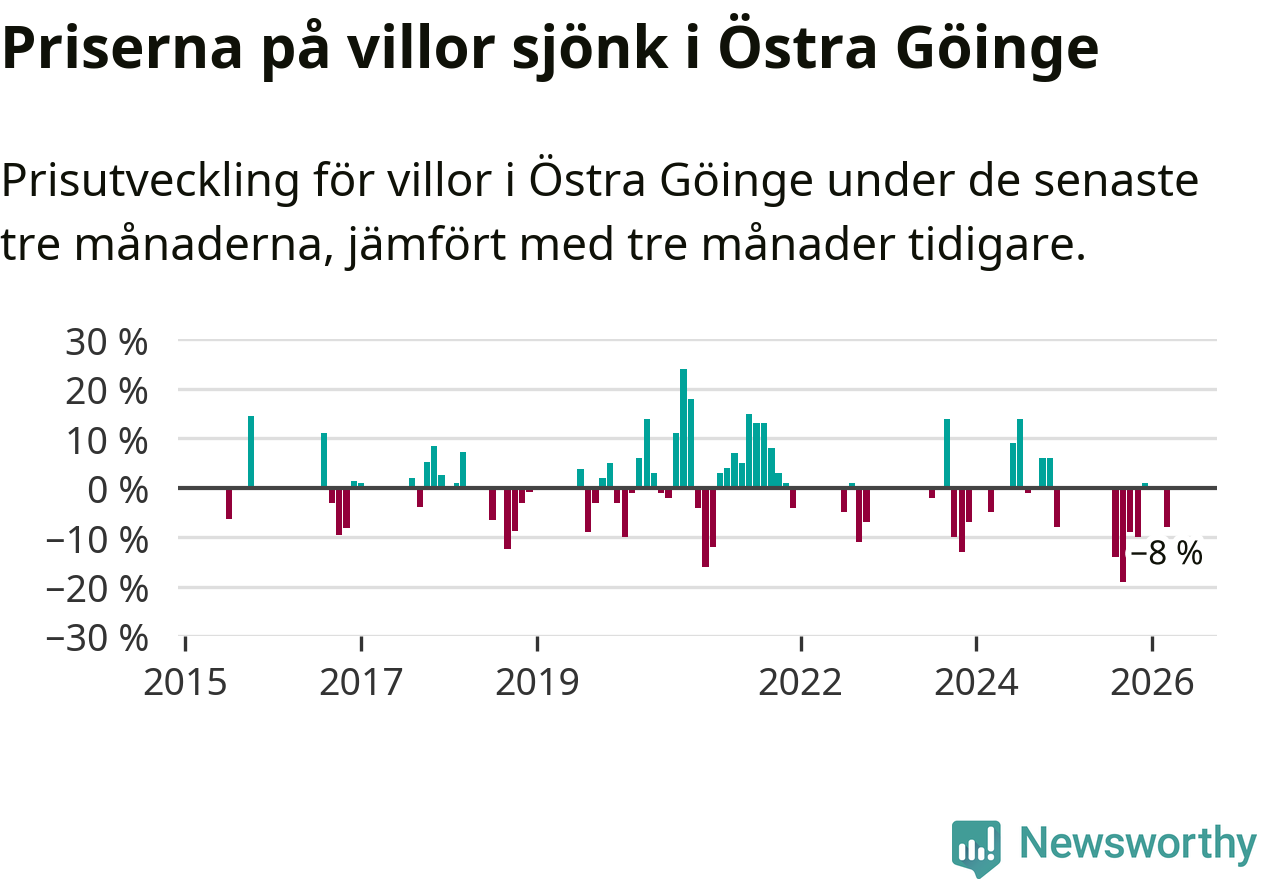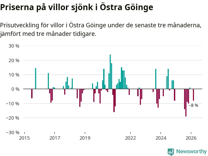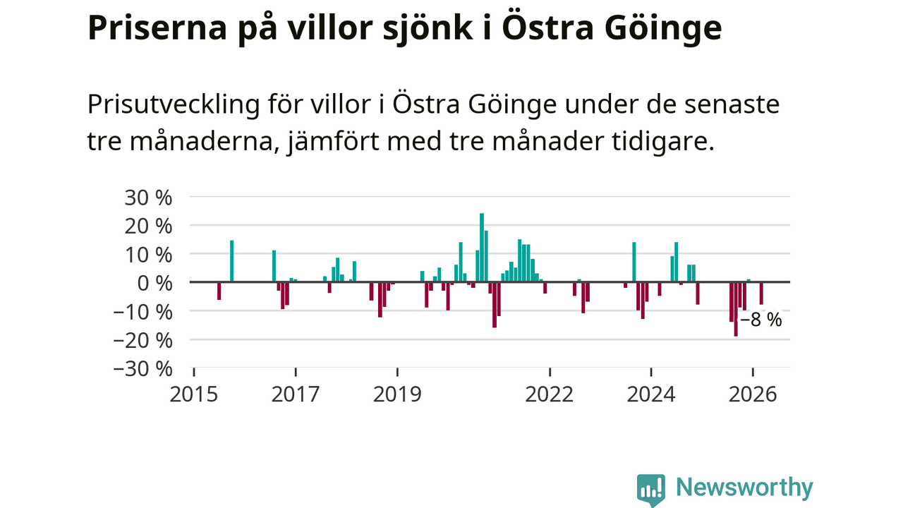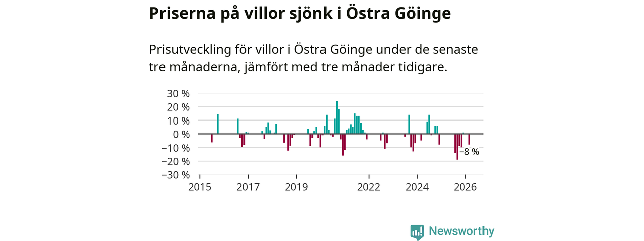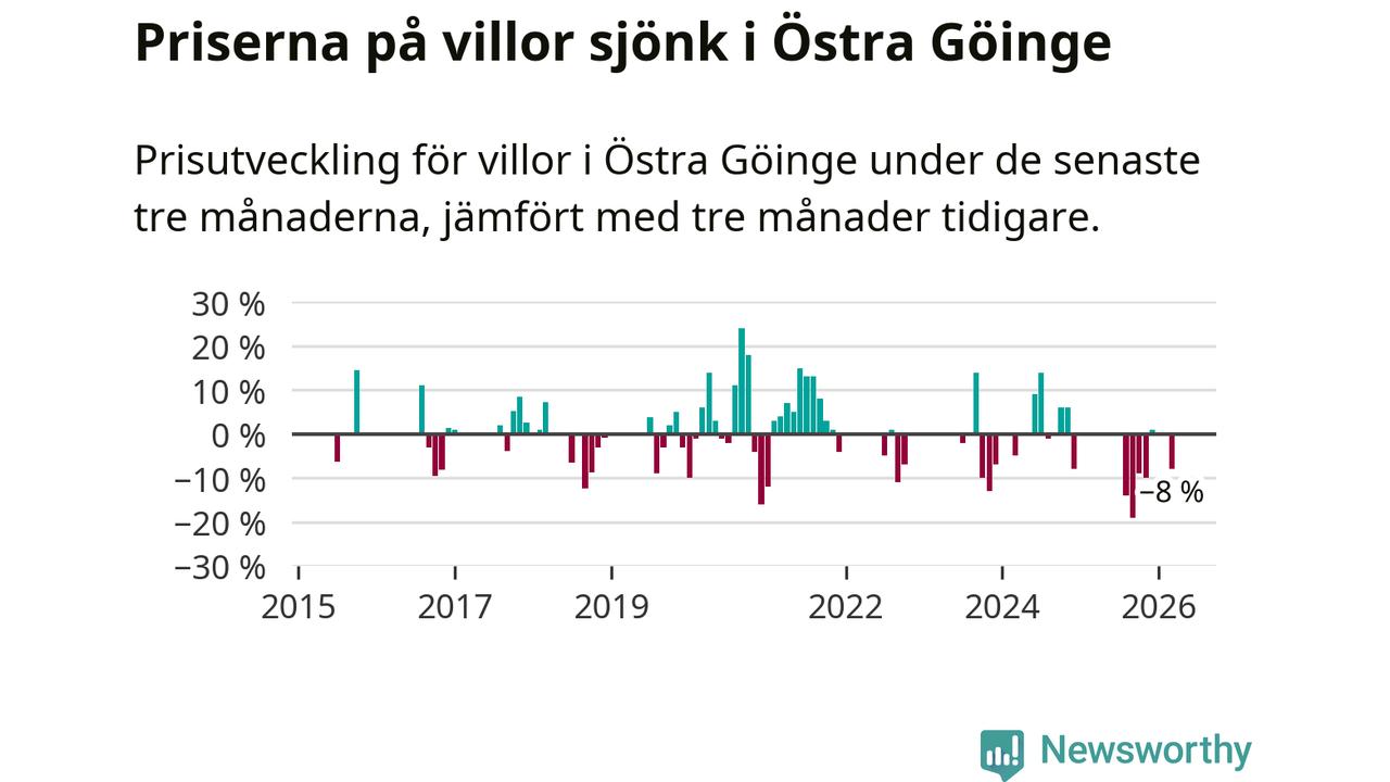 Statistiken visar även på en stor prisnedgång i Östra Göinge kommun. Medelpriset på försäljningarna av villor i kommunen var 8 procent lägre än för tre månader sedan. I hela Skåne däremot ligger villapriserna stilla.