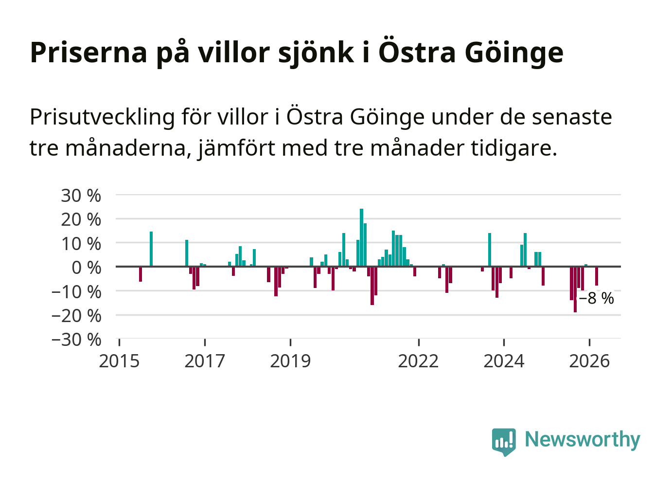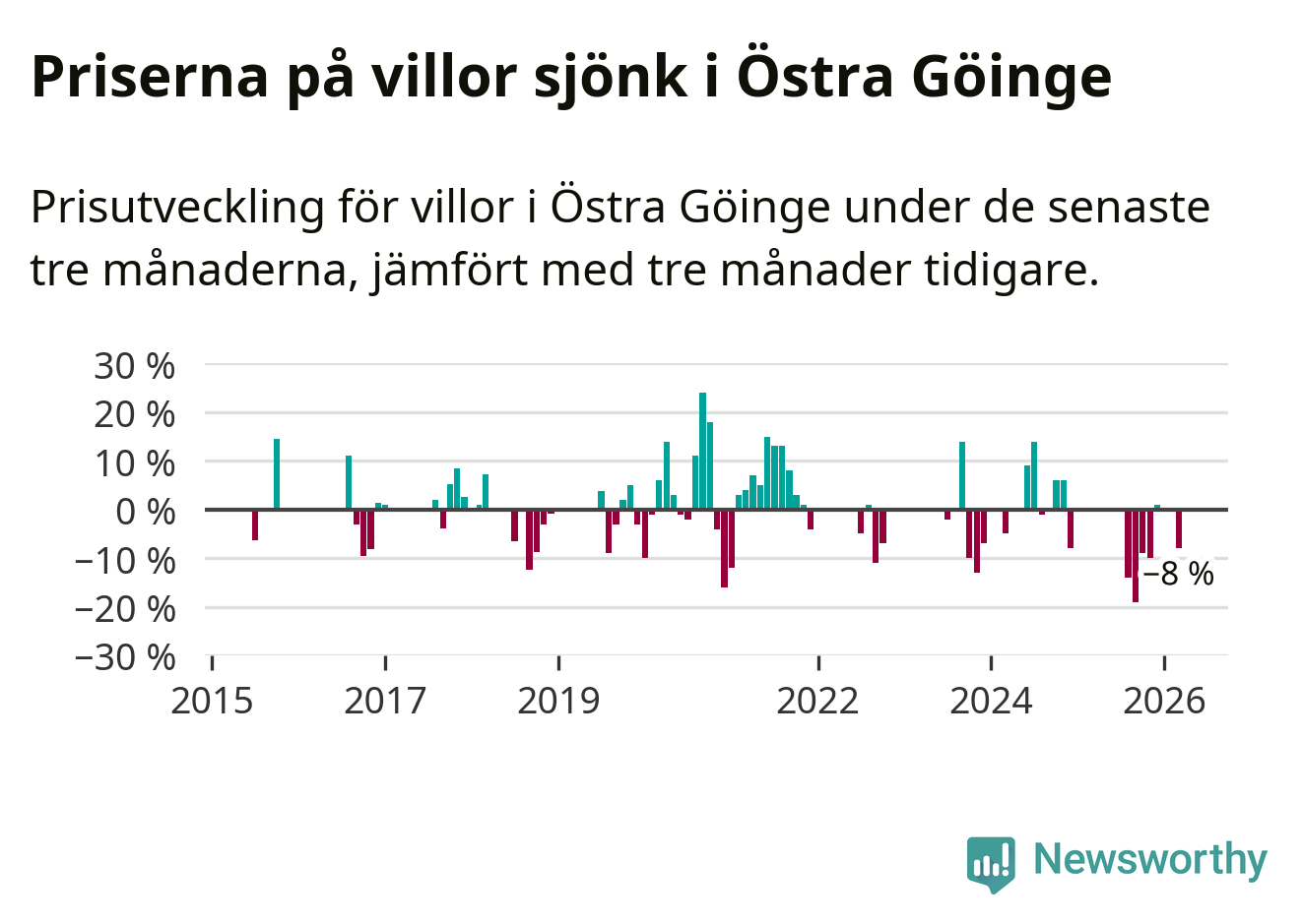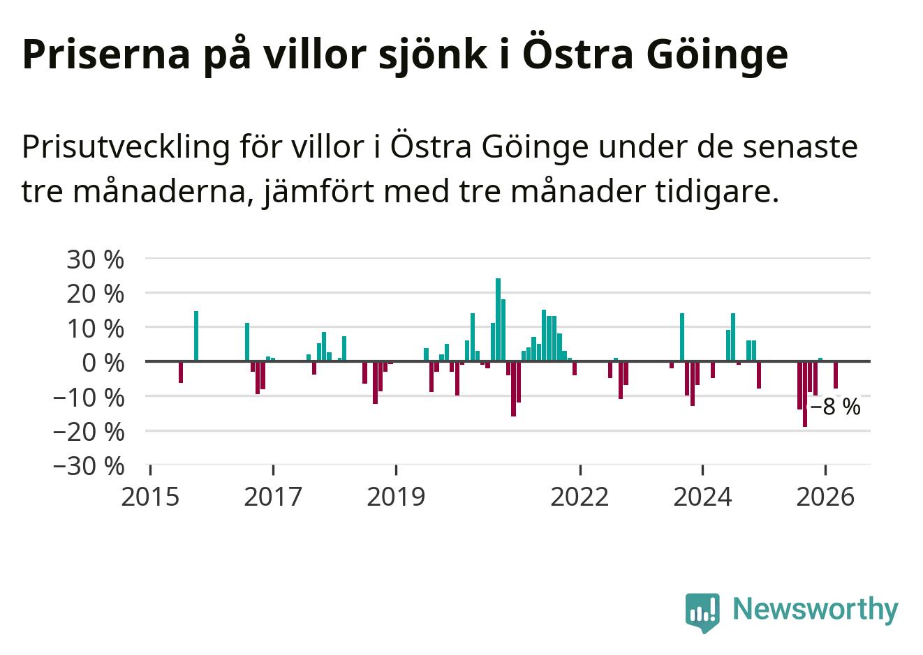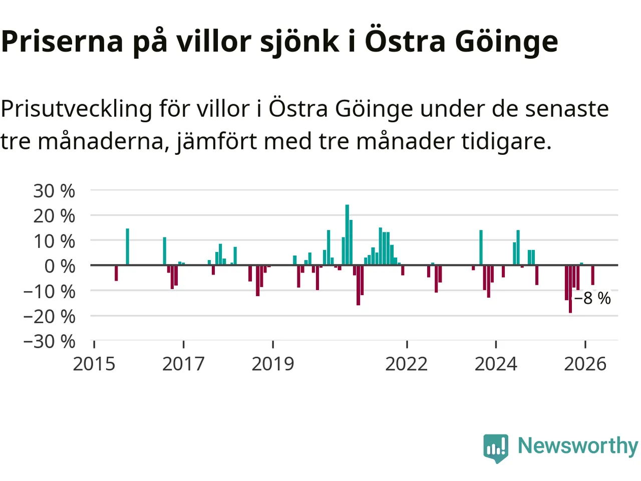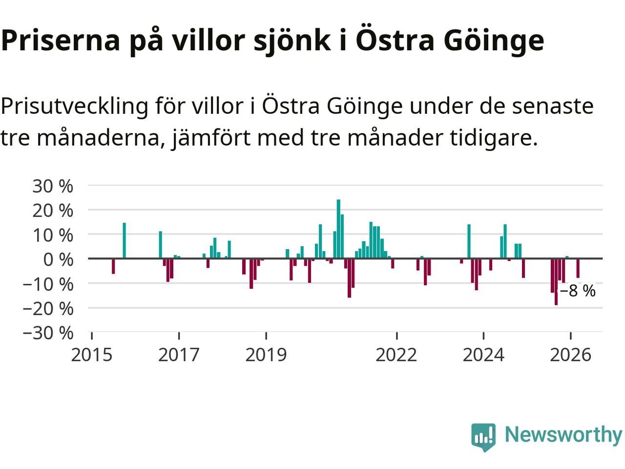 Statistiken visar även på en stor prisnedgång i Östra Göinge kommun. Medelpriset på försäljningarna av villor i kommunen var 8 procent lägre än för tre månader sedan. I hela Skåne däremot ligger villapriserna stilla.