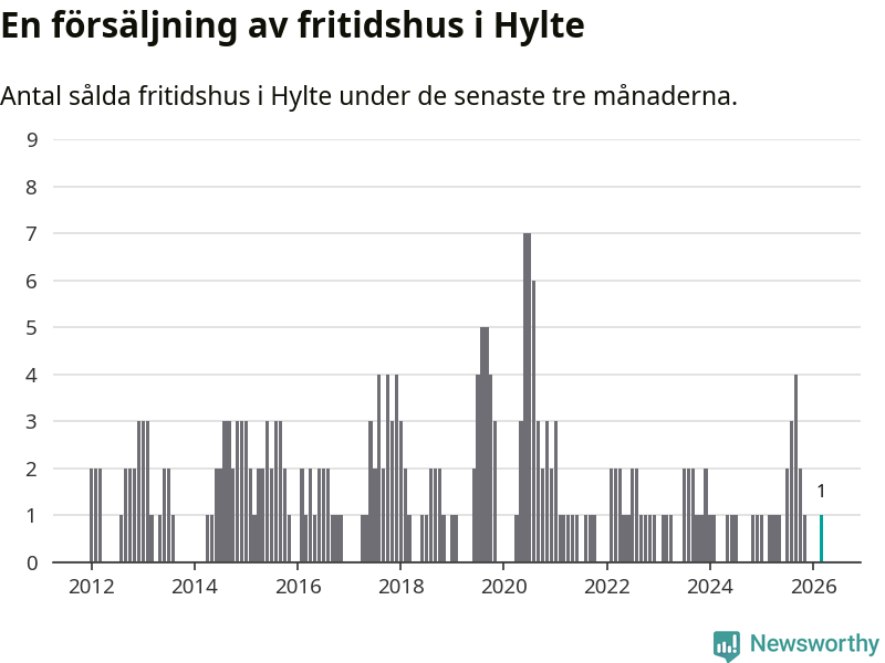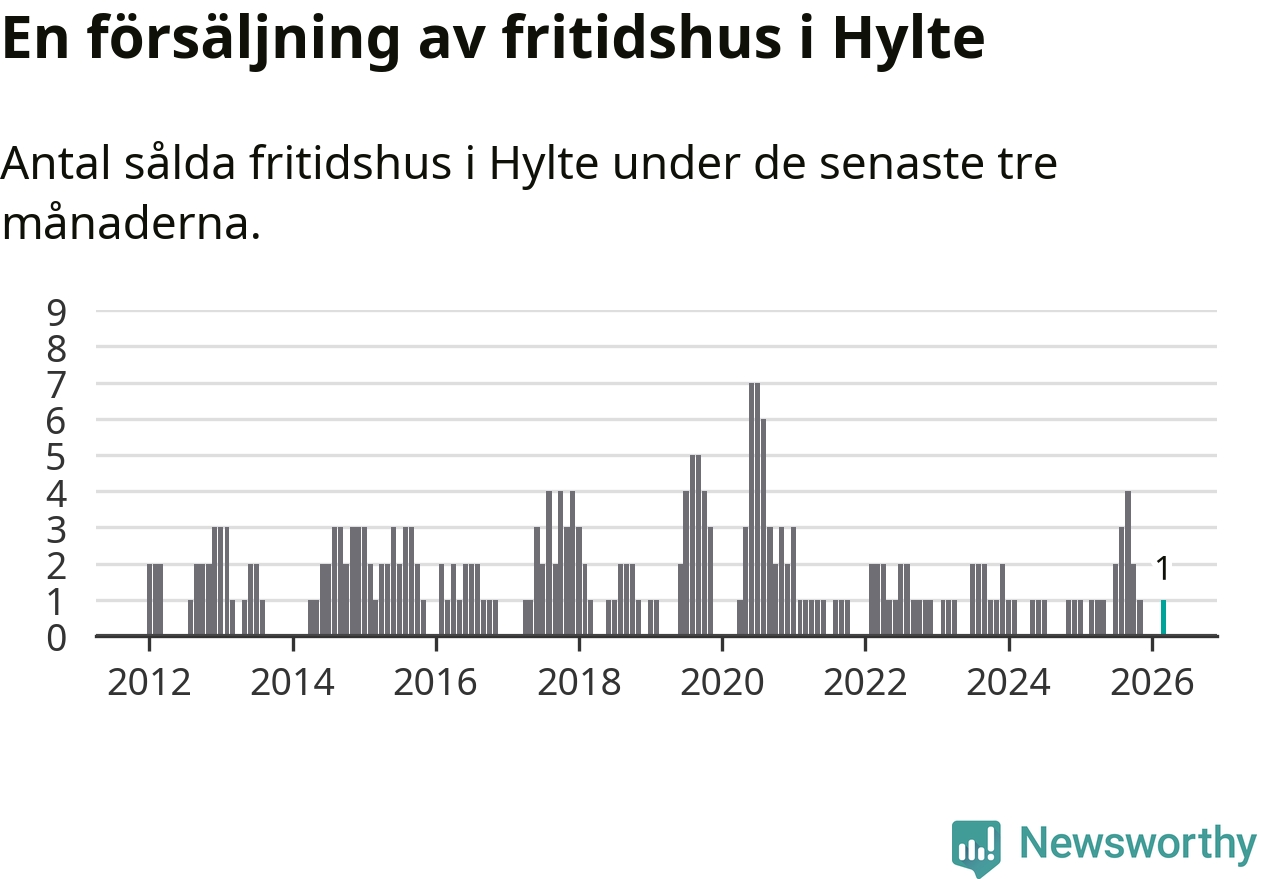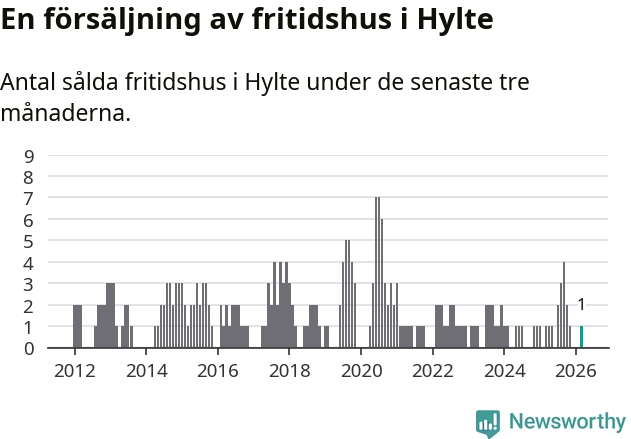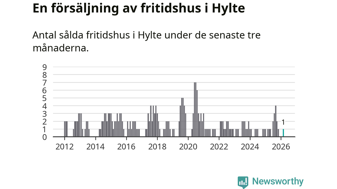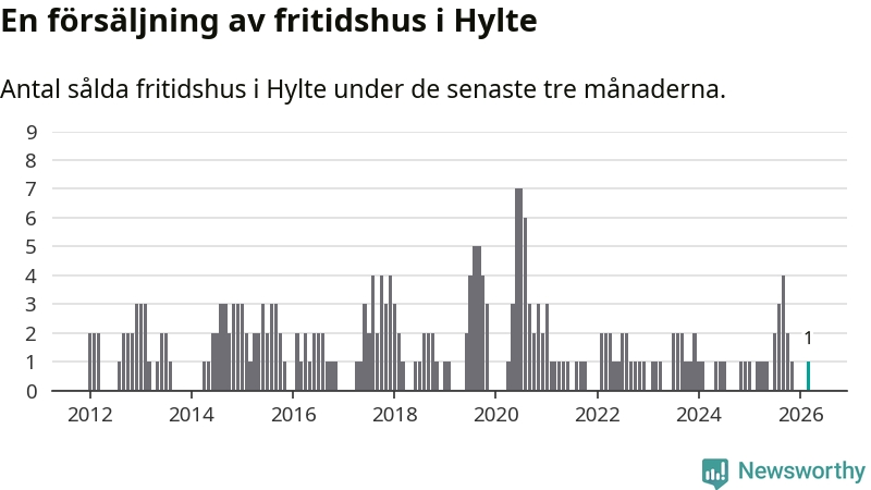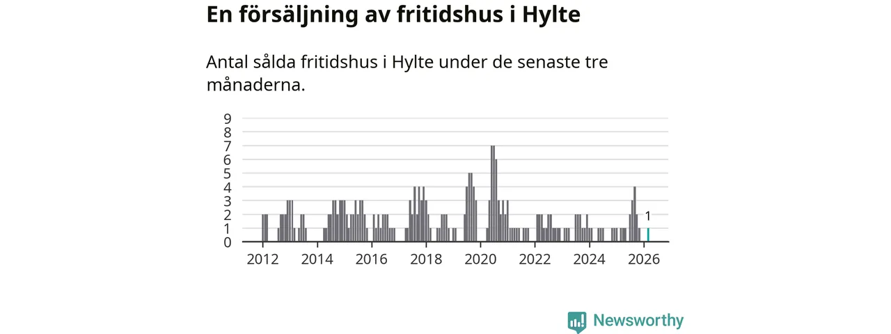 Mellan januari och mars gjordes sammanlagt en affär med fritidshus i Hylte kommun. Det är lika många affärer som vid motsvarande tid i fjol.