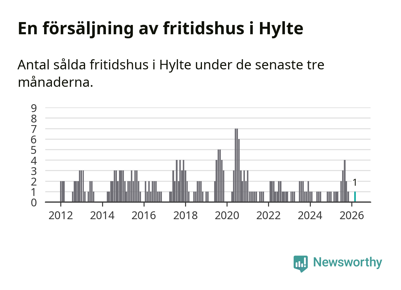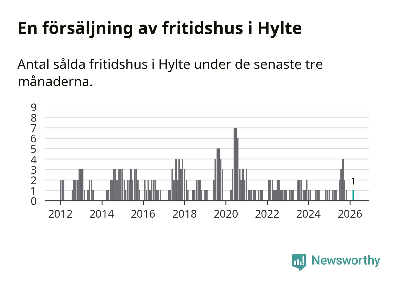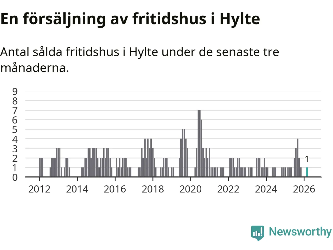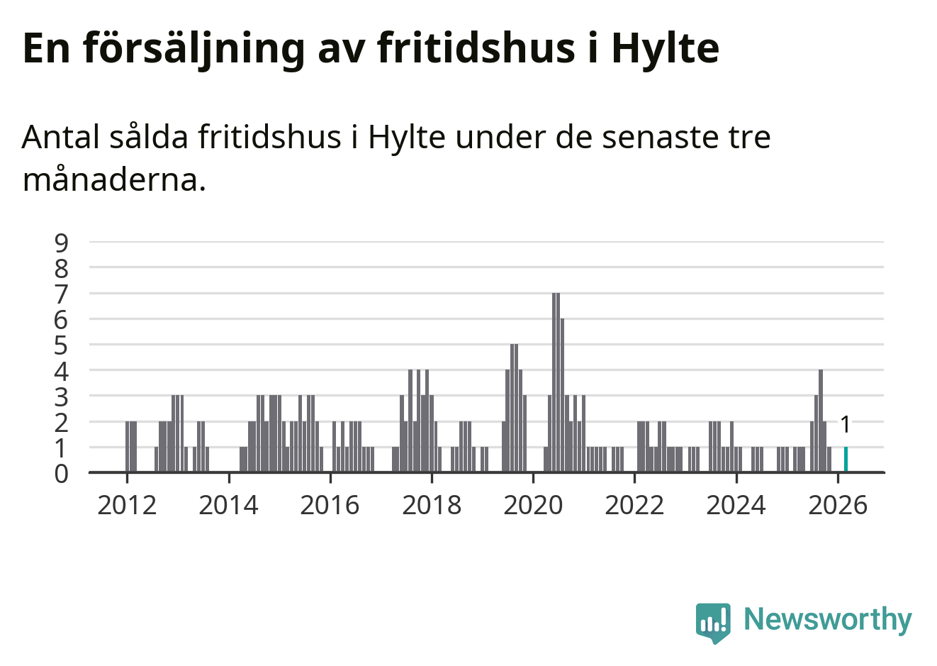 Mellan januari och mars gjordes sammanlagt en affär med fritidshus i Hylte kommun. Det är lika många affärer som vid motsvarande tid i fjol.