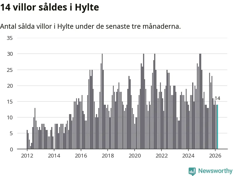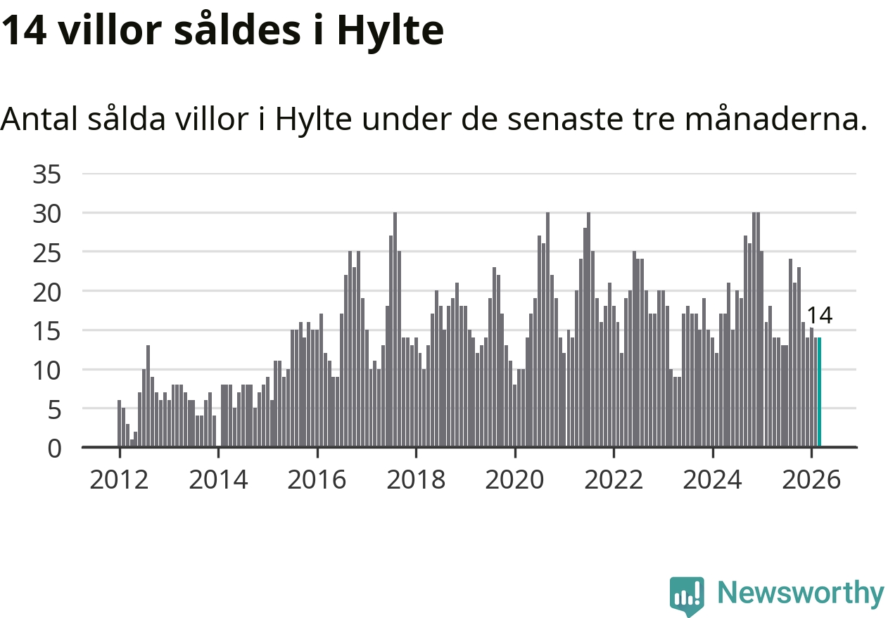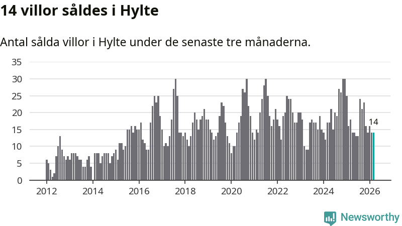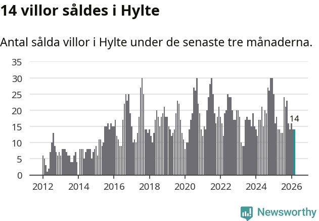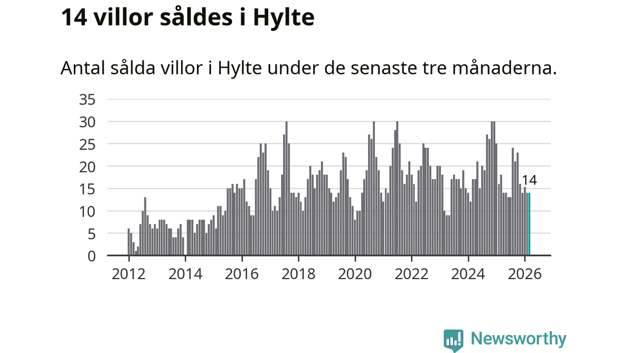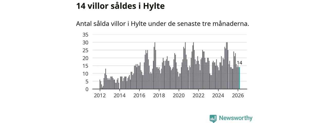 Mellan januari och mars gjordes sammanlagt 14 affärer med villor i Hylte kommun. Det kan jämföras med 18 vid motsvarande tid i fjol.