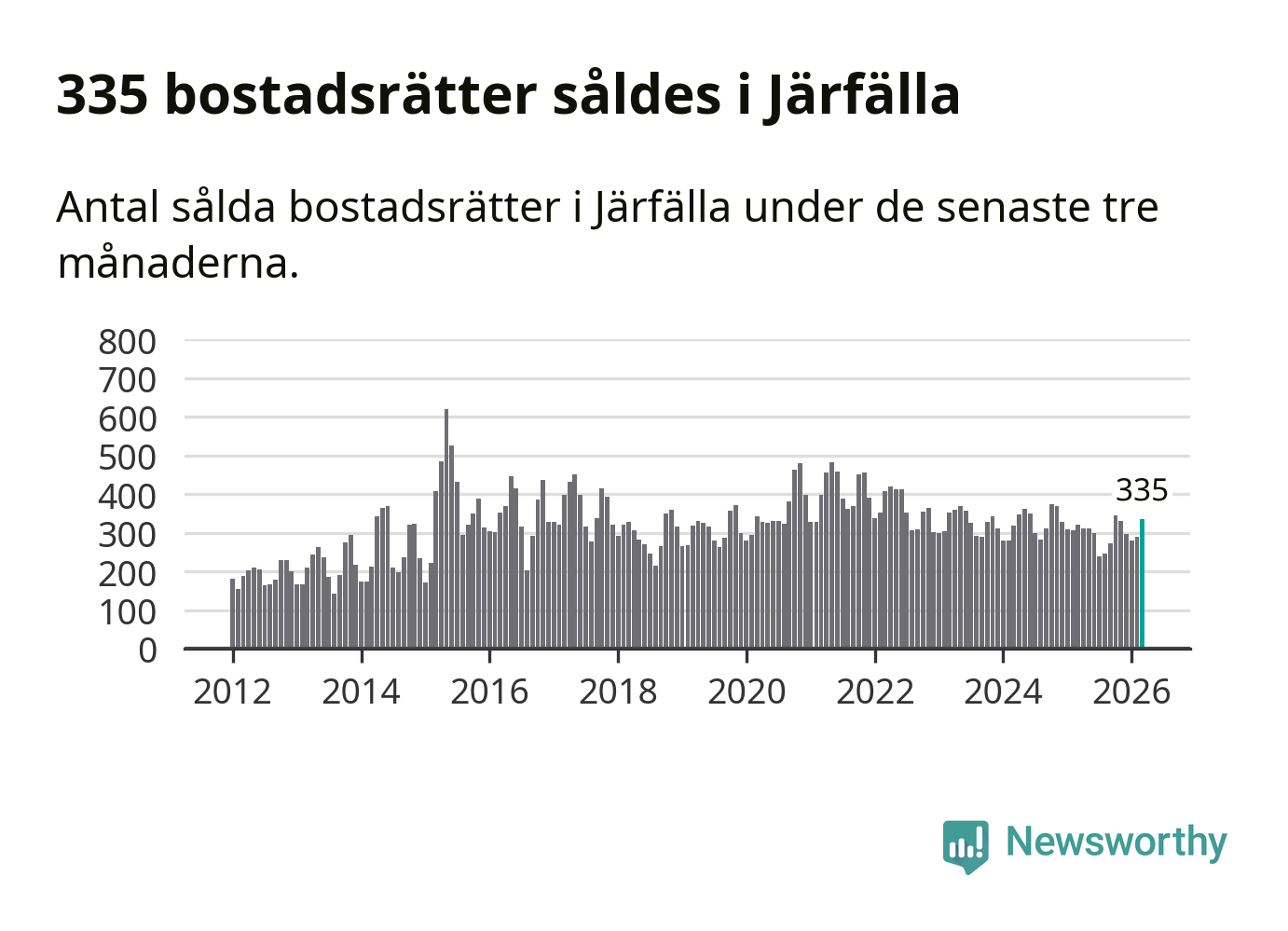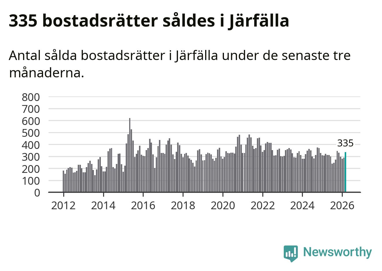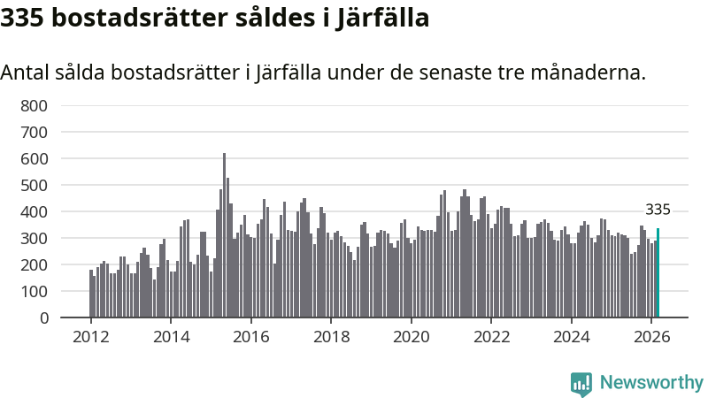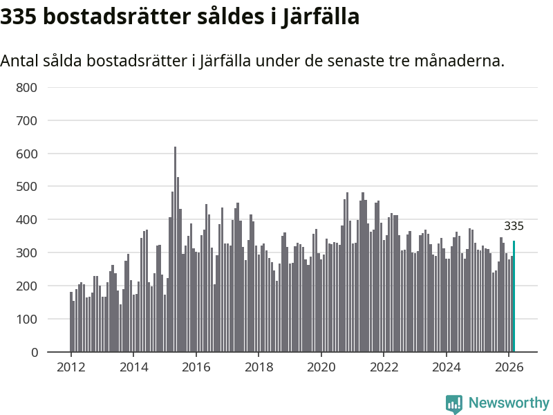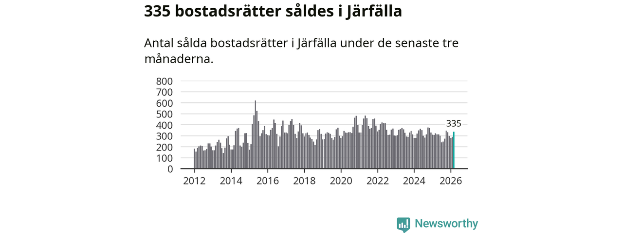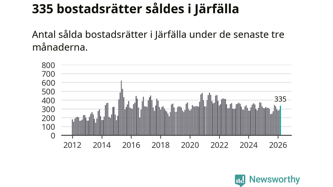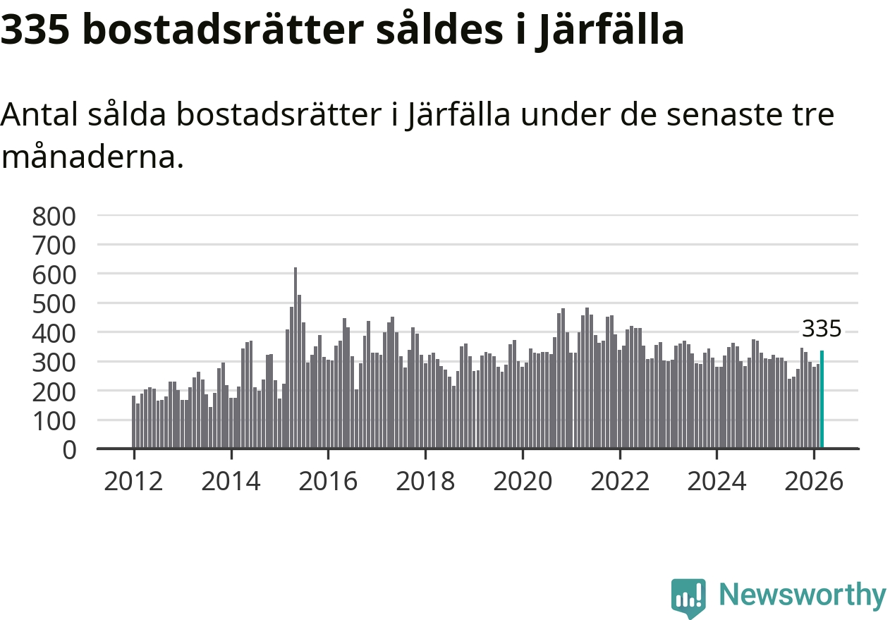 Sammanlagt såldes 335 bostadsrätter i Järfälla kommun mellan januari och mars till ett genomsnittligt pris på 2,4 miljoner kronor. I fjol gjordes 321 affärer vid den här tiden på året.