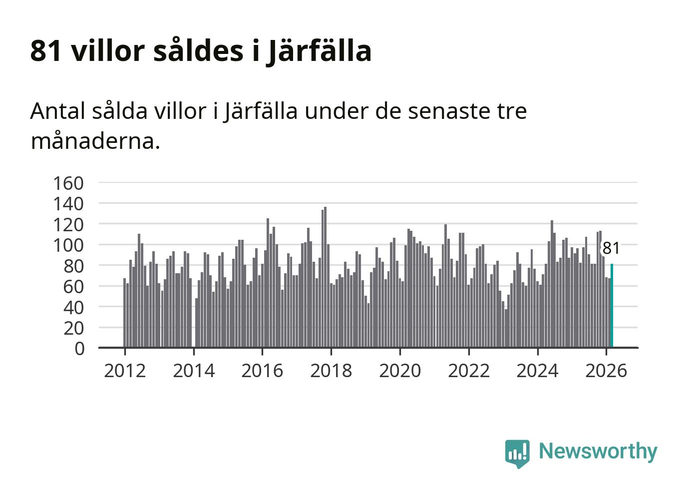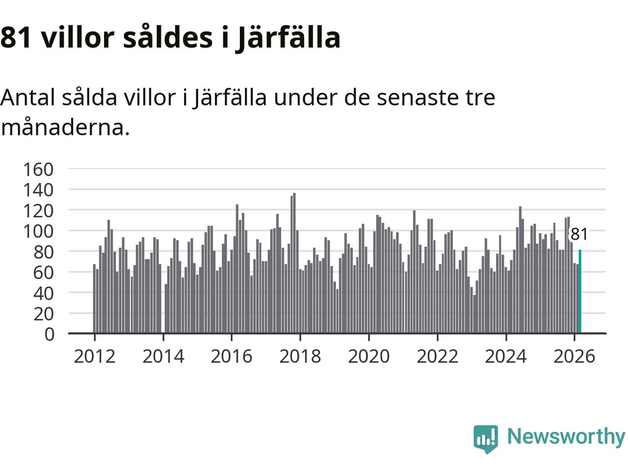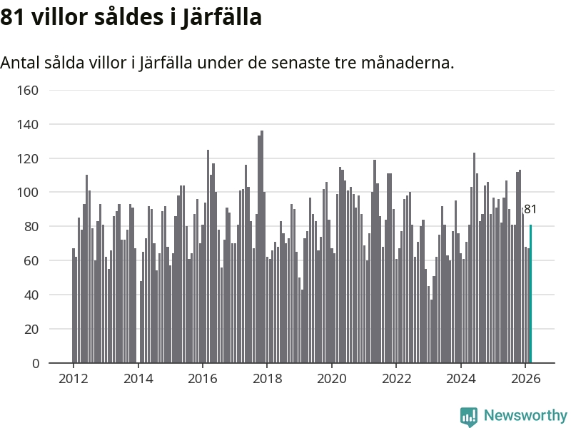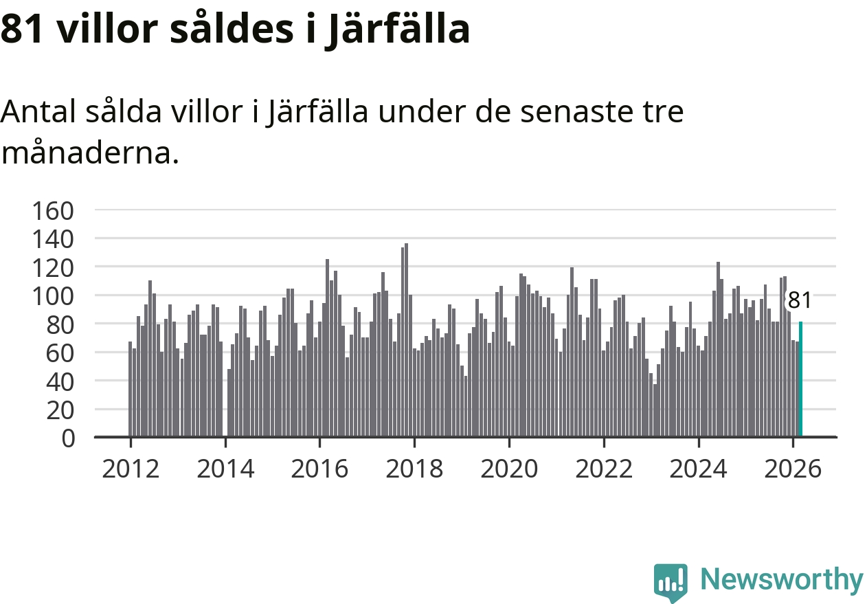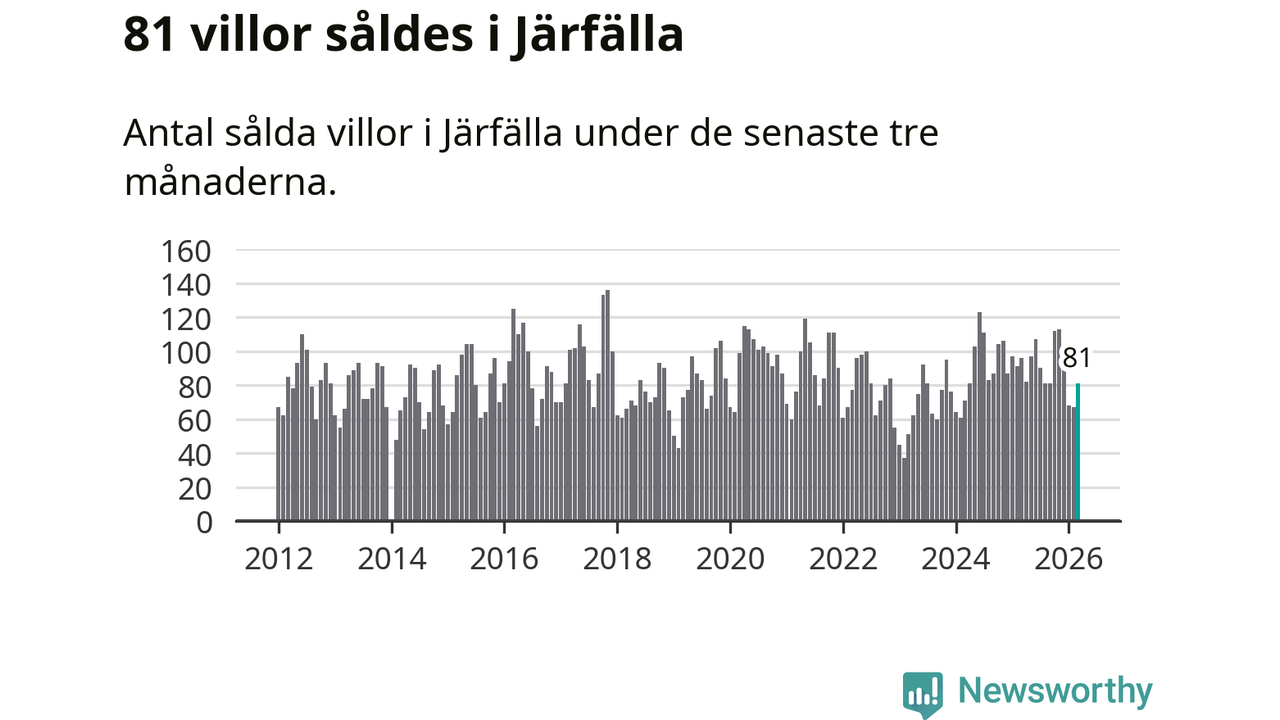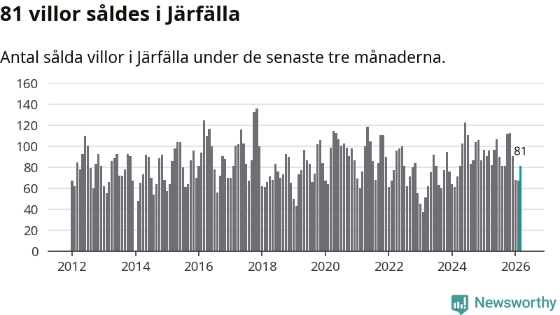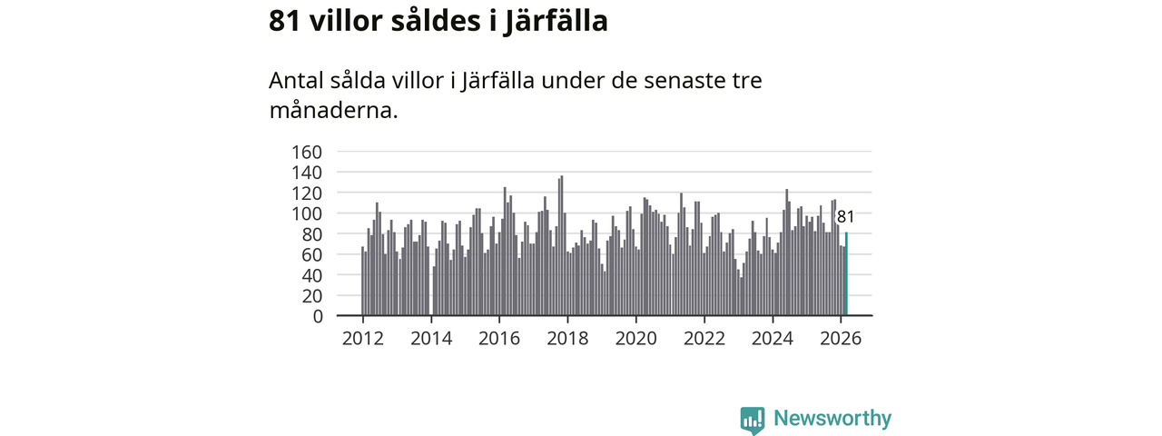 Sammanlagt såldes 81 villor i Järfälla kommun mellan januari och mars till ett genomsnittligt pris på 5,3 miljoner kronor. I fjol gjordes 96 affärer vid den här tiden på året.