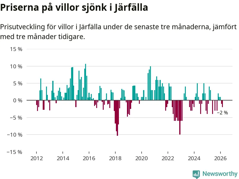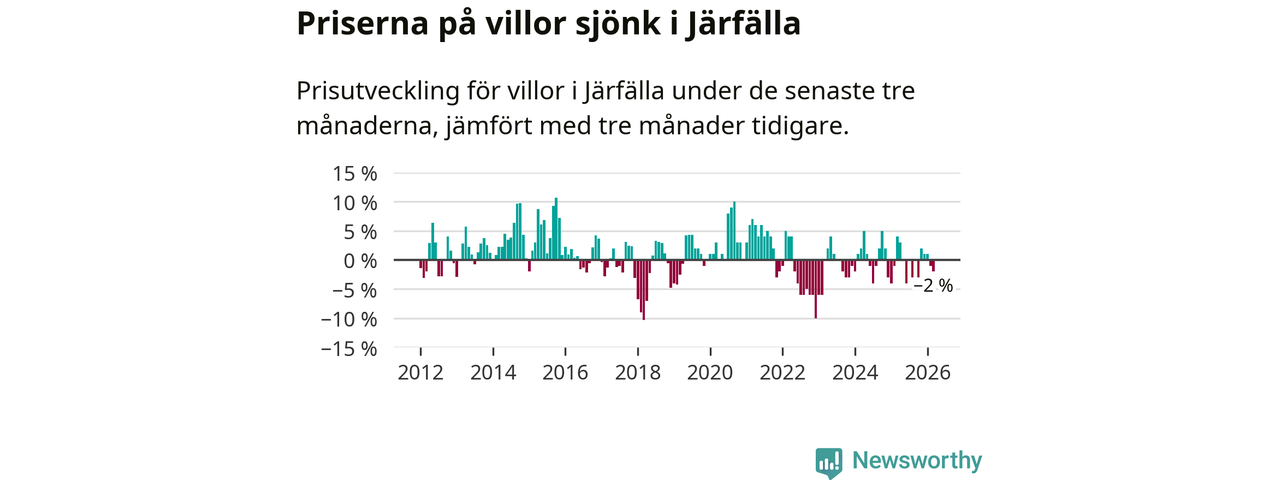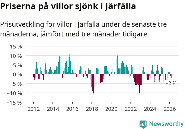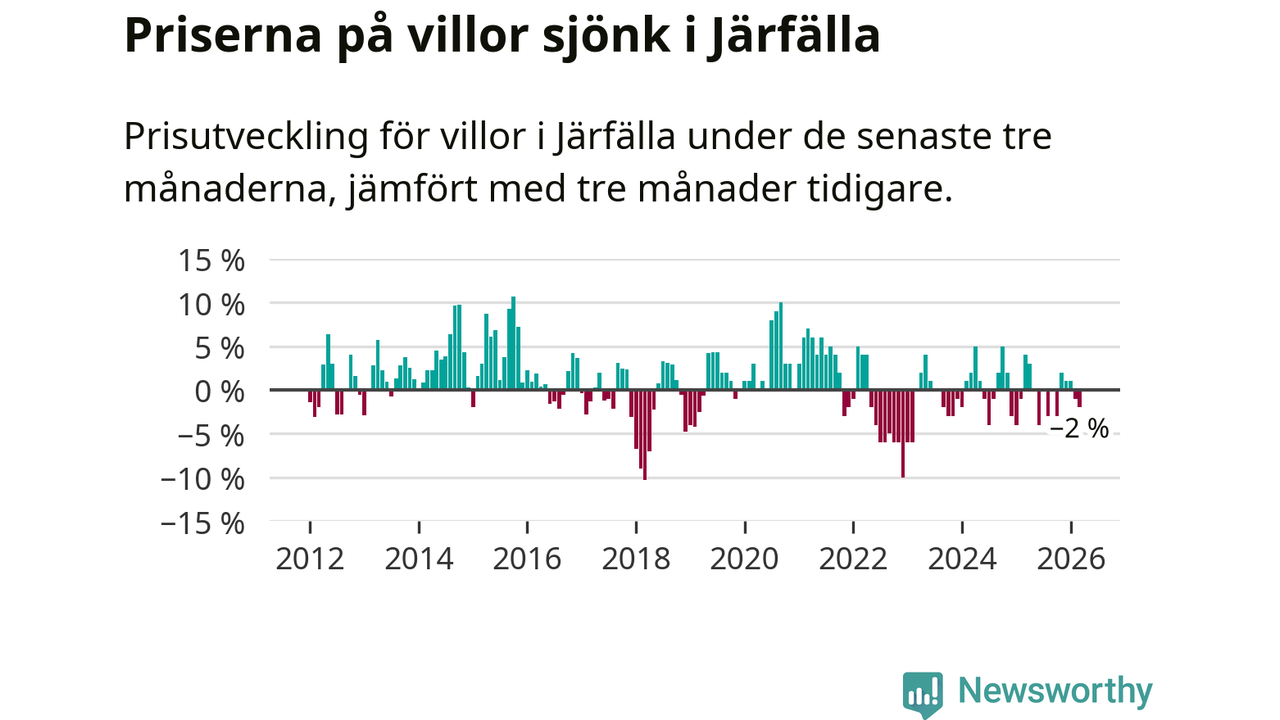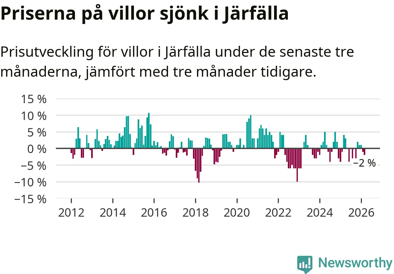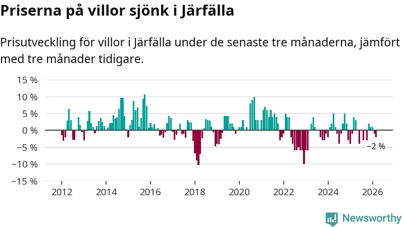 Villapriserna har gått ner i Järfälla kommun. Medelpriset på försäljningarna under de senaste tre månaderna visar på en nedgång med 2 procent.