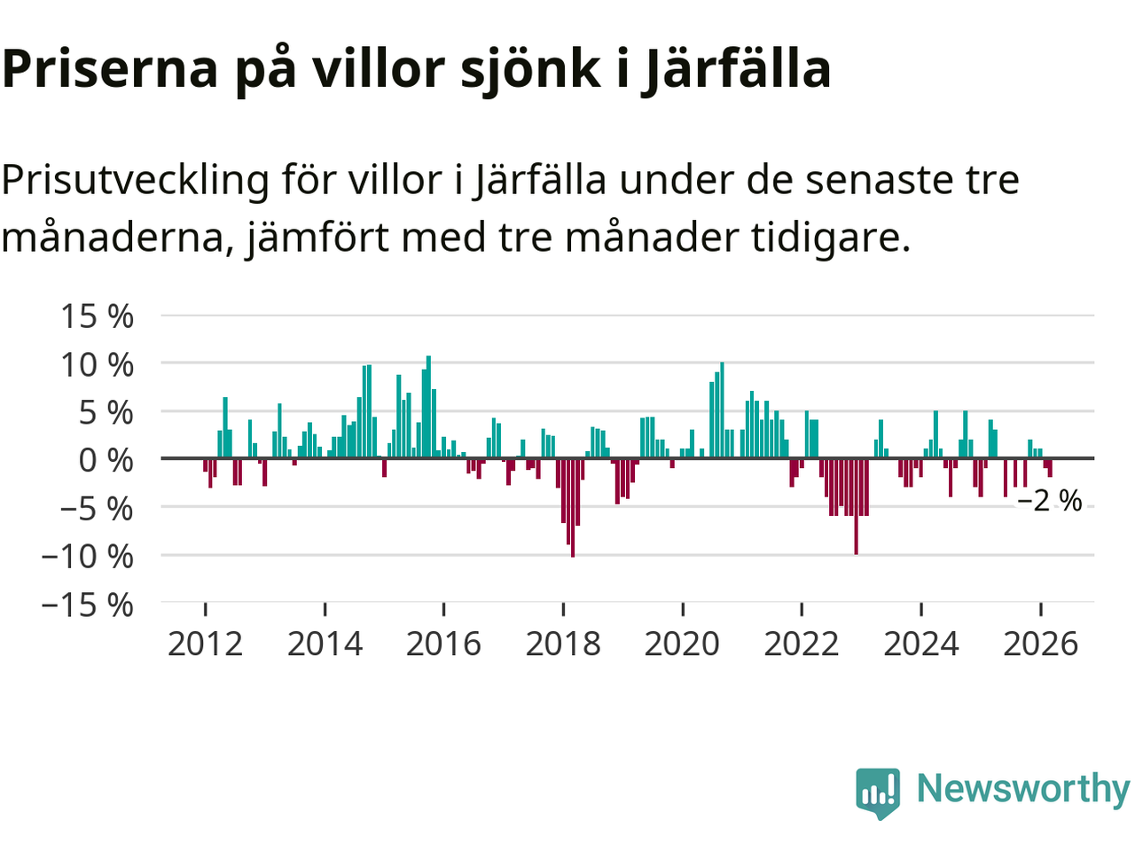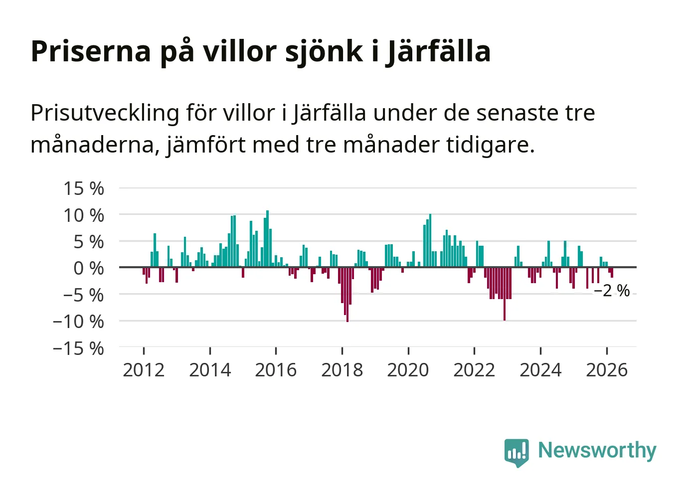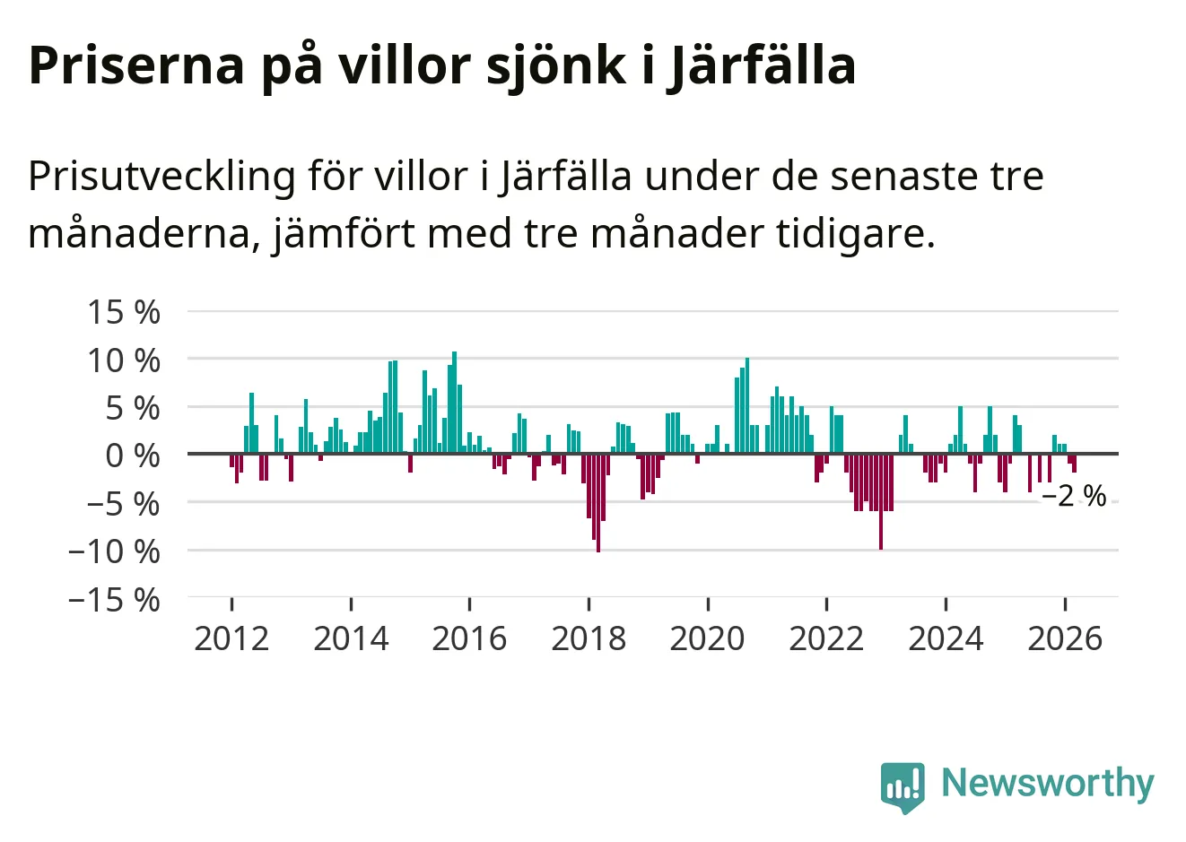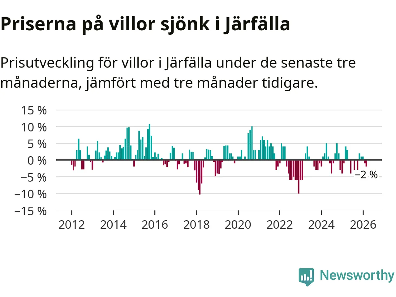 Villapriserna har gått ner i Järfälla kommun. Medelpriset på försäljningarna under de senaste tre månaderna visar på en nedgång med 2 procent.