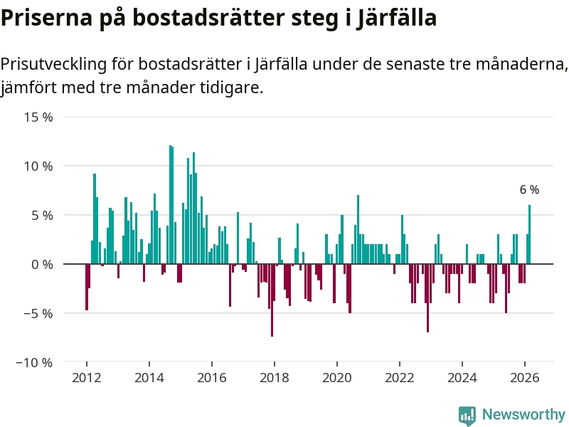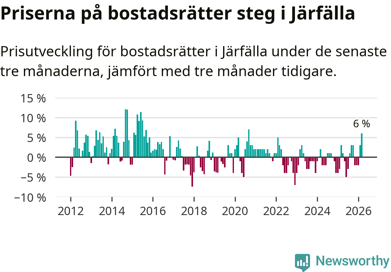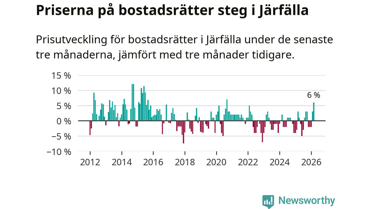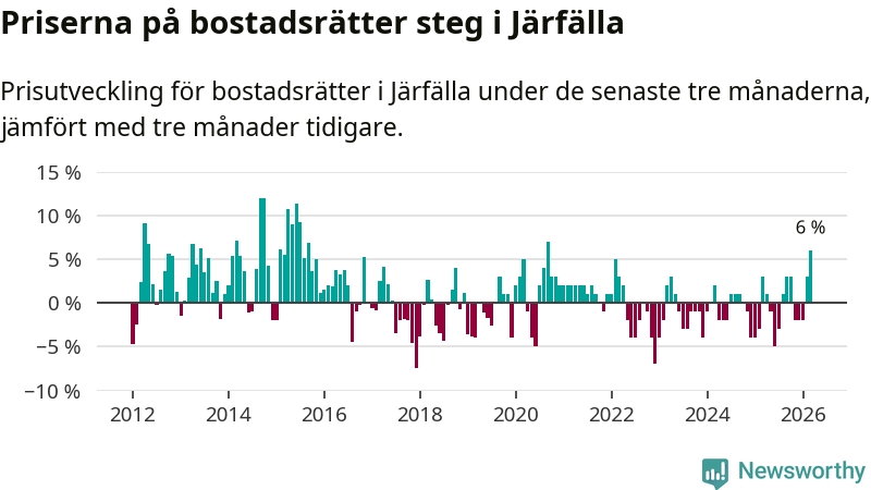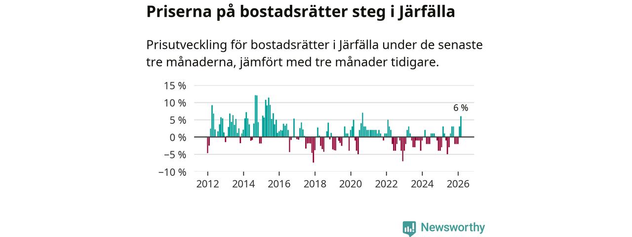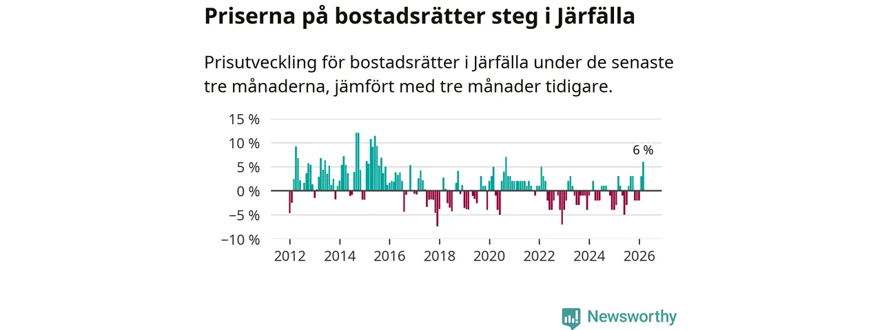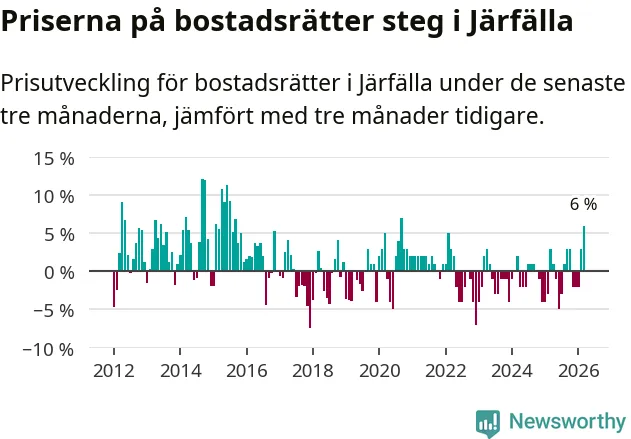 Priserna på bostadsrätter steg med sex procent i Järfälla kommun under de senaste tre månaderna. Det är den starkaste prisutvecklingen sedan 2020.