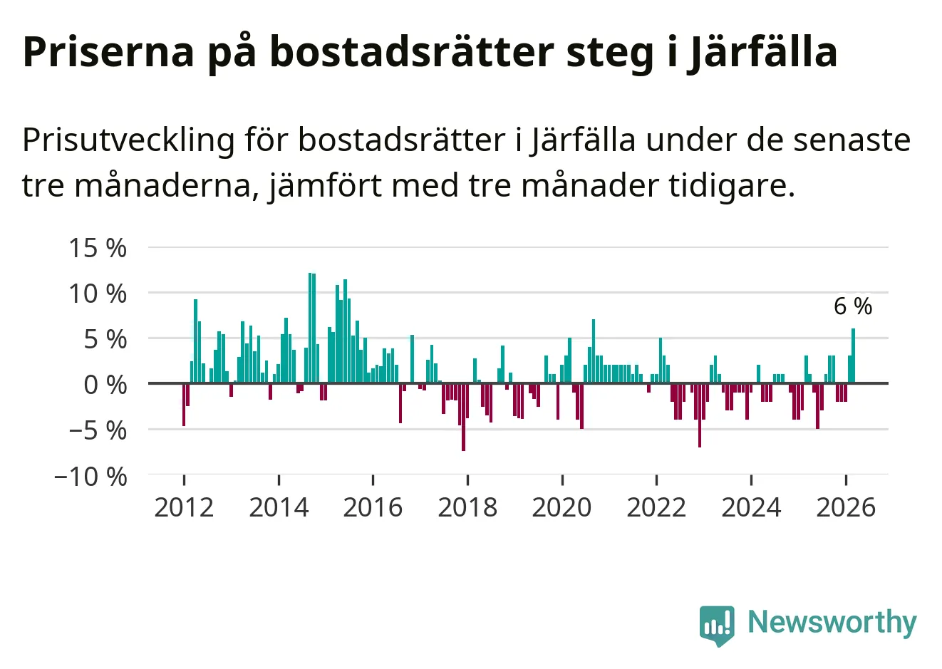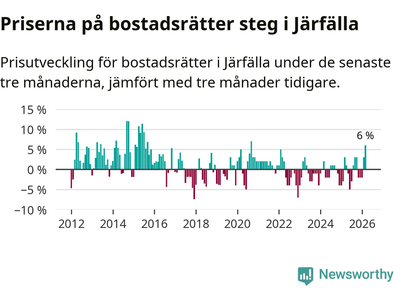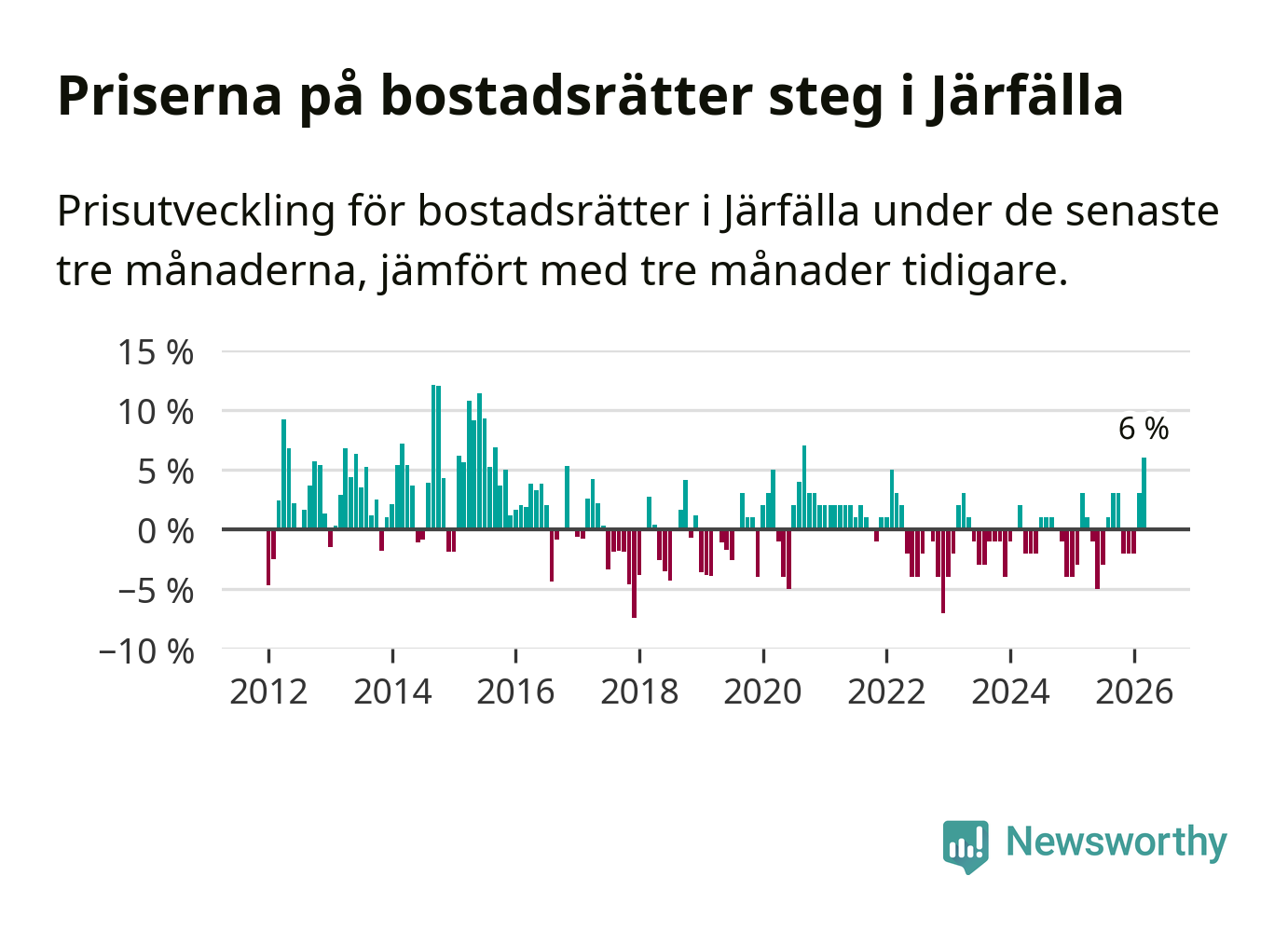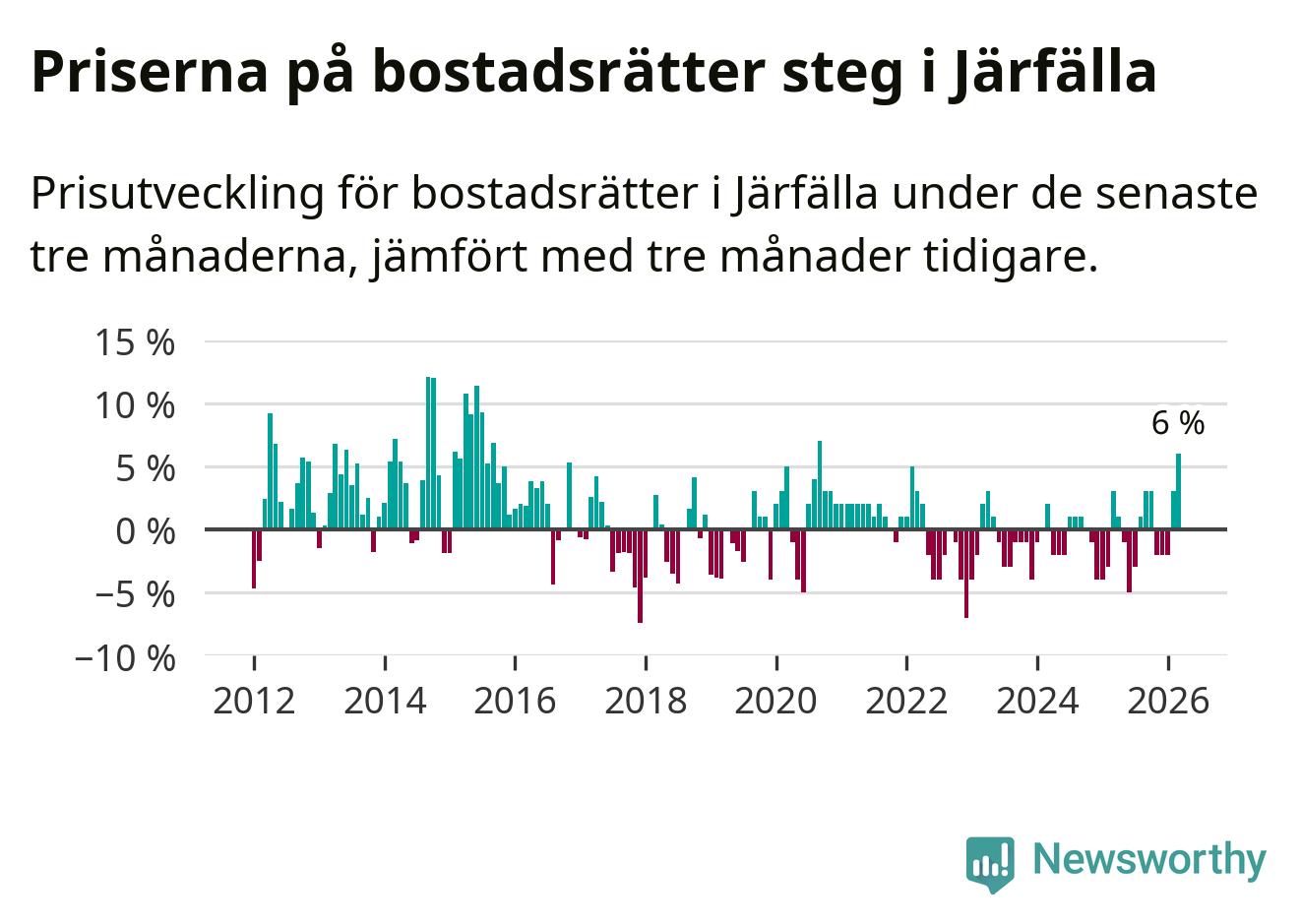 Priserna på bostadsrätter steg med sex procent i Järfälla kommun under de senaste tre månaderna. Det är den starkaste prisutvecklingen sedan 2020.