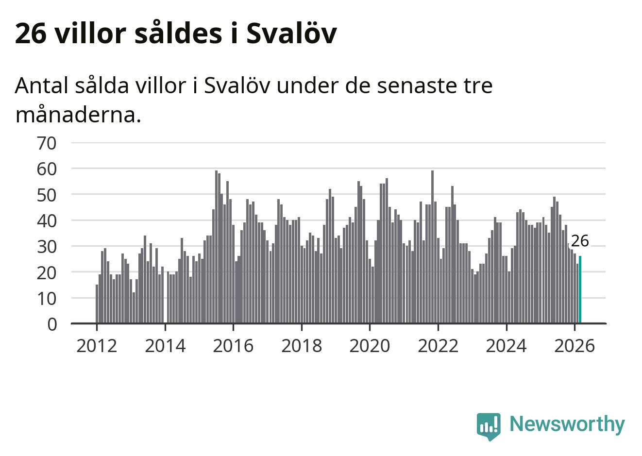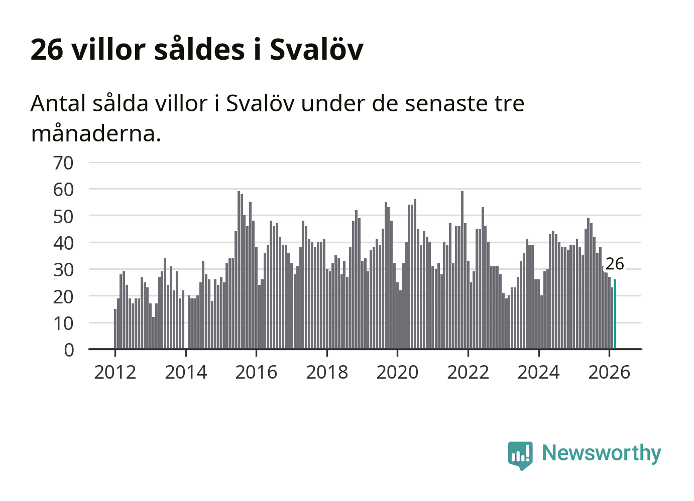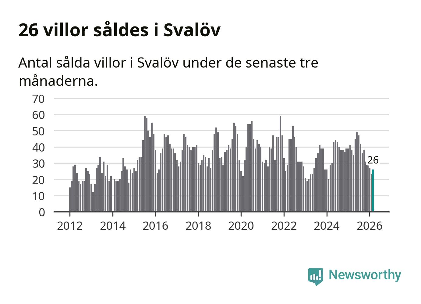 Sammanlagt såldes 26 villor i Svalövs kommun mellan januari och mars till ett genomsnittligt pris på 2,1 miljoner kronor. I fjol gjordes 38 affärer vid den här tiden på året.
