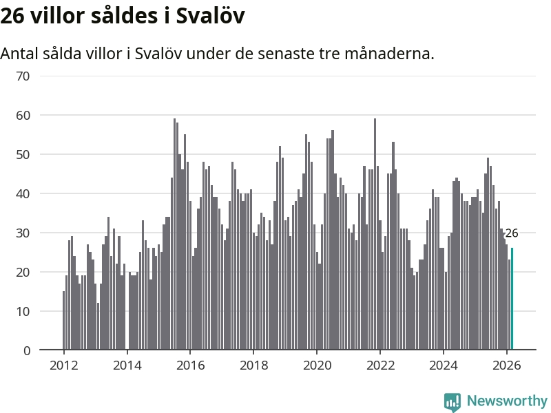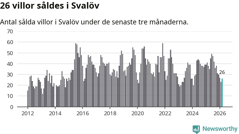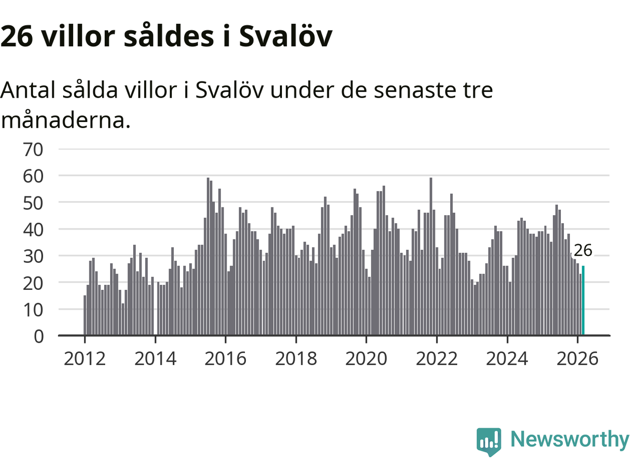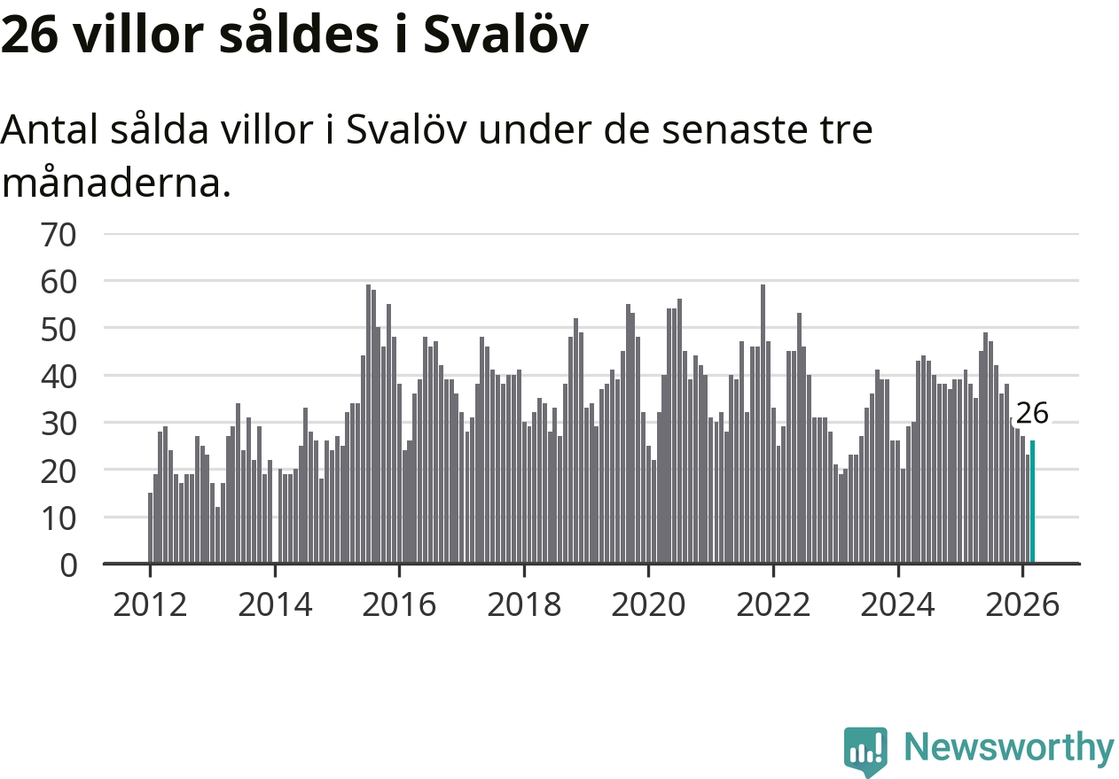Sammanlagt såldes 26 villor i Svalövs kommun mellan januari och mars till ett genomsnittligt pris på 2,1 miljoner kronor. I fjol gjordes 38 affärer vid den här tiden på året.