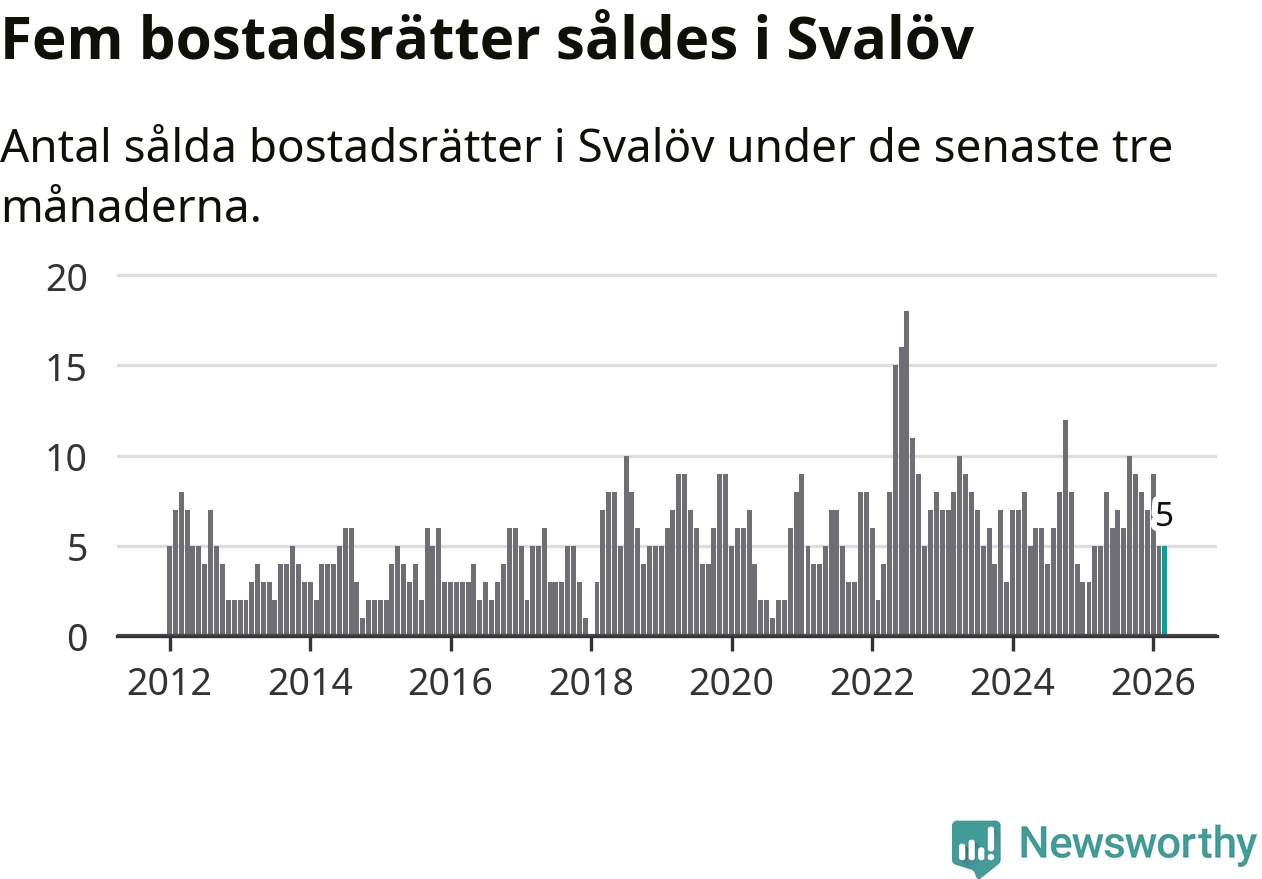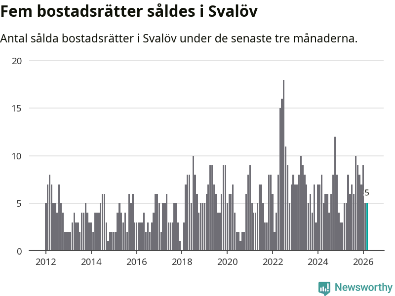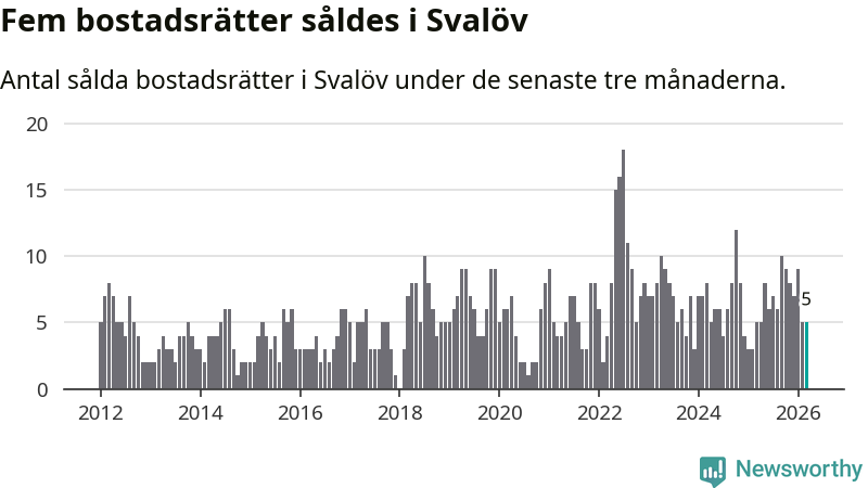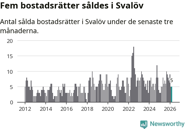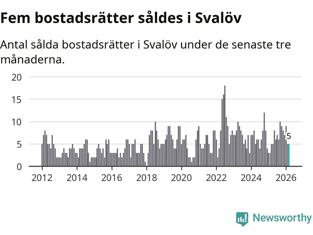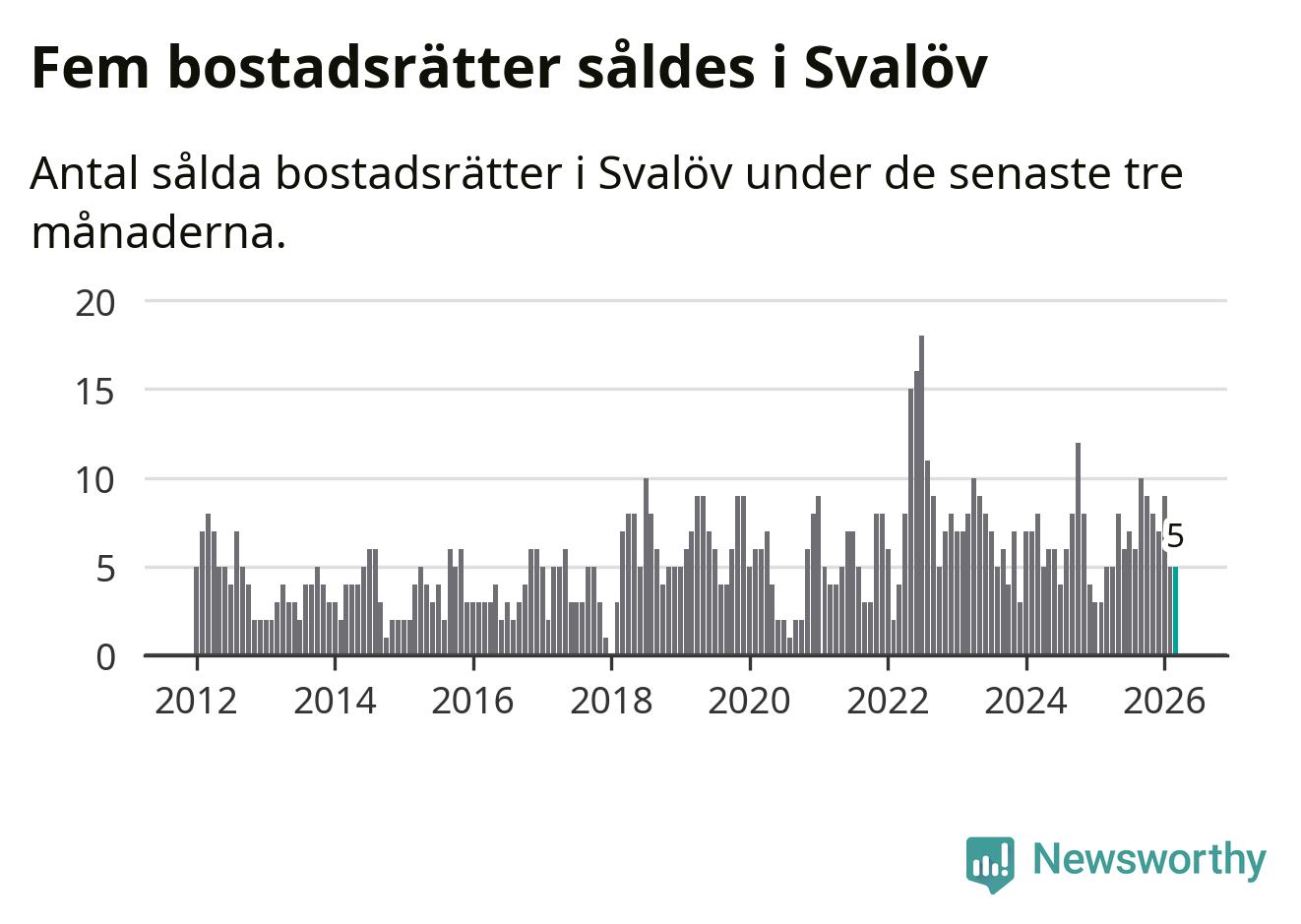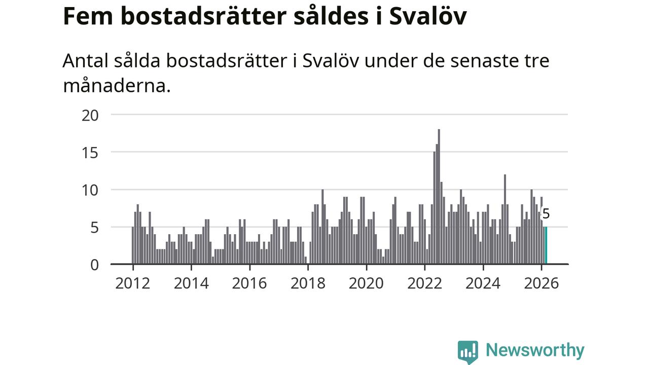 Mellan januari och mars gjordes sammanlagt fem affärer med bostadsrätter i Svalövs kommun. Det är lika många affärer som vid motsvarande tid i fjol.