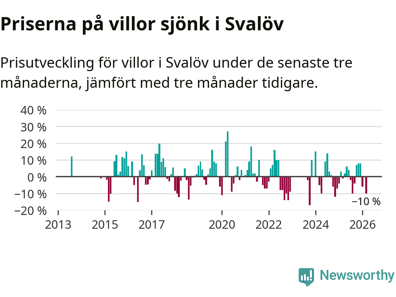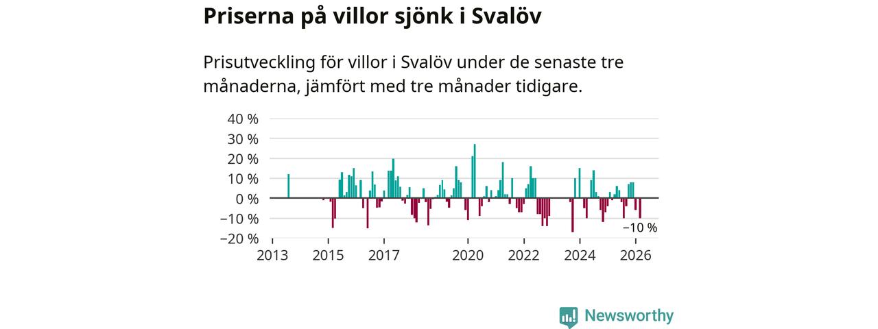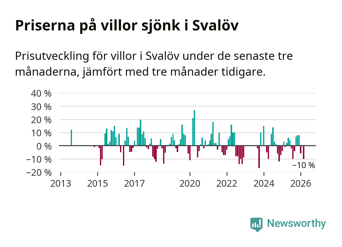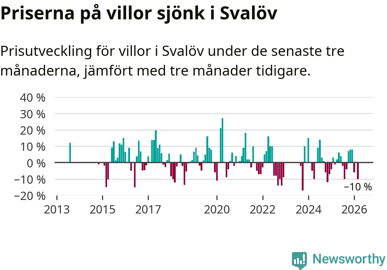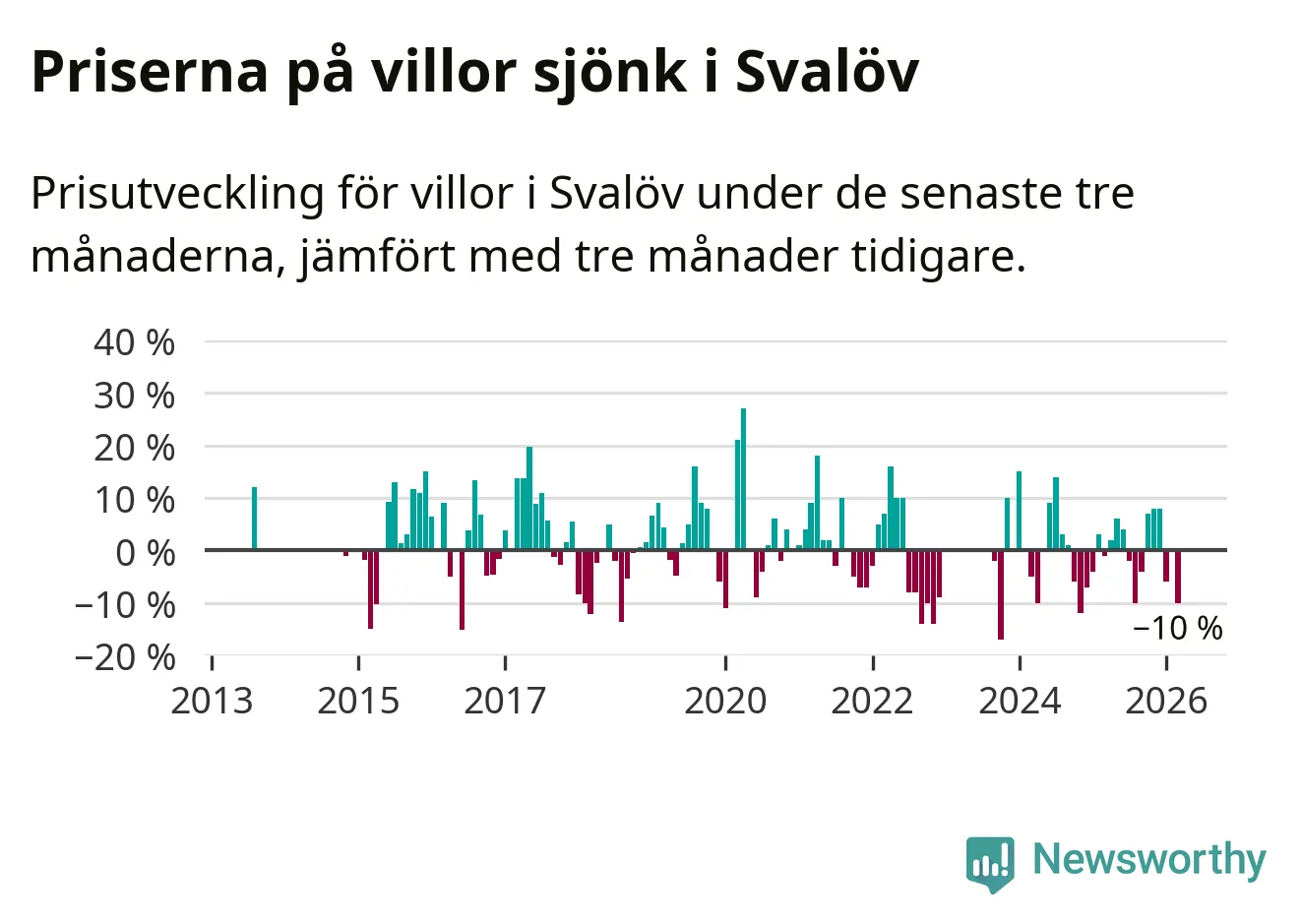 Villapriserna har gått ner i Svalövs kommun. Medelpriset på försäljningarna under de senaste tre månaderna visar på en nedgång med 10 procent.
