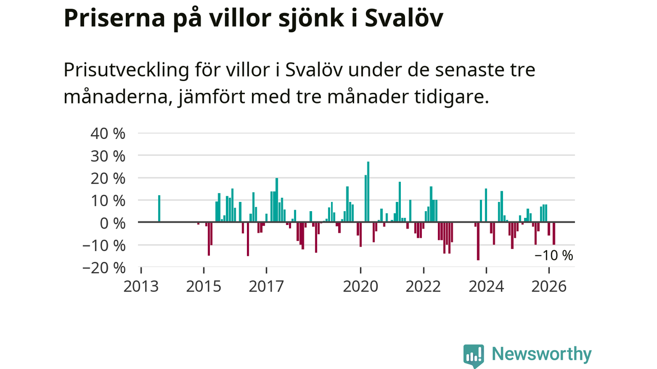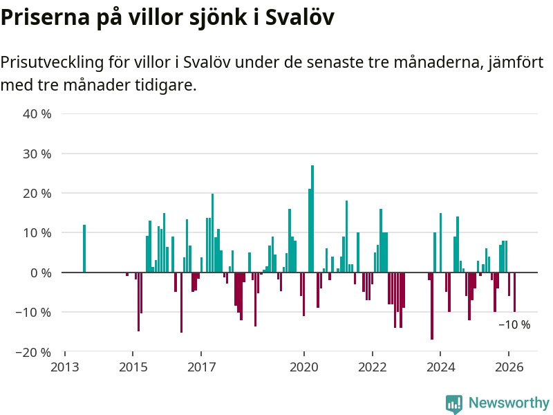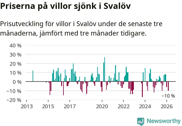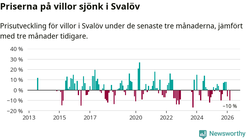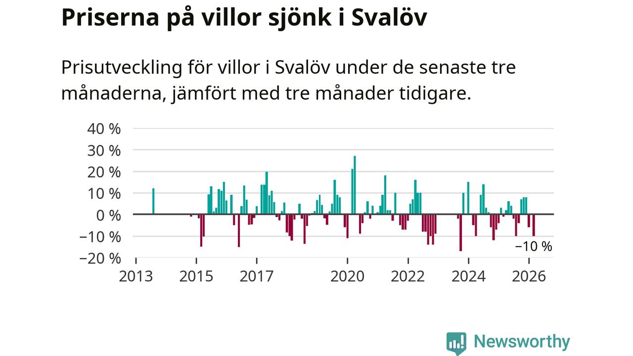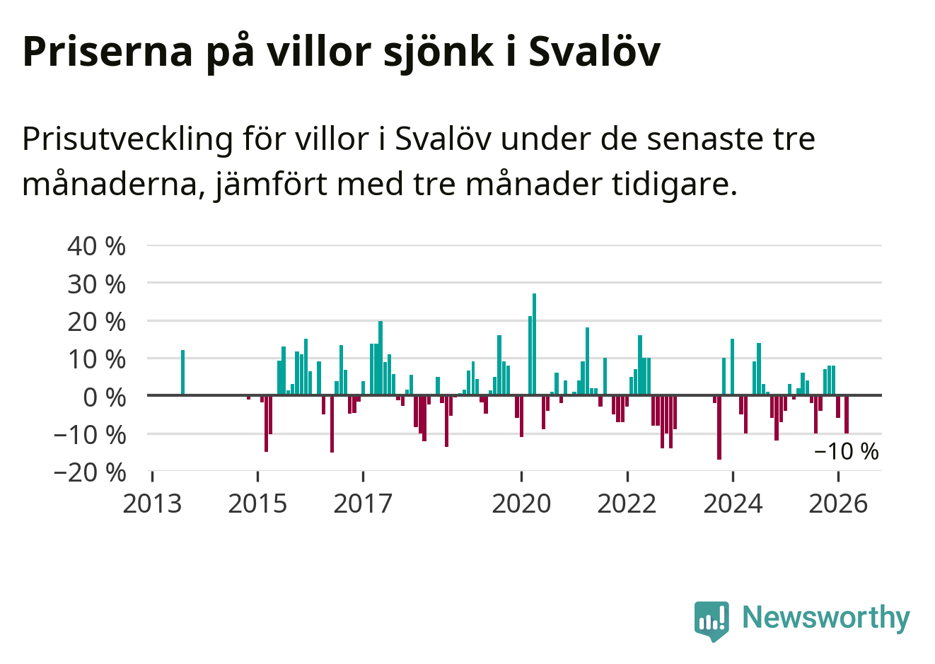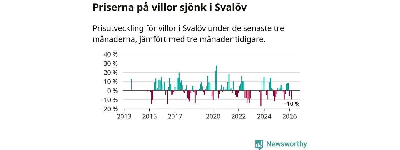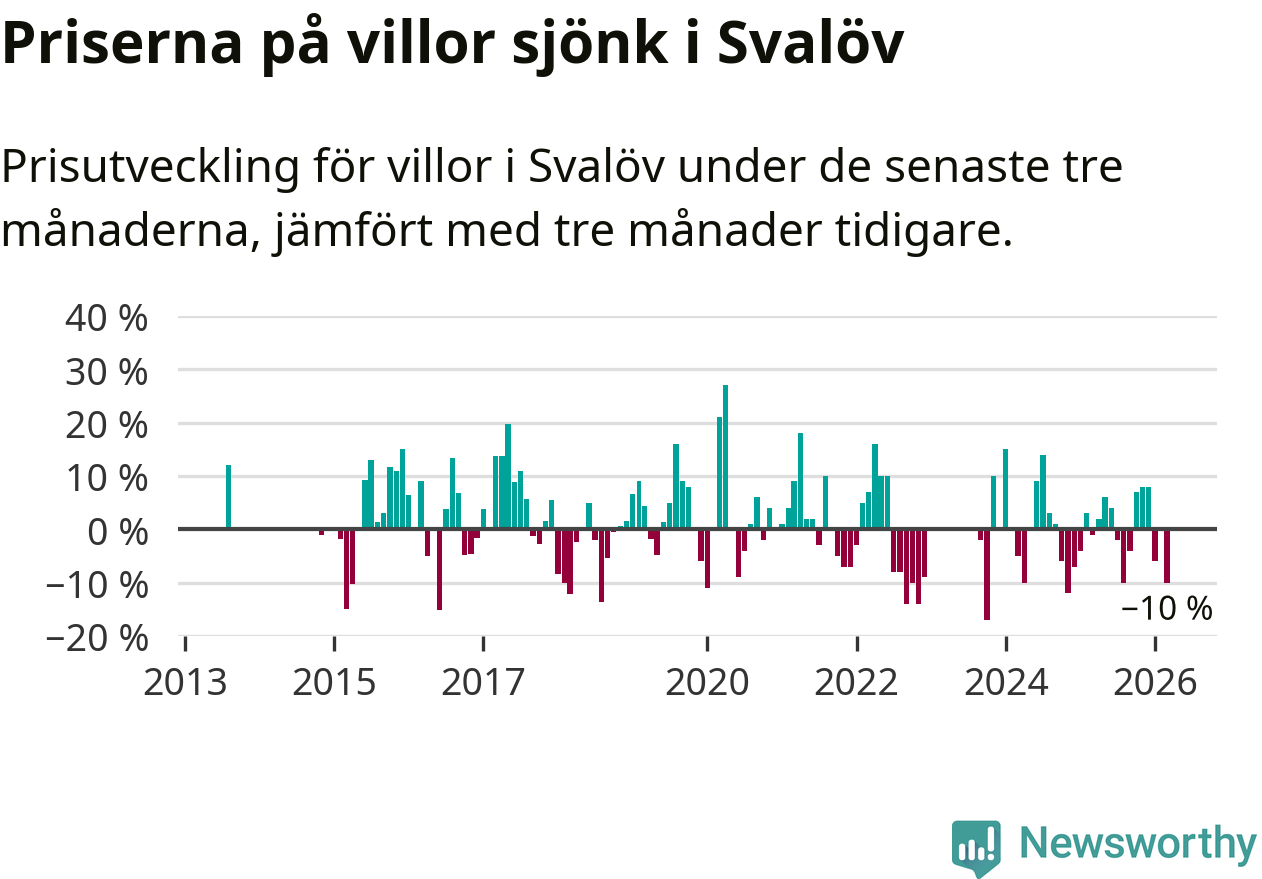 Villapriserna har gått ner i Svalövs kommun. Medelpriset på försäljningarna under de senaste tre månaderna visar på en nedgång med 10 procent.